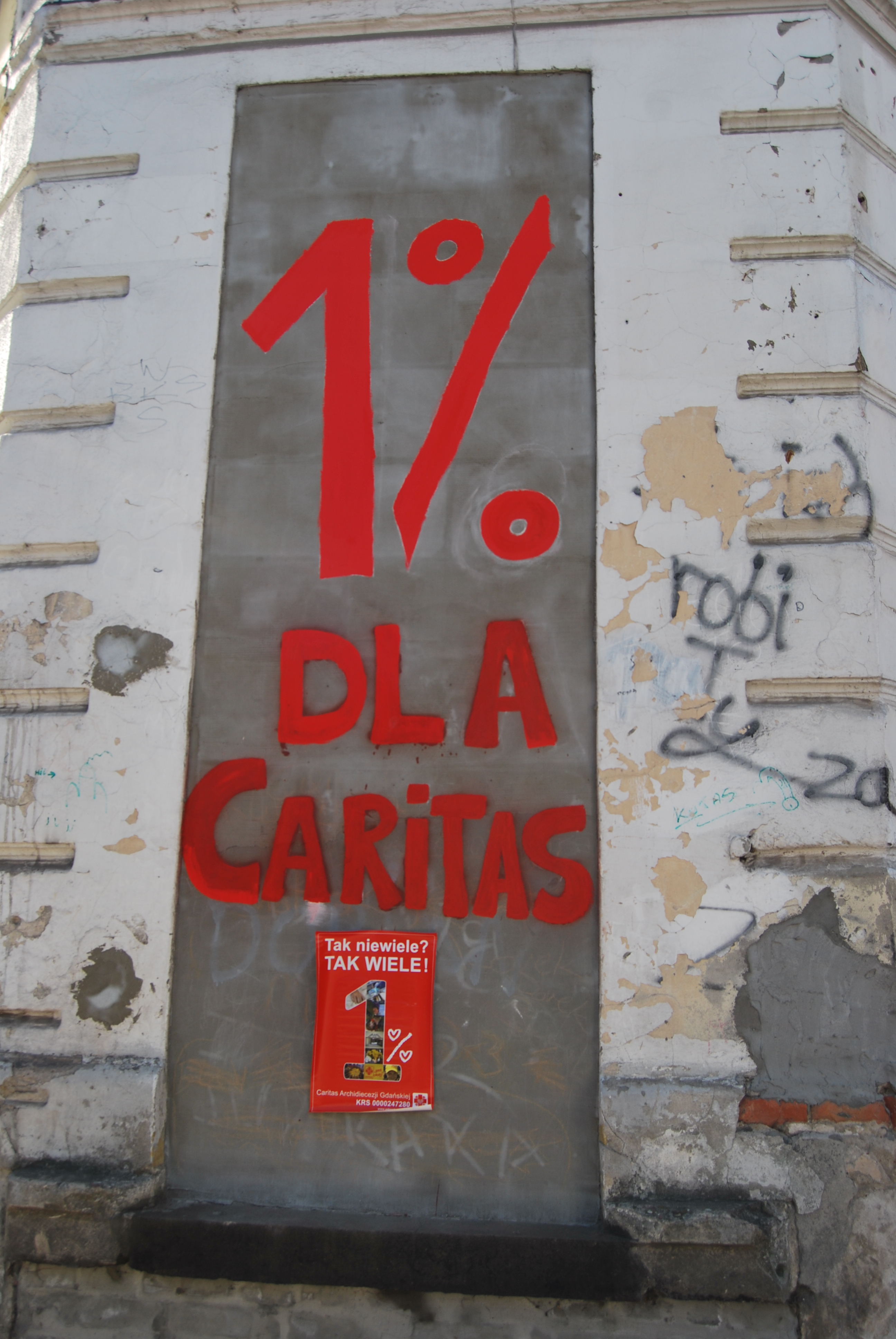 W ramach promowania działalności Caritas i „akcji 1%”, na jednej ze ścian naszego budynku, zamieściliśmy „symboliczną, czerwoną jedynkę”, aby zachęcić lokalną społeczność do wsparcia naszej instytucji.