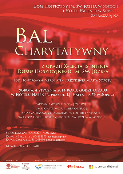 Kierujemy do Państwa zaproszenie na niezwykły bal w Hotelu Haffner w Sopocie. Zapraszamy na sobotni wieczór karnawałowy 4 stycznia 2014 na Bal Charytatywny z okazji X- lecia istnienia Domu Hospicyjnego im. św. Józefa, Caritas Archidiecezji Gdańskiej w Sopocie.