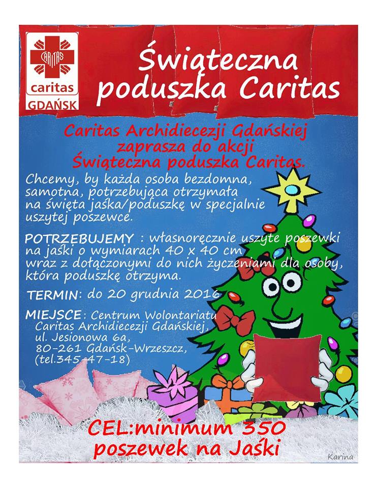 Pani Dorota, opiekunka Szkolnego Koła Caritas z Gimnazjum nr 17 w Gdańsku, uszyła pierwszą poszewkę na naszą świąteczną akcję „350 poduszek pod choinkę”…. no to teraz czekamy jeszcze na 349 (i więcej!) poszewek! 🙂
