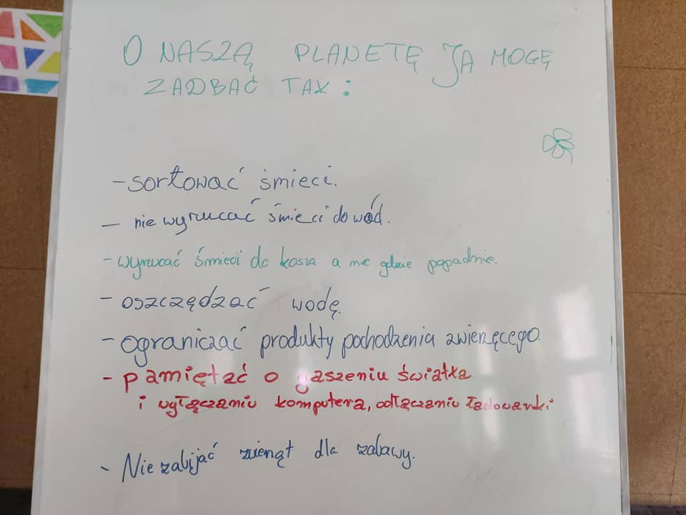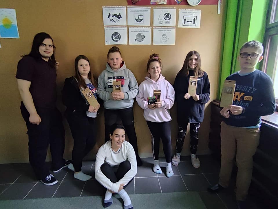 Jako zadanie domowe mogły zrobić projekt ekologiczny na dowolny temat. Każdy, kto zrobił projektu, otrzymał słomki metalowe wielorazowego użytku. Zwycięzcą została Julia, która uformowała karmnik dla królika. Doceniliśmy i pozostałych projektów. Na przykład Oliwia, Amelka i Wiktor sprzątali na dworze, a Ksawier nakręciła filmik instruktażowy.