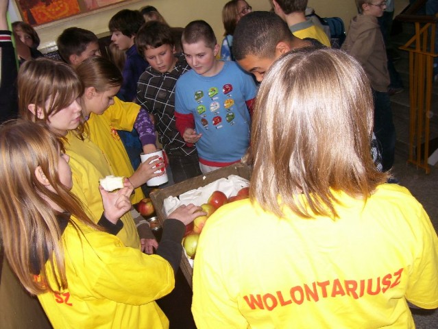 W czwartek 20 listopada 2008 na dwóch dużych przerwach wolontariusze sprzedawali smaczne i pachnące jabłuszka po 1 zł. Zbliżają się Święta Bożego Narodzenia i pieniądze uzyskane ze sprzedaży pomogą w przygotowaniu paczek świątecznych dla naszych koleżanek i kolegów. Akcja miała takie powodzenie, że trzy skrzynki z jabłkami opróżniły się w ekspresowym tempie. Do zakupu jabłek zachęcały wymyślne plakaty.