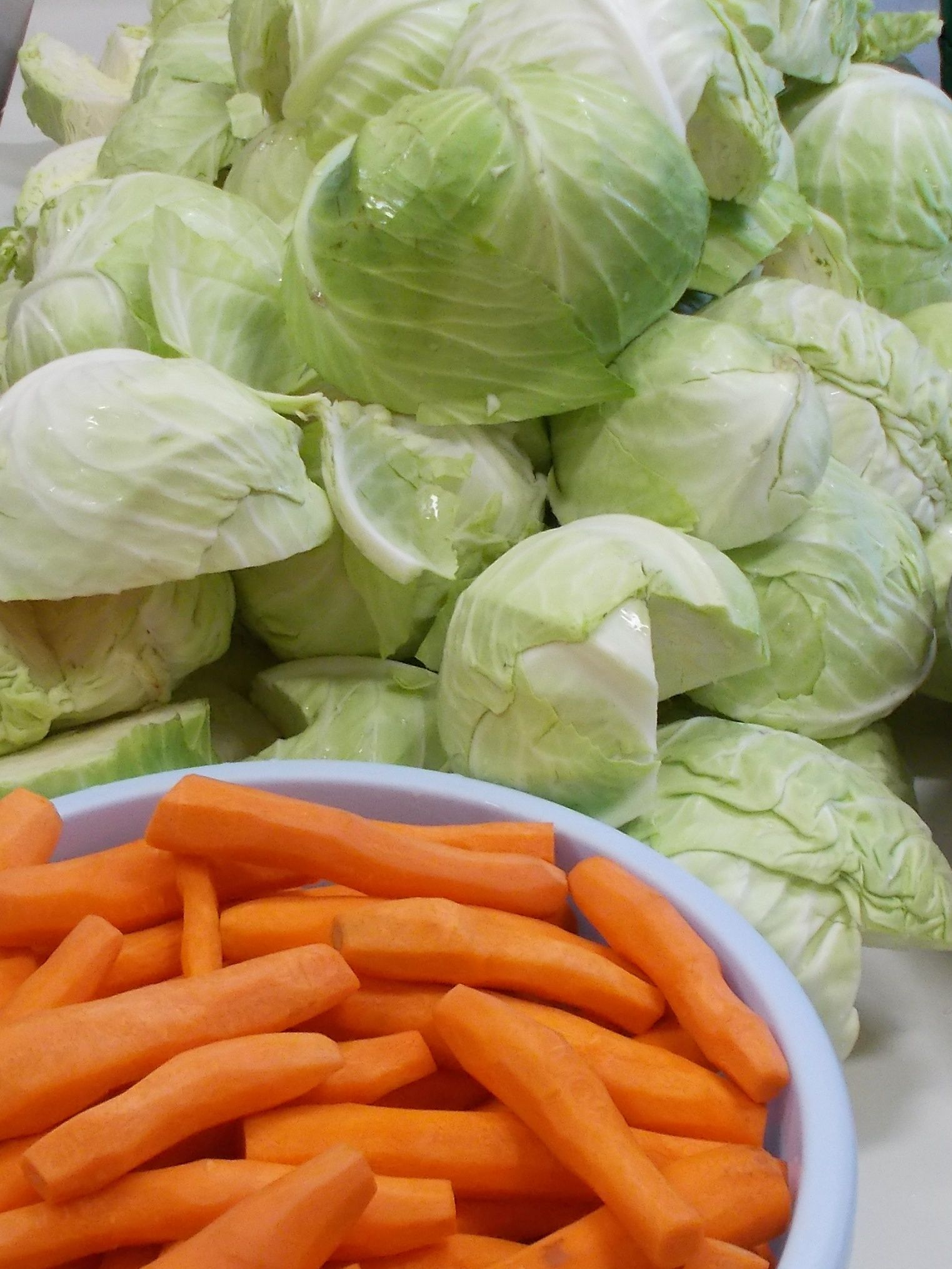 Jak wszyscy wiemy kiszona kapusta  jest cennym źródłem witamin. Tym bardziej warto zrobić ją samemu by uniknąć kapusty zakwaszanej octem, która pozbawiona jest wartościowych składników odżywczych. Nam w zdrowym stylu odżywiania nieustannie pomaga WTZ -owska Kuchnia Dydaktyczna, która niemalże codziennie zaskakuje nas swoimi wyrobami. Tym razem w dniu wczorajszym odbyła się akcja pn „ Dobra kiszona kapusta to więcej niż rozpusta”. Wszyscy warsztatowicze wraz z kilkoma pracownikami ( widać ich na zdjęciach 😉 ) zakasali rękawy i nogawki od spodni i od samego rana obierali, siekali, szatkowali, wkładali, no i ubijali !!  Akcja była tak szybka, że nie spostrzegliśmy się a po kliku godzinach 120 litrowa beka była już pełna kapusty. Grunt to dobrze przygotowany front robót. No cóż nam zima już nie straszna 😉 ( zwróćcie uwagę na archaiczną szatkownicę, jak widzicie w Krzywym Kole można wszystko znaleźć 😉