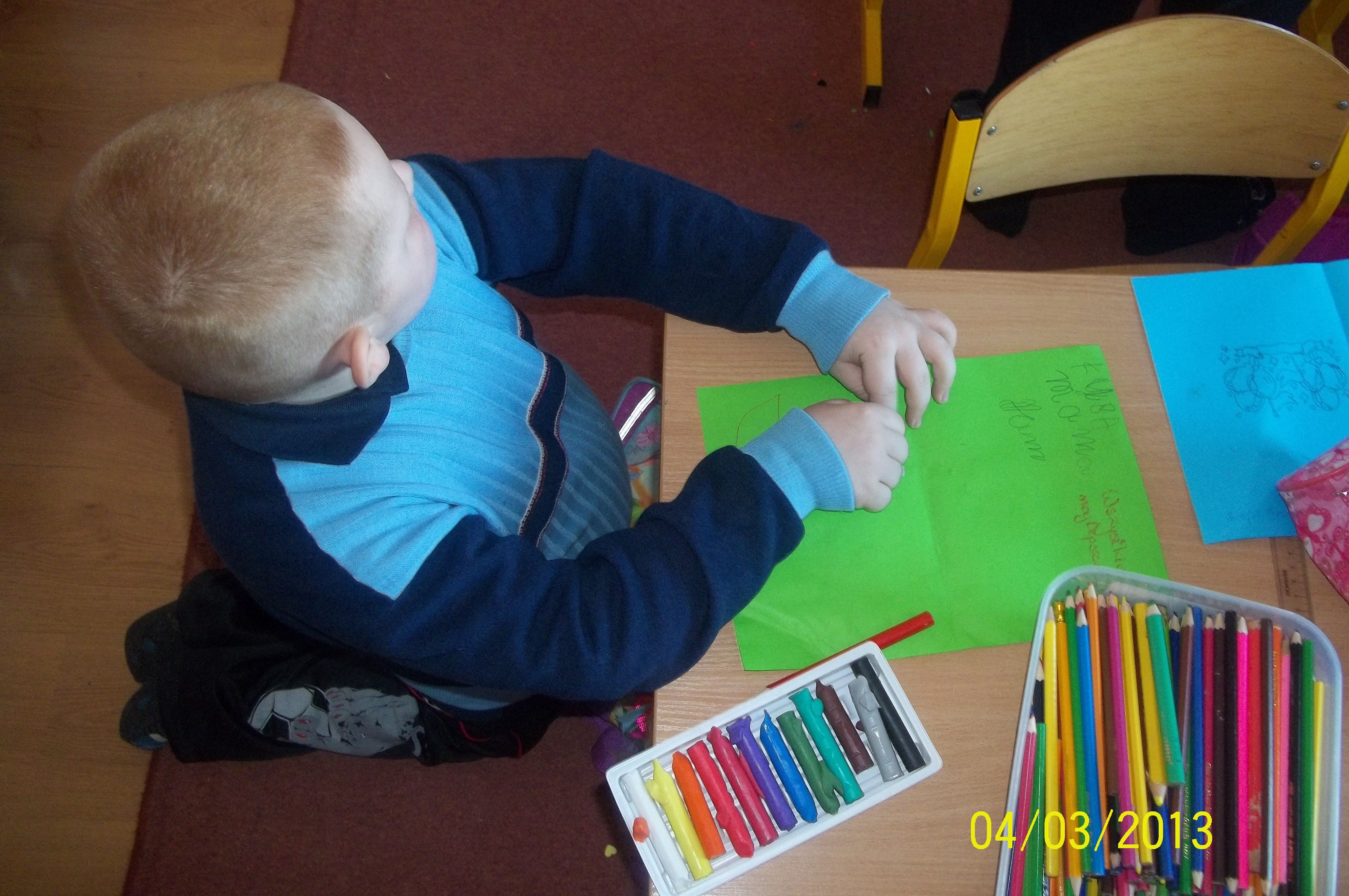 W związku ze zbliżającym się Dniem Kobiet wychowankowie ze świetlicy w Glinczu postanowili przygotować dla swoich najbliższych laurki.Najczęściej były to kartki dla swoich mam. Dzieci chętnie korzystały z nowych dziurkaczy, które fantazyjnie ozdobiły kartki. Niektórzy korzystali z pasteli, inni z kredek, ale były też osoby, które postanowiły wyklejać różne kwiatki, balony, torty plasteliną.