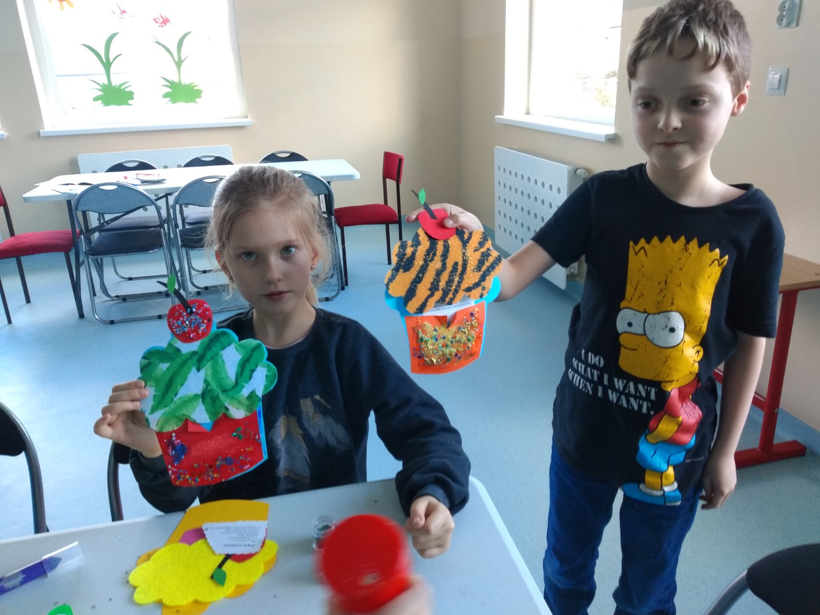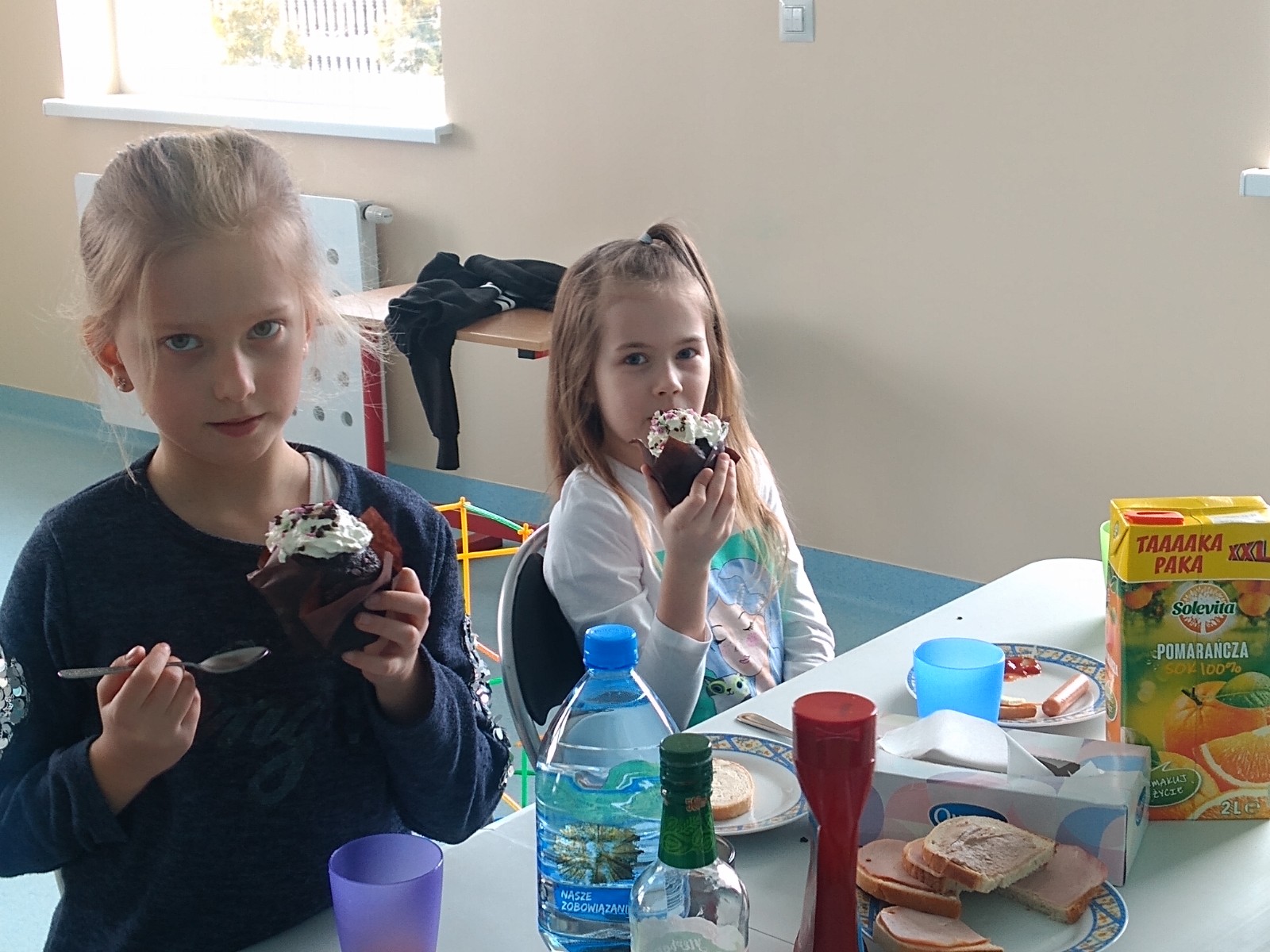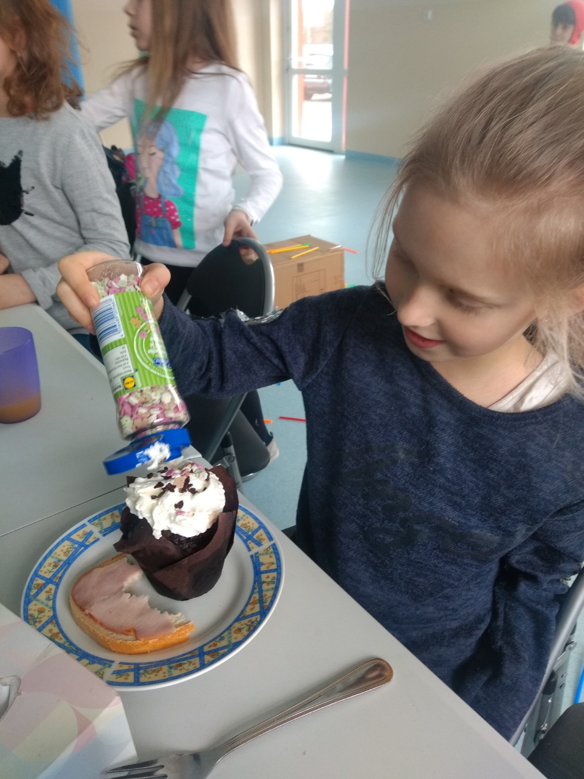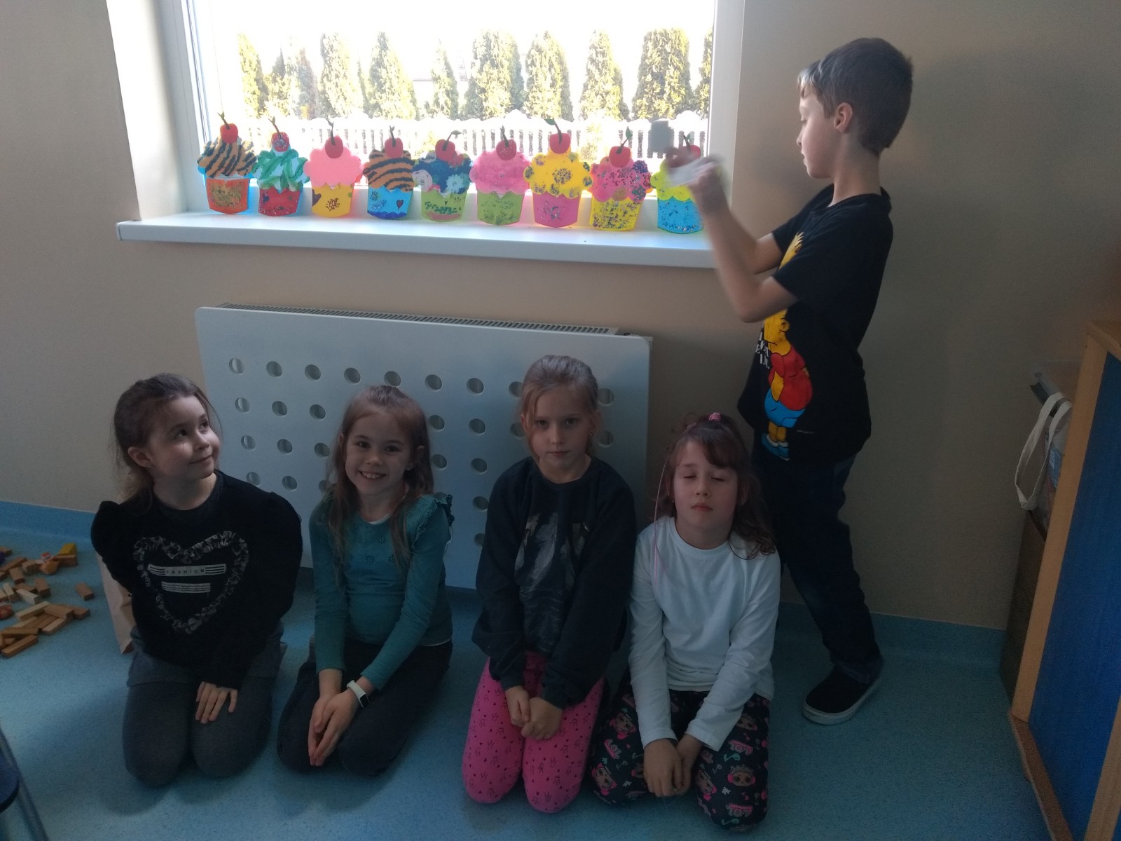 W naszej świetlicy w Tuchomiu ostatnio „rządziły” babki. W ubiegłym tygodniu mieliśmy przepyszne babeczki, które sami mogliśmy ozdobić bitą śmietaną i kolorową posypką. Razem też napisaliśmy przepis, żeby wiedzieć jak je upiec. Za to w tym tygodniu zrobiliśmy babeczki z papieru – ozdobione brokatem. Też nam pięknie wyszły.