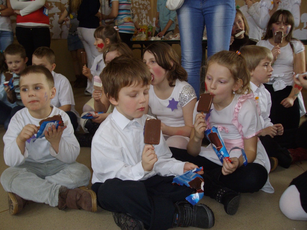 Impreza rozpoczęła się od występu młodych aktorów ze szkoły, którzy przygotowali dla małych widzów przedstawienie o jelonku pyszałku. Potem był pyszny poczęstunek – no i tańce, jak na bal karnawałowy przystało. Wszyscy świetnie się bawili. Na zmęczonych tancerzy czekały napoje, a na koniec wszystkie dzieci otrzymały lody oraz paczki ze słodyczami. Czas minął nam bardzo szybko! Ostatnim punktem programu było odtańczenie poloneza przez wszystkich uczestników balu. W ten sposób tanecznym krokiem opuściliśmy salę i udaliśmy się do szatni.