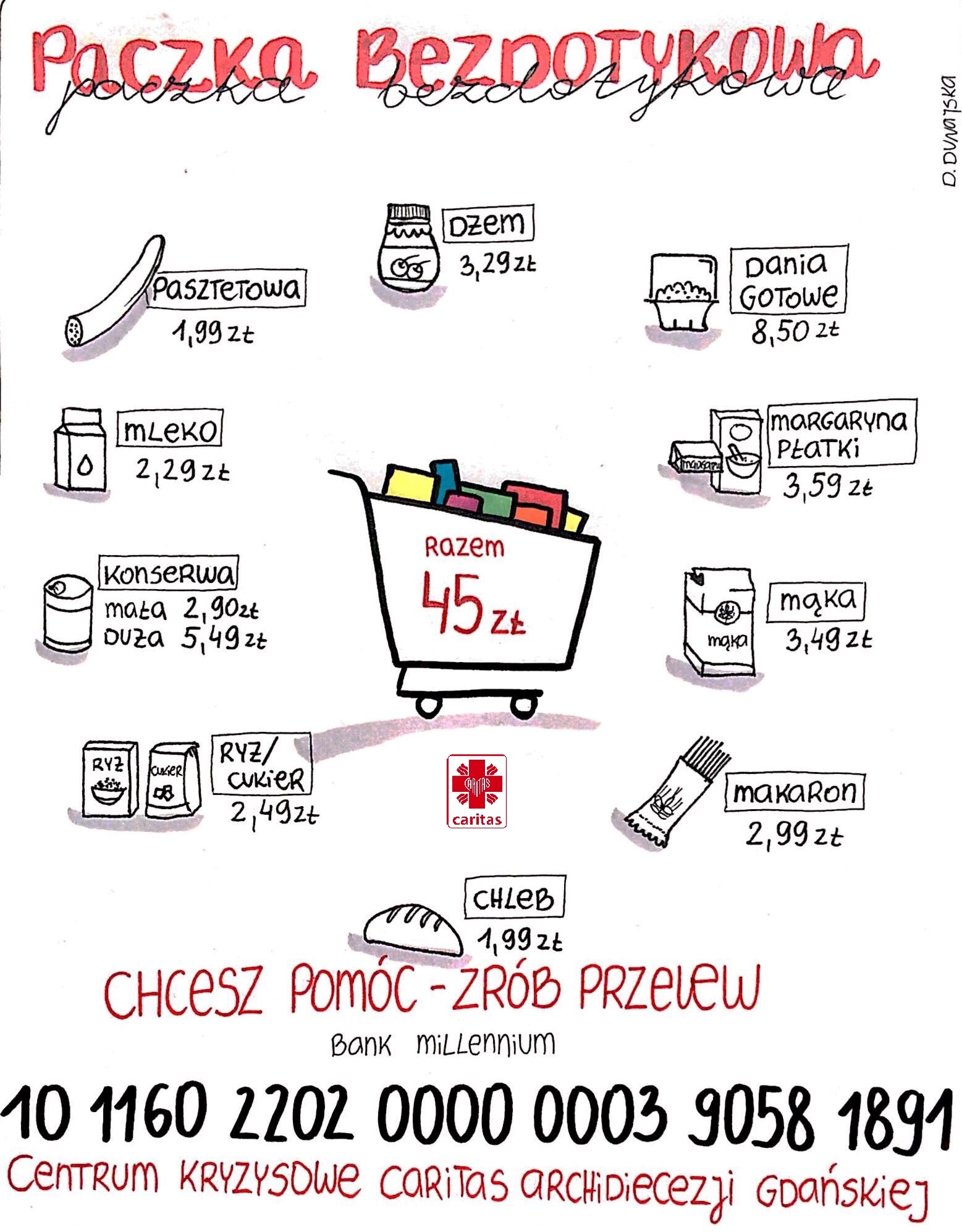 Prosimy o ufundowanie paczki żywnościowej, którą przekażemy pod drzwi osób/rodzin potrzebujących.