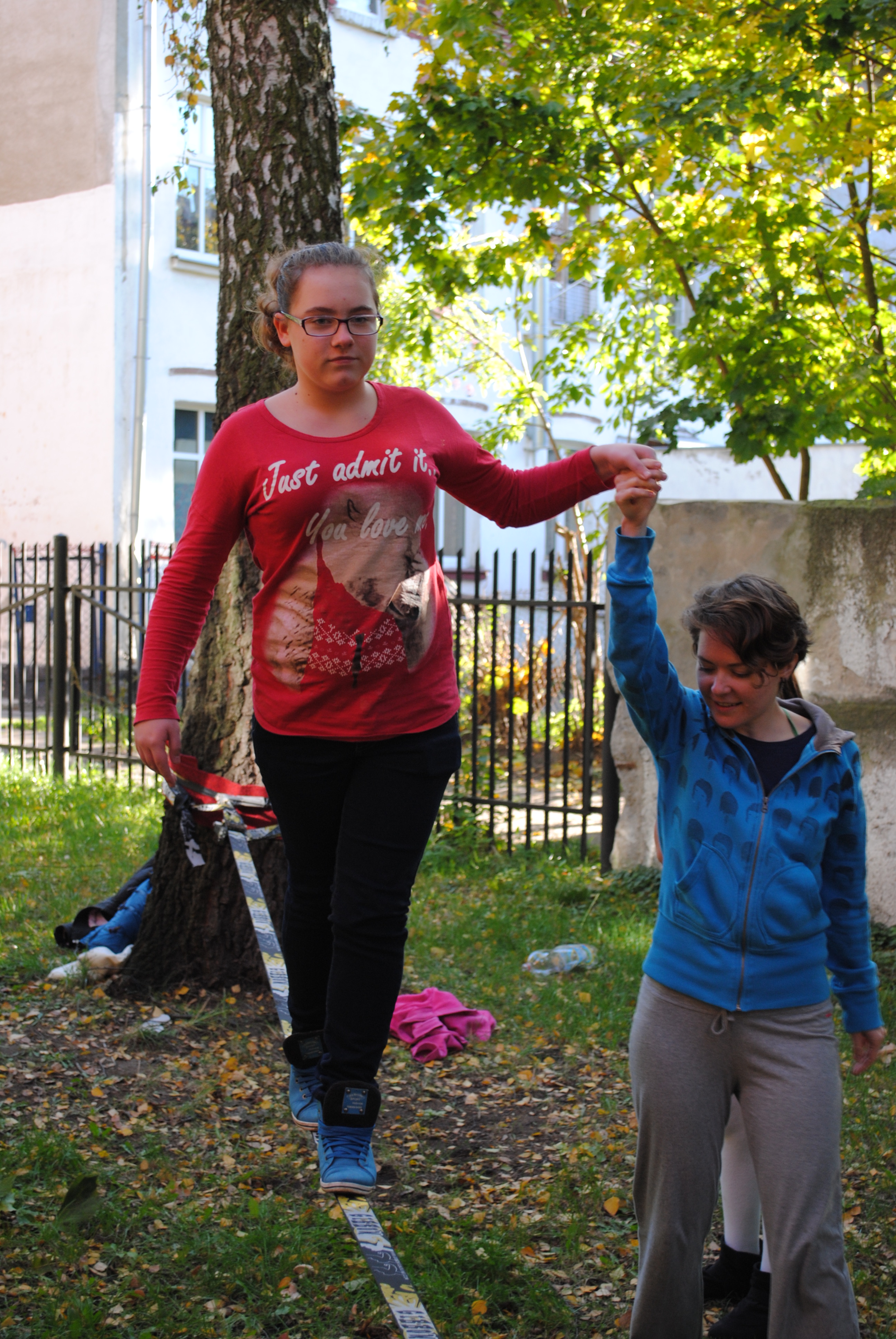 W ubiegłym tygodniu wykorzystaliśmy sprzyjającą, słoneczną pogodę i wybraliśmy się do naszego ogrodu za placówką. Wolontariuszka Oana zapewniła nam wrażenia w postaci chodzenia po linie (taśmie) zawiązanej między dwoma drzewami. czynnośc ta znana jest jako „slackline”. Na początku wszyscy przeszliśmy całą taśmą korzystając z asekuracji. Następnie próbowaliśmy zrobić to bez asekuracji, ufając swojej równowadze i walcząc z grawitacją. Na koniec nadszedł czas na próby skoków, podskoków na linie. To było rewelacyjne popołudnie, pełne śmiechu i radości. Wszystko odbywało się oczywiście całkowicie bezpiecznie. Dziękujemy Oanie za to, że zechciała podzielić się z nami swoimi umiejętnościami. Napewno będziemy jeszcze z tego korzystać 🙂