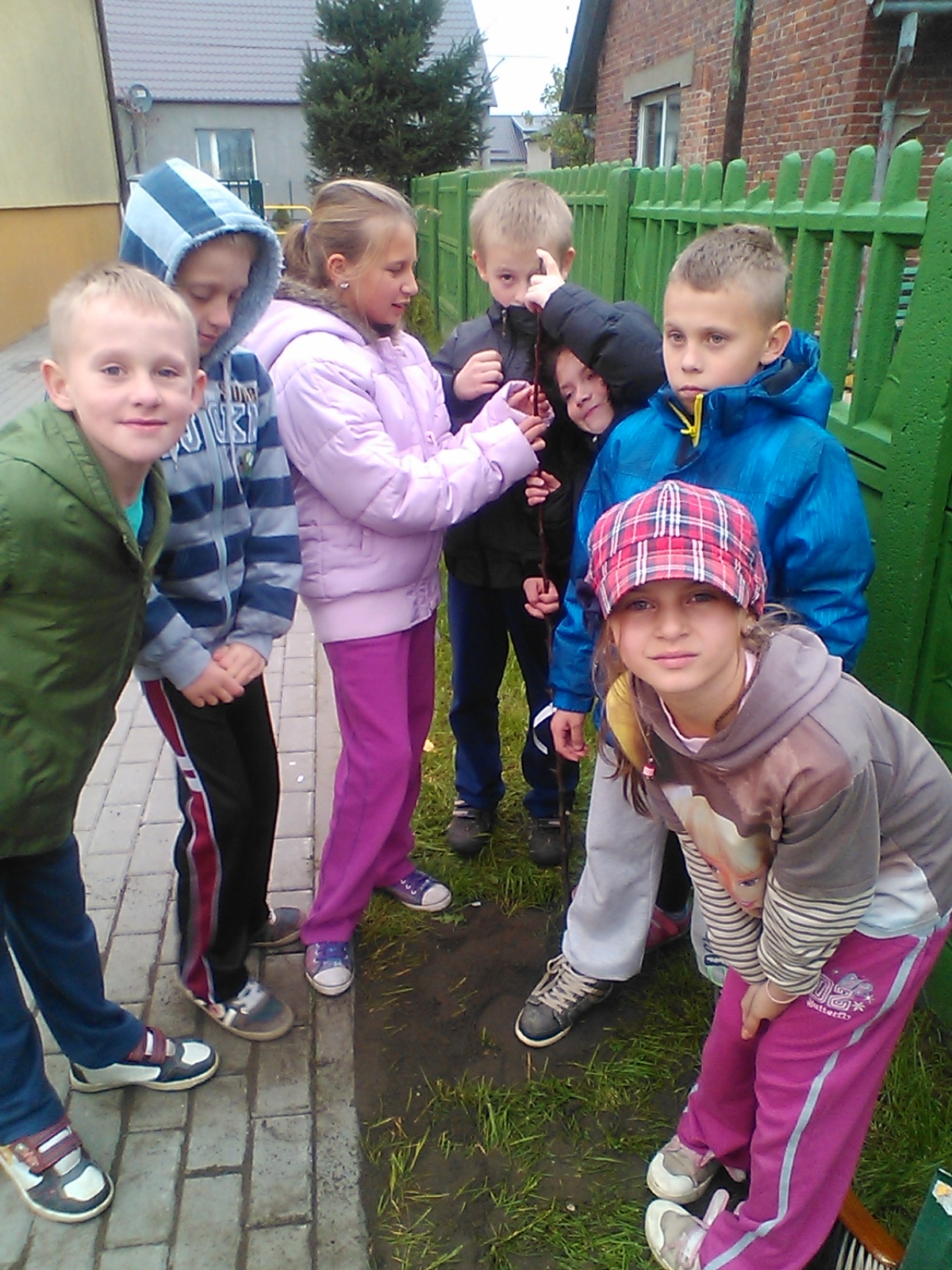 W naszej świetlicy oprócz tego co zwykle robimy mieliśmy ciekawe, nowe zadanie do wykonania. Mianowicie przy szkole, do której uczęszczamy i w której mieści się nasza świetlica, posadziliśmy drzewko. I to drzewko nie byle jakie. Jest to GRUSZA. Mamy nadzieję, że szybko urośnie. Już ją obficie podlewamy, a wiosną będziemy chcieli zobaczyć jak się zazieleni. Szkoda tylko, że nie prędko zobaczymy na niej owoce, ale i tak mieliśmy dużo radości kopiąc dołek w ziemi, aby ją posadzić. Nasi młodsi koledzy na pewno będą się zajadać soczystymi owocami. Niech im będzie na zdrowie! Zauważyliśmy, że warto zrobić coś z czego będą mogli  cieszyć się inni.