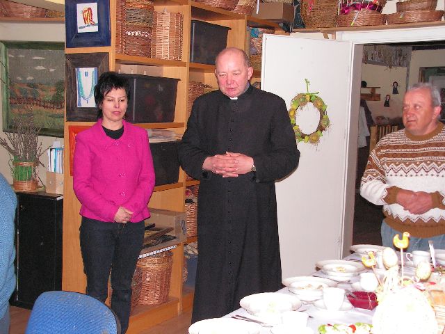 W samo południe, po uprzednim pobłogosławieniu, przez księdza proboszcza, naszych pięknie i suto zastawionych stołów, różnorodne i pyszne dania nie tylko cieszyły nasze oczy ale również rozpieszczały podniebienia. Naszymi gośćmi honorowymi byli ksiądz dyrektor Janusz Steć , ksiądz dziekan oraz ksiądz proboszcz. Poza „wilczym” apetytem dopisywały nam również „szampańskie” humory, co zresztą widać na dołączonych zdjęciach.