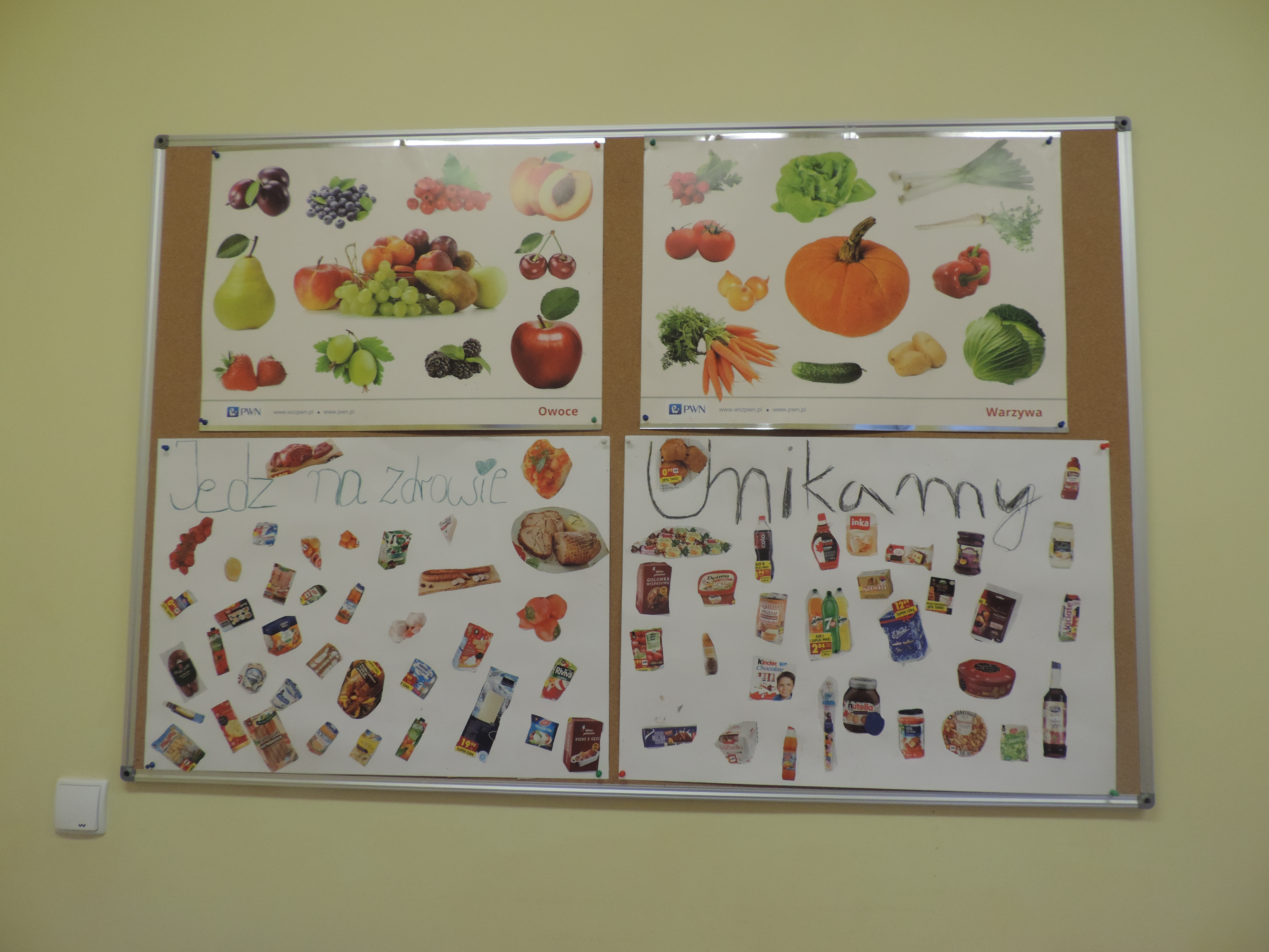 Nasze plansze „Jedz na zdrowie” i „Unikamy”, w ramach zajęć dotyczących zdrowego żywienia zostały ukończone. Wiedza zdobyta na poprzednich warsztatach bardzo nam się przydała. Z gazetek powycinaliśmy produkty spożywcze, które później umieściliśmy na właściwych planszach.