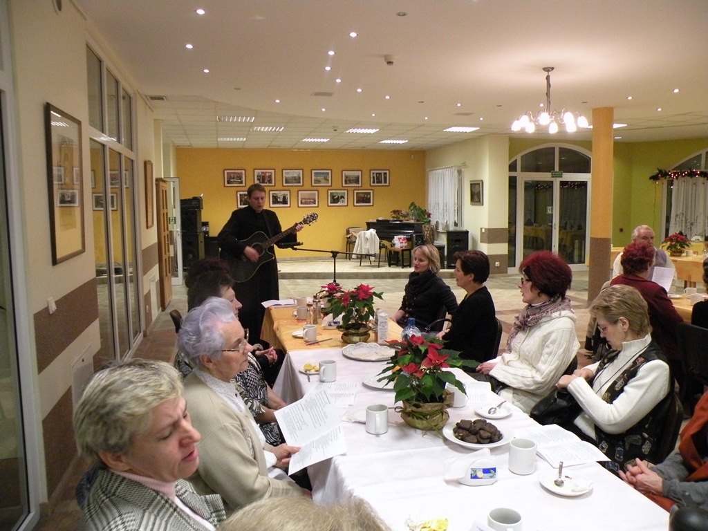 Druga część spotkania miała miejsce w Centrum Pomocowym Caritas przy ul. Fromborskiej, gdzie udaliśmy się po Mszy. Tam czekała już na nas gorąca kawa i herbata oraz pyszne ciasto przygotowane przez pracowników Centrum. Zanim zasiedliśmy do stołów Ksiądz Piotr zaprosił wszystkich do podzielenia się opłatkiem. Potem śpiewniki poszły w ruch i rozpoczęliśmy kolędowanie.