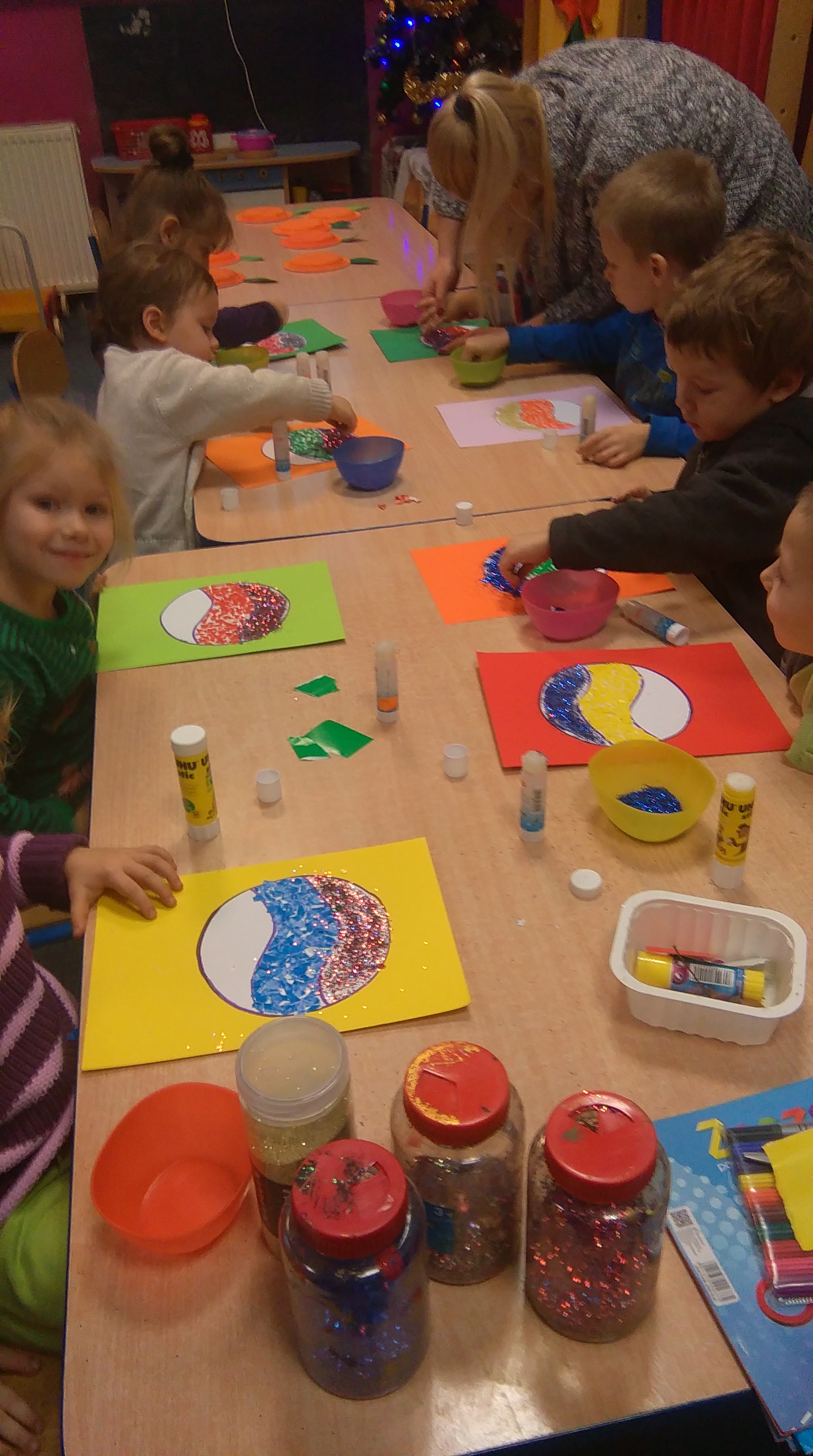 Radosne Krasnale rozpoczęły przygotowania do Świąt Bożego Narodzenia. Po Mikołajach i ozdabianiu pierniczków przyszła kolej na strojenie sali. Każdy z maluchów przygotował mieniącą się bombkę. Bombki przyozdobiły nasza jadalnię.