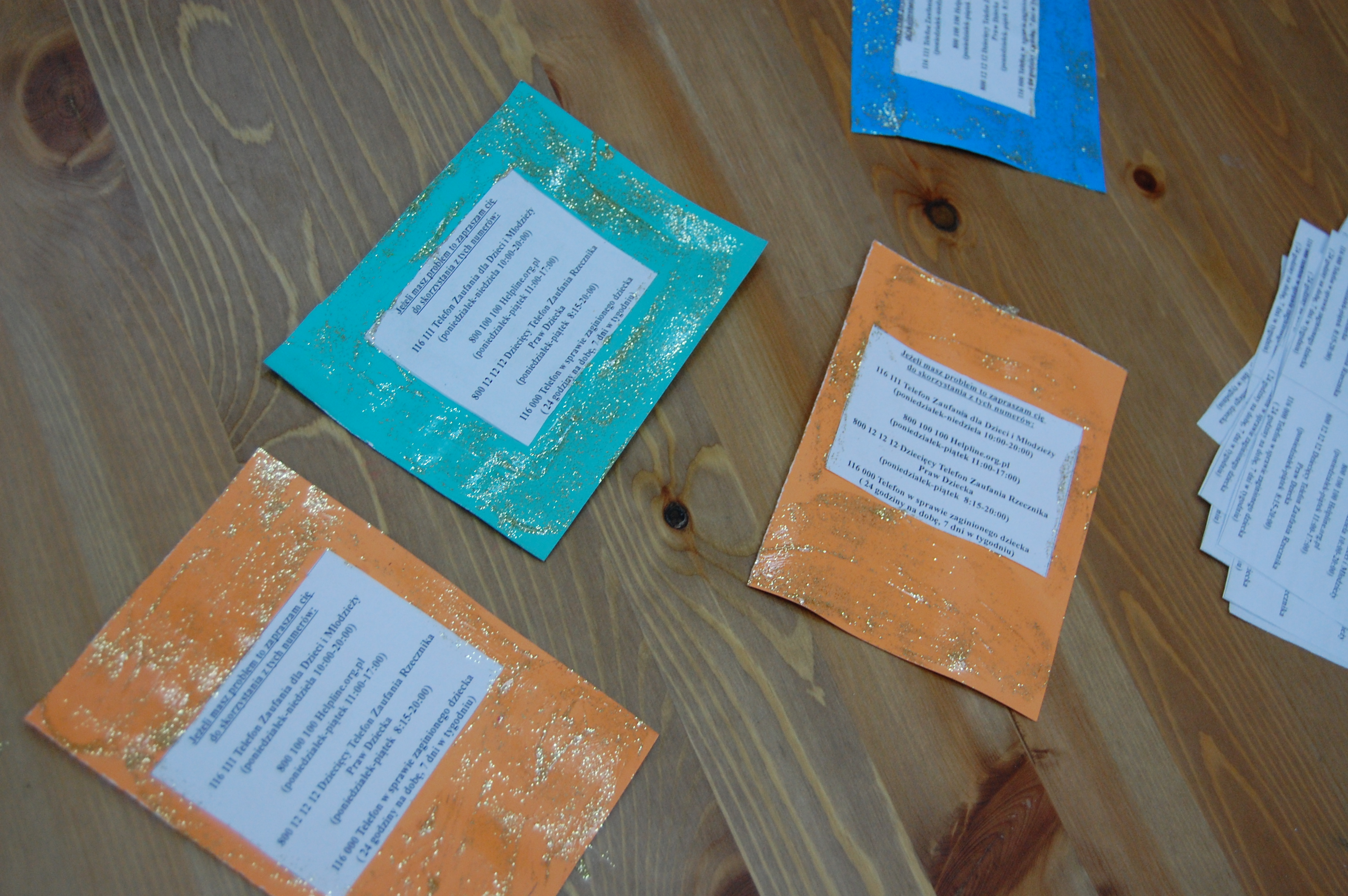 W tym tygodniu dzieci z Centrum Caritas „Na Dolnej”zaangażowały się w akcję Dzień Telefonów Zaufania 2013. W ramach tej akcji nasi wychowankowie zrobili ulotki w formie zaproszenia, które w razie potrzeby, namawiały do skorzystania z telefonów zaufania. Uczestnicy „Dobrej Świetlicy” zostali poinformowani w jakich sytuacjach można skorzystać z telefonów zaufania. Ulotki zostały również rozdane na Dolnym Mieście w Gdańsku.