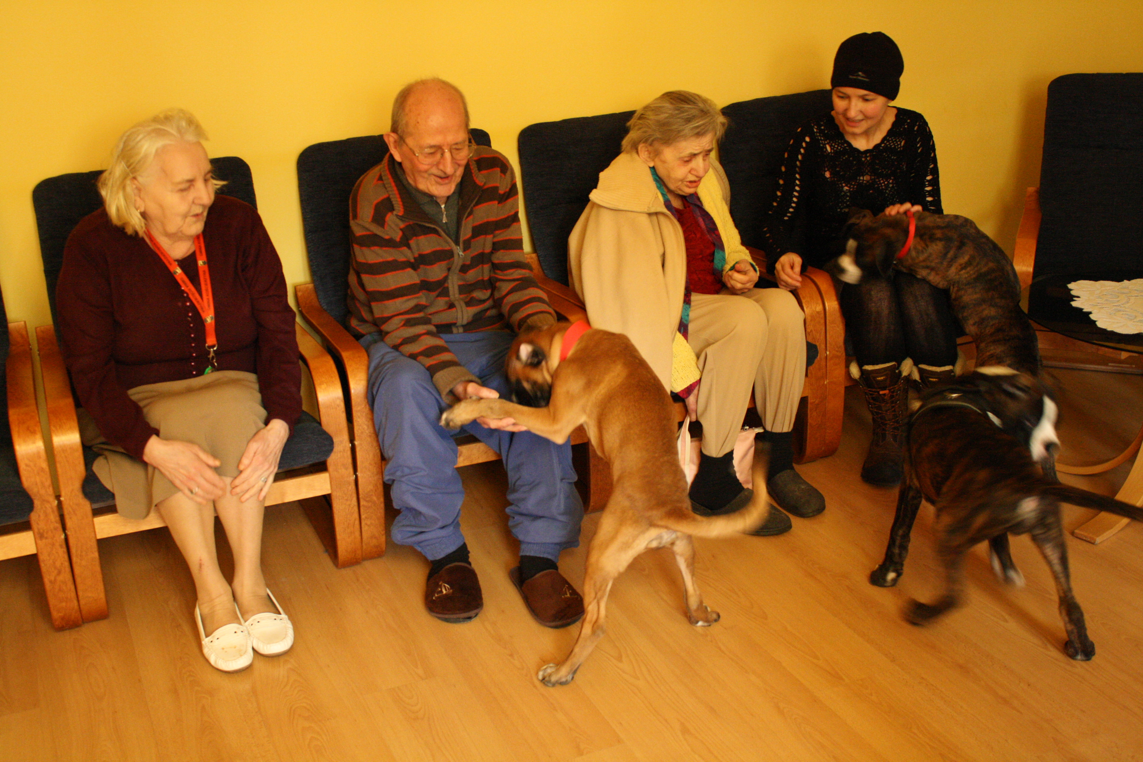 24 stycznia odwiedzili nas wyjątkowi goście z Fundacji Dobrych Zwierząt z Gdyni: pani Krystyna Dudzis, zoopsycholog, dogoterapeuta i treser psów, asystentka Aneta oraz cztery wesołe psiaki, boksery: Inka, Zara i Czabor oraz pitbull Prażka. Boksery zostały adoptowane z fundacji Boksery w Potrzebie, natomiast pitbull pochodzi ze schroniska Promyk. Pani Krystyna opowiadała mieszkańcom o psich zwyczajach, psotach oraz pochodzeniu każdego z czworonogów. Seniorzy byli zachwyceni małymi psotnikami. Mieli okazję zobaczyć, jak potrafią aportować oraz bawić się ze sobą. Był to dla wszystkich czas radości, uśmiechu, ale także refleksji i wspomnień. Pensjonariusze wspominali swoich czworonogów, którzy na zawsze pozostaną w ich pamięci. Nie zabrakło zabawnych historii dotyczących zachowań psiaków, które przysporzyły dużo uśmiechu na twarzach mieszkańców.