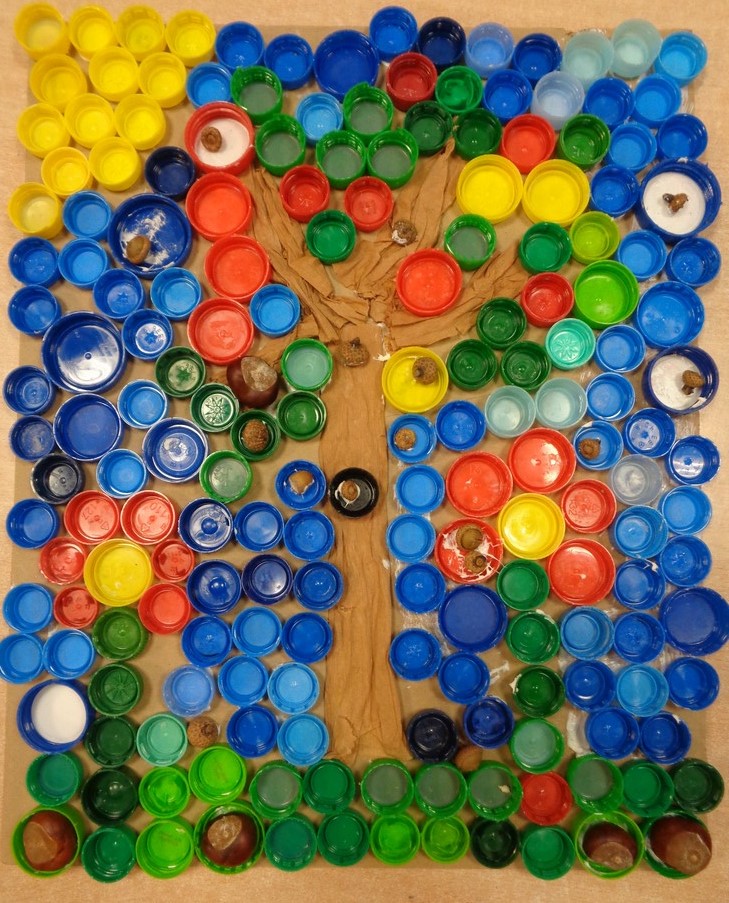 Grupa „Anielska Kraina” na zajęciach plastycznych wyklejała jesienny krajobraz używając plastikowych nakrętek. Kolorowe jesienne prace zaabsorbowały dzieci i zadziwiły swoim efektem.