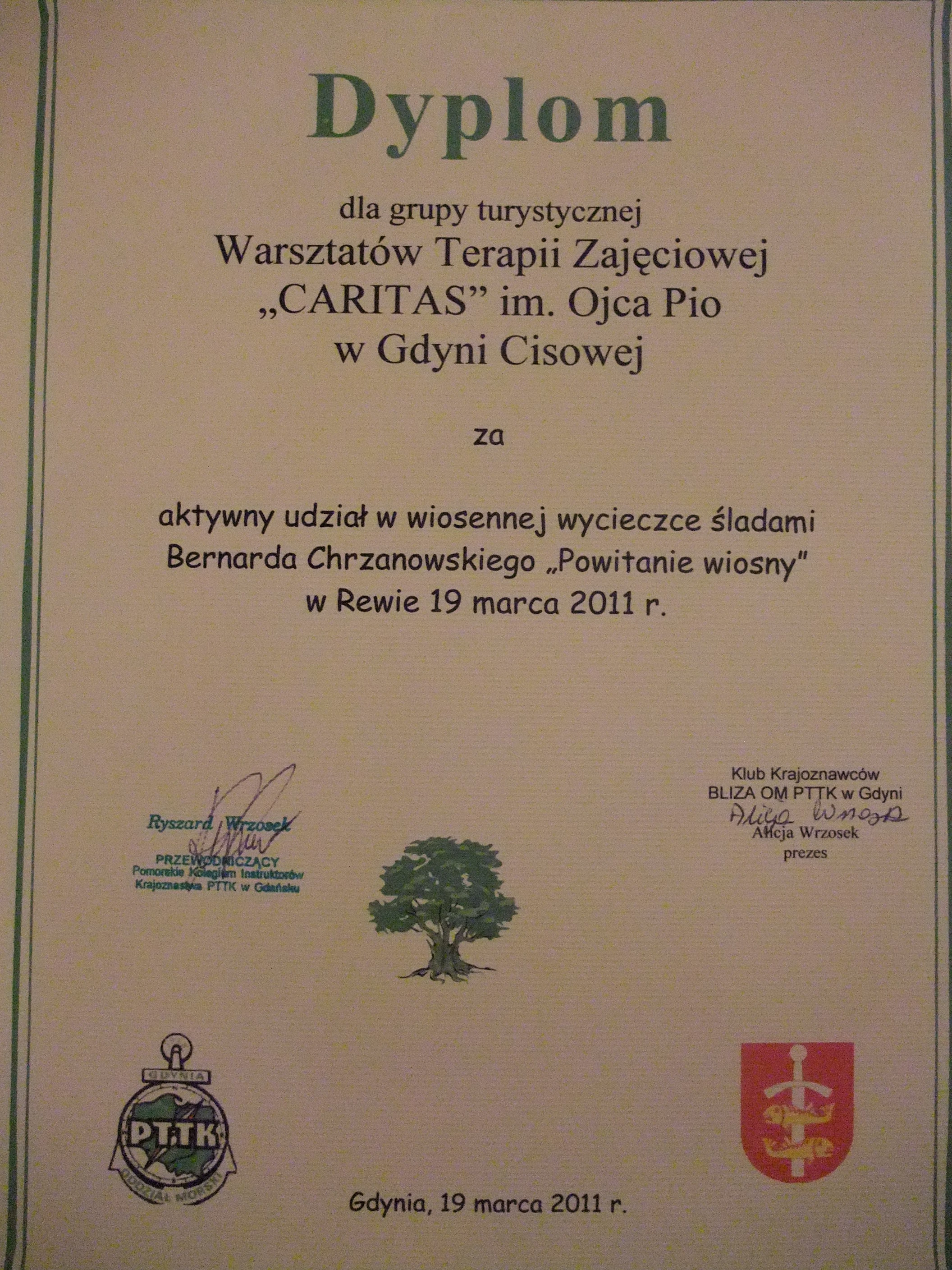 Zgodnie z myślą przewodnią Odziału Morskiego Polskiego Towarzystwa Krajoznawczego w Gdyni „Tylko poznawszy swój kraj, można go gorąco ukochać i owocnie dla niego pracować” uczestnicy Warsztatu Terapii Zajęciowej przy Centrum Pomocowym Caritas im. Św. Ojca Pio w Gdyni brali aktywny udział w wycieczkach krajoznawczych zarówno w roku ubiegłym jak i w obecnym. Dzięki tym podróżom mieliśmy szansę na wyrabianie nawyków czynnego wypoczynku oraz poznawania piękna i kultury naszego kraju. W ramach podziękowania za nasze czynne uczestnictwo w wycieczkach otrzymaliśmy od PTTK OM w Gdyni dyplomy, które na pewno zmotywują nas do dalszego zwiedzania najpiękniejszych zakątków Pomorza i całego kraju.