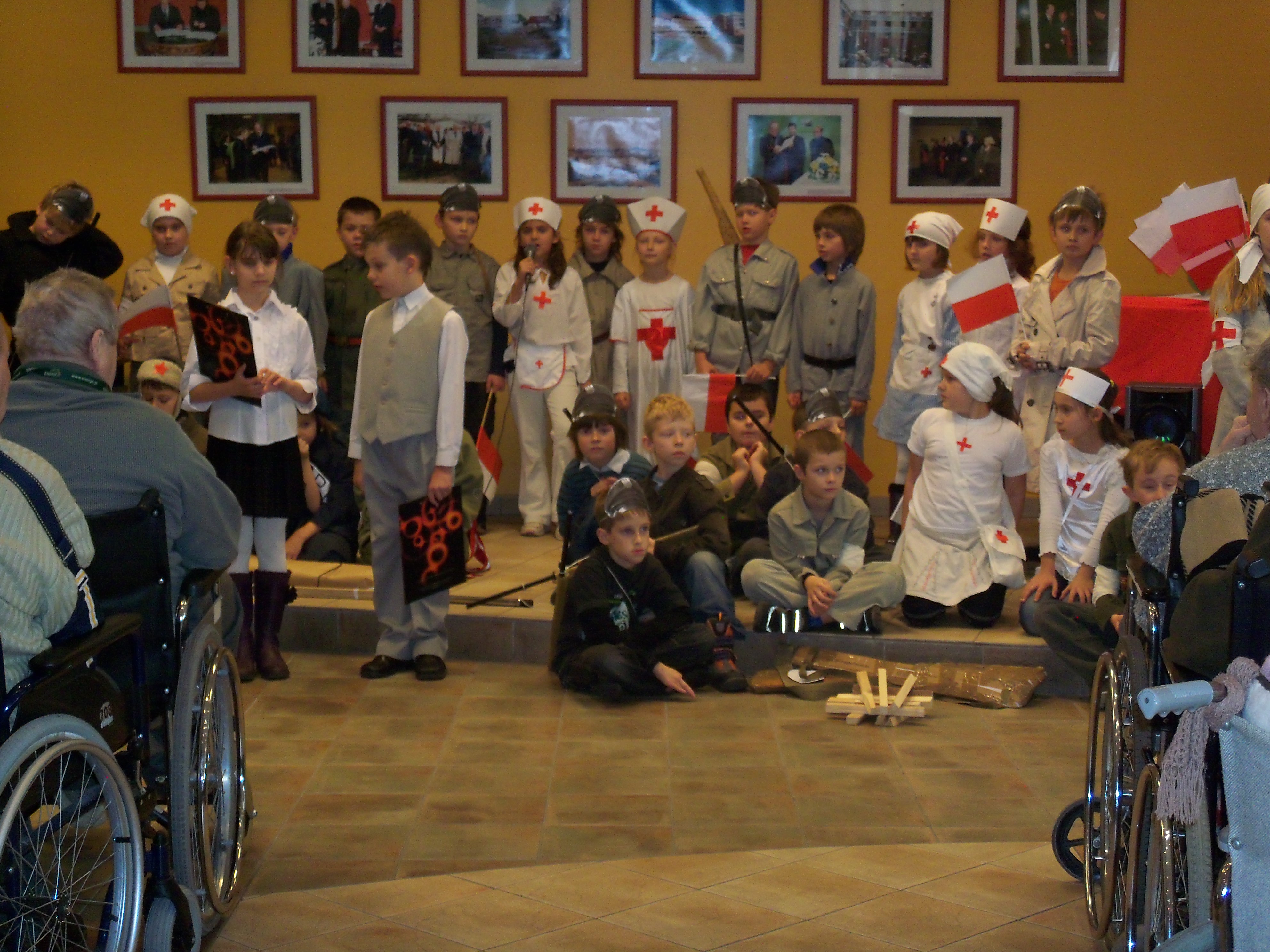 Chłopcy i dziewczęta klas II i III SP nr 48 z Gdańska ubrani w mundurki , przebrani za żołnierzy, harcerki, sanitariuszy w słowie i pieśni odtworzyli długą historię zniewolonej Polski.