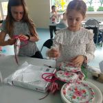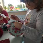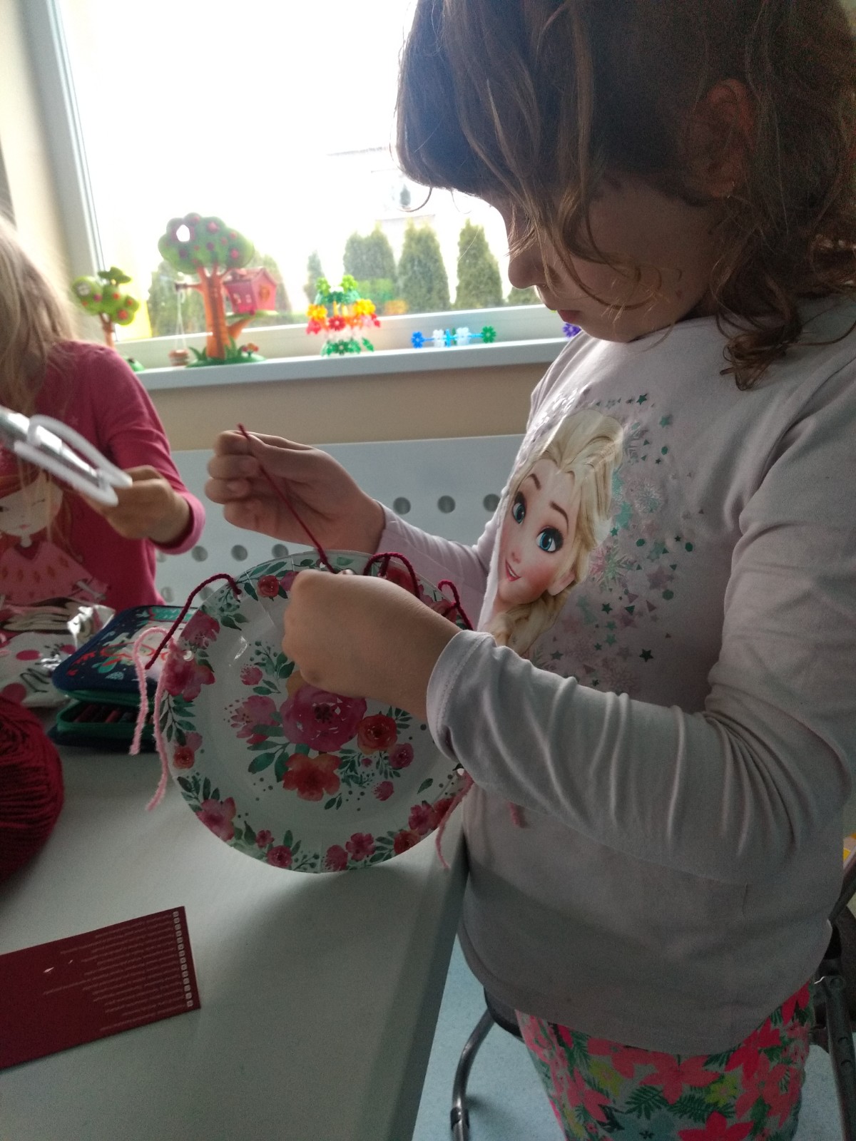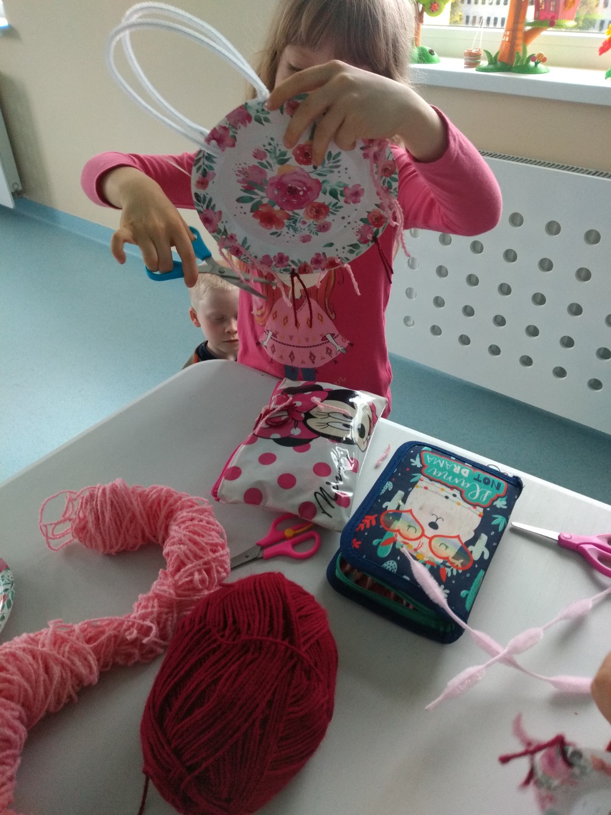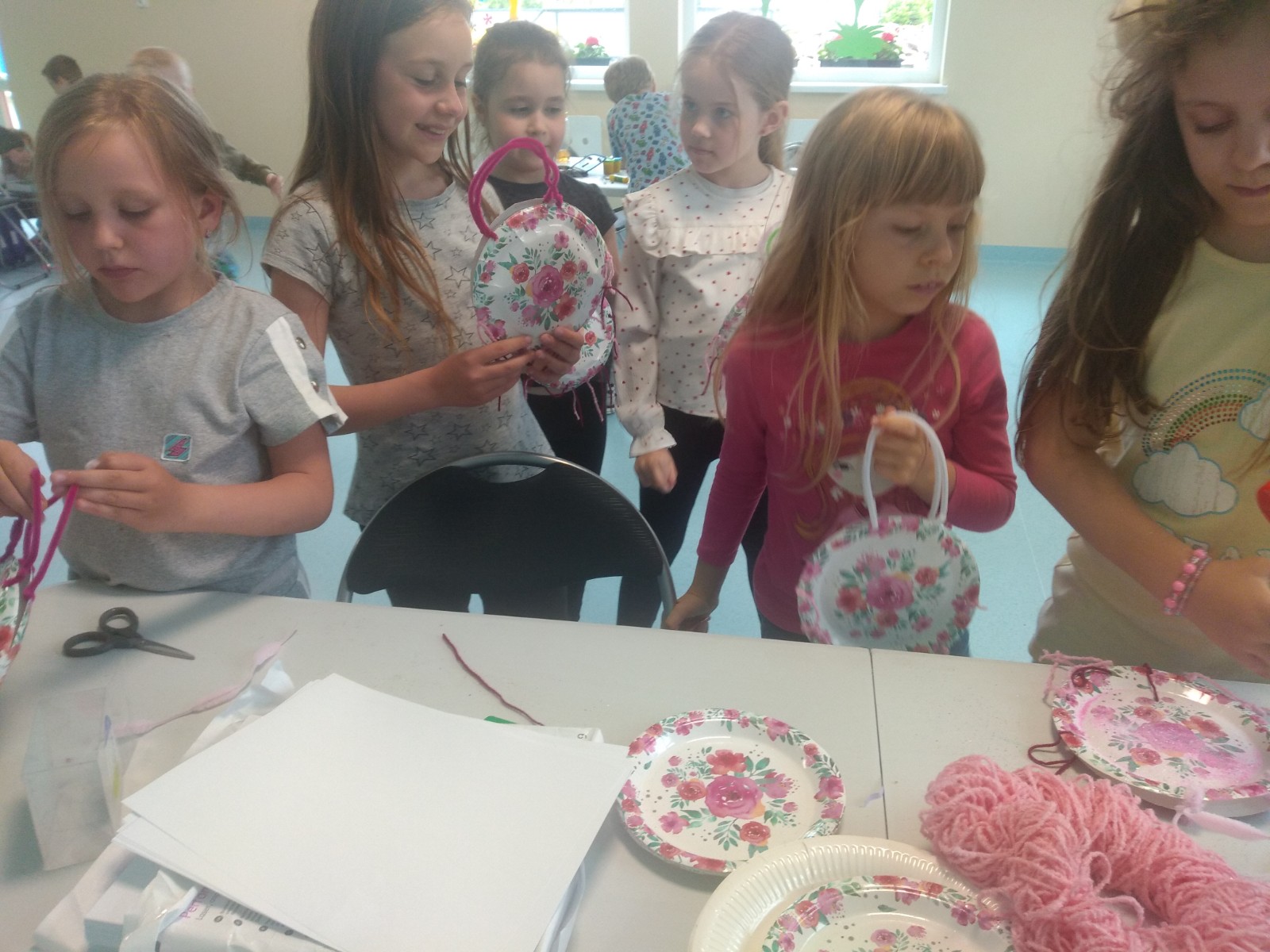 Z okazji wczorajszego święta dzieci ze świetlicy w Tuchomiu zrobiły  dla swoich Mam torebki z kwiatowych talerzyków papierowych. Pracowały przy tym z dużym skupieniem i zaangażowaniem, co widać na załączonych zdjęciach.