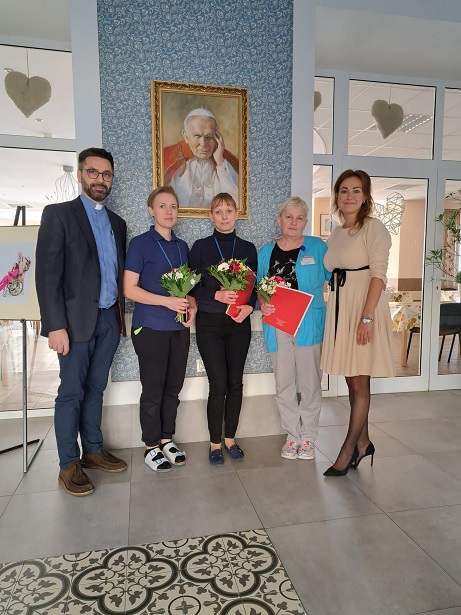 Z tej okazji Dyrektor ks. Janusz Steć CARITAS Archidiecezji Gdańskiej oraz Pani Dyrektor Wioleta Pacak-Rygielska wręczyli wyrożnienia czterem pracownikom: Pani Agnieszce Bladowskiej- Małkowskiej, Pani Annie Pajewskiej, Pani Irenie Zagórskiej i Pani Liliannie Pasternak.