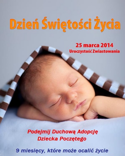 W odpowiedzi na wezwanie Bł. Jana Pawła II zawartego w encyklice Evangelium Vitae, polski Episkopat w 1998 r. ustanowił uroczystość Zwiastowania Pańskiego Dniem Świętości Życia. Wyrazem naszej duszpasterskiej troski o tę świętość i godność ludzkiego życia od samego początku aż do śmierci, niech będzie promowanie Duchowej Adopcji Dziecka Poczętego.