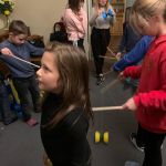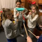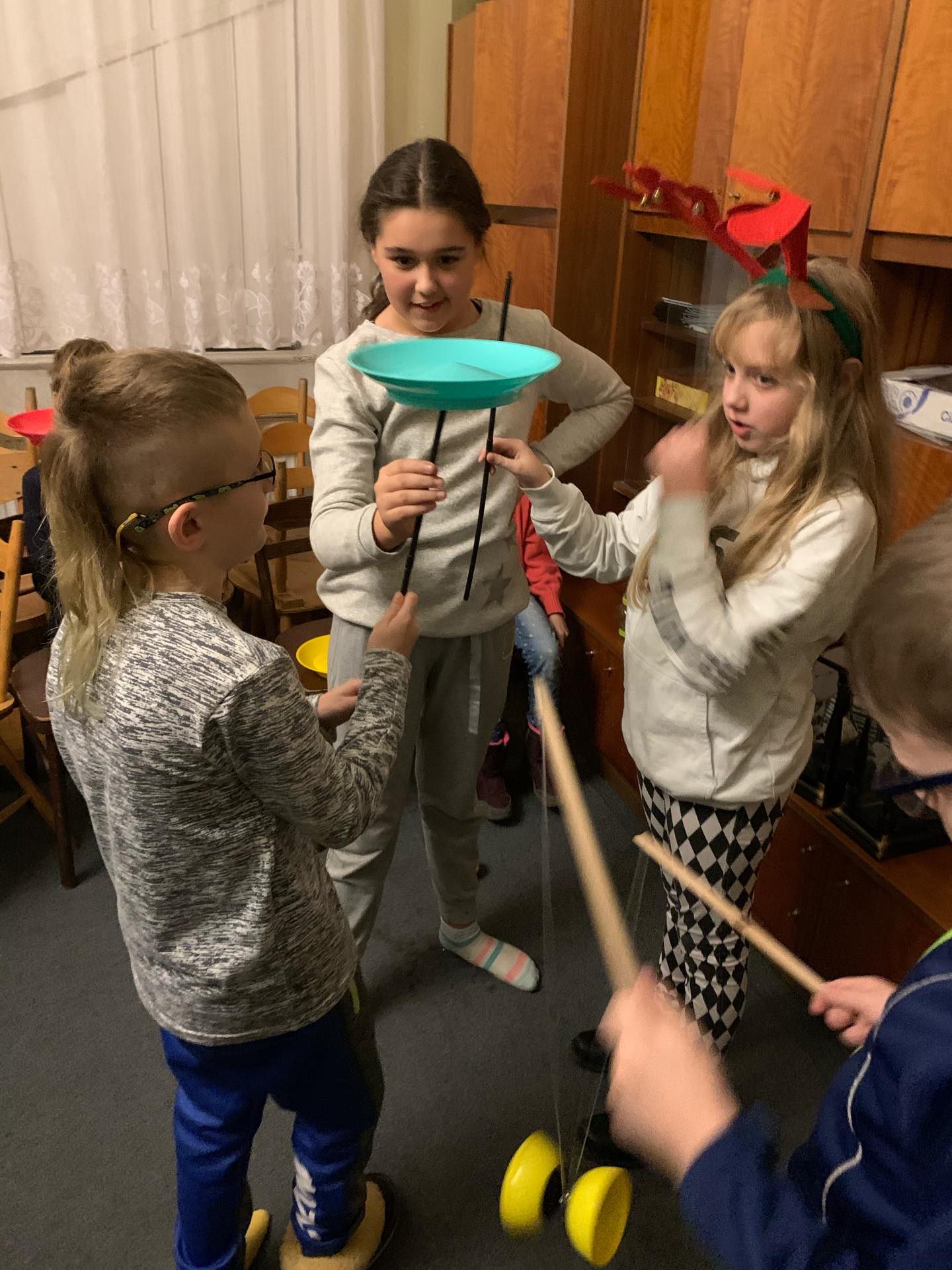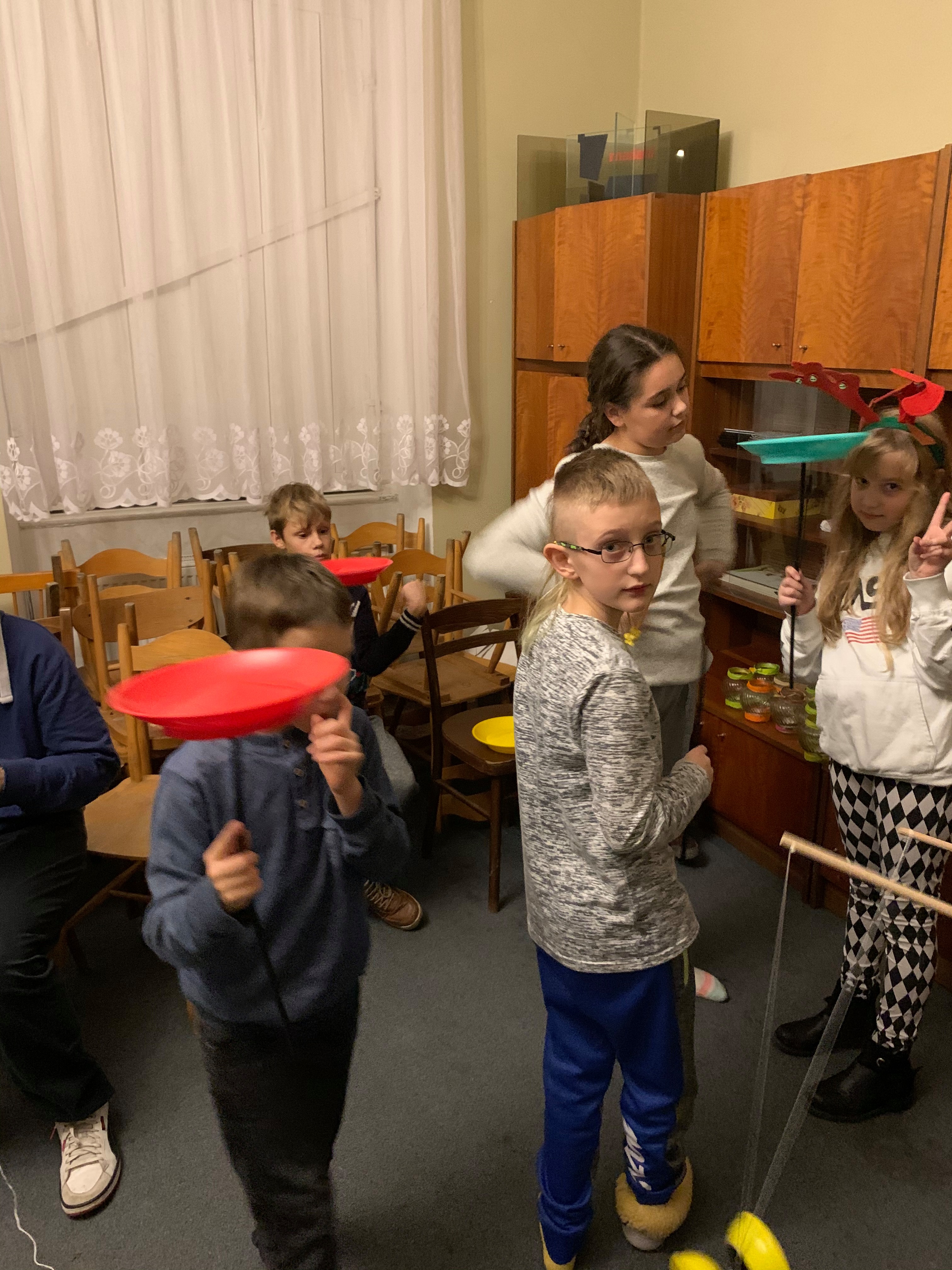 - Chłopiec balansuje talerzem na patyku, dziewczynka stara się przejąć talerz, dziewczynka o blond włosach instruuje ich jak wykonać ćwiczenie