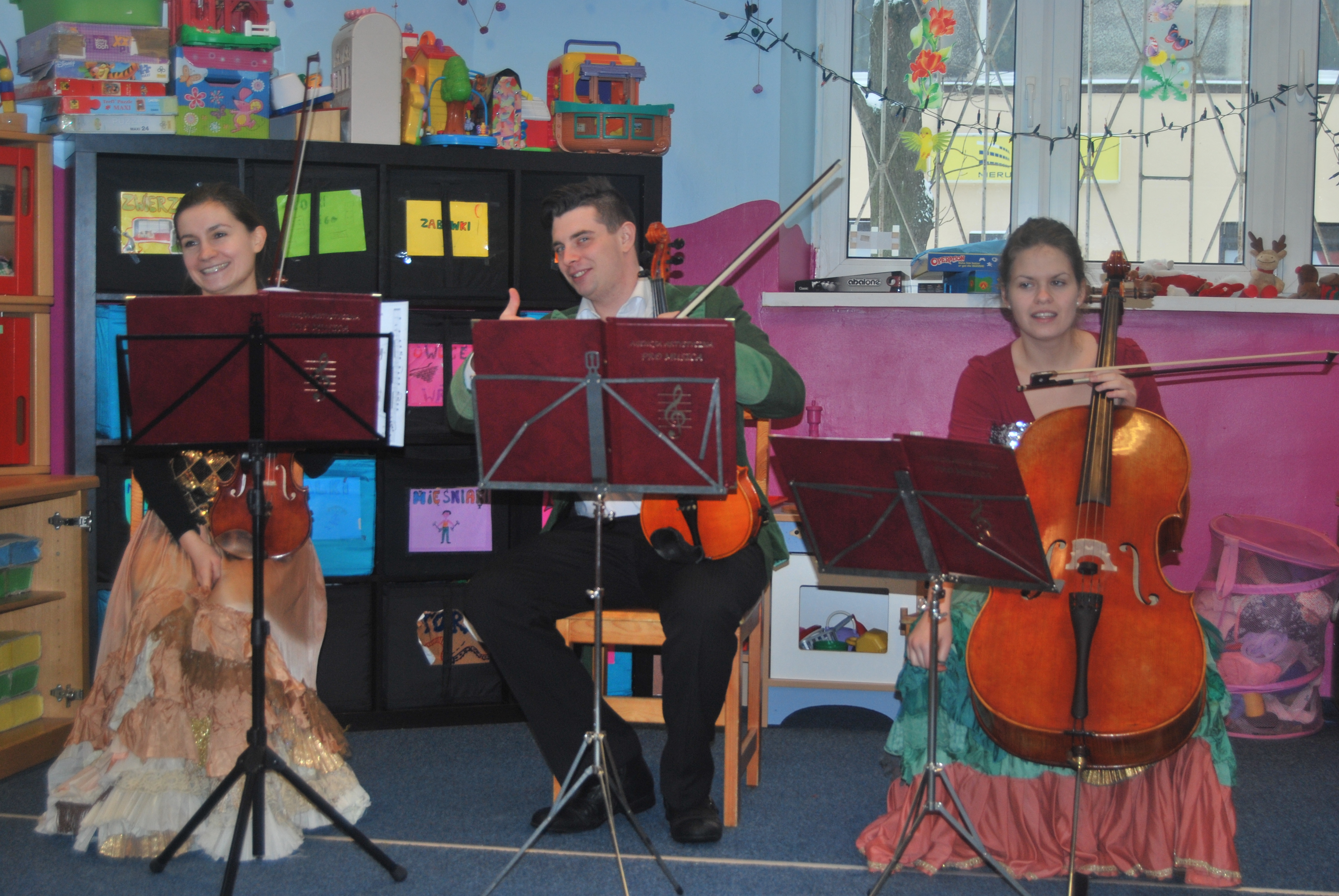 koncertem. Tym razem dzieci usłyszały bajkę, której towarzyszyły instrumenty smyczkowe: skrzypce, altówka oraz wiolonczela. Dzieci aktywnie uczestniczyły w koncercie odpowiadały na pytania muzyków, wspólnie tanczyły i spiewały.