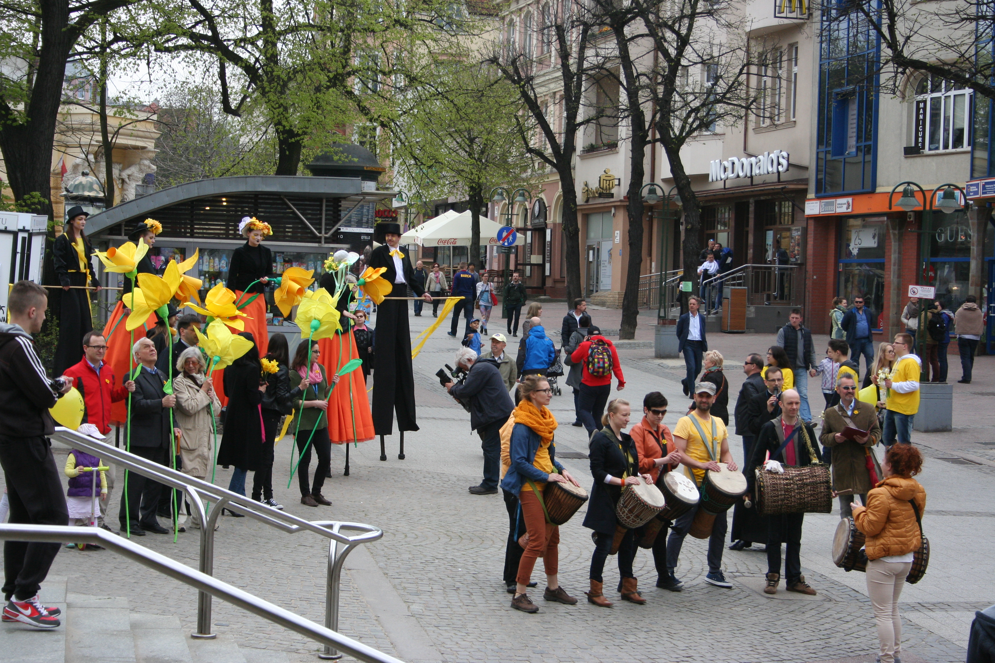 Rozpoczęliśmy kolorowym żonkilowym przemarszem spod kościoła p.w. św. Jerzego. W rytm bębniarzy z KUKAKIKE udaliśmy się w kierunku Molo. Ciężko było nas nie zauważyć, gdyż ponad nami maszerowali na szczudłach artyści z „Plamy” Gdańskiego Archipelagu Kultury.