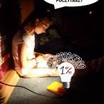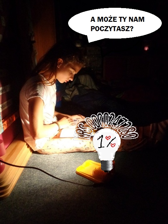 - Dziewczynka czytająca książkę przy zapalonej lampce.