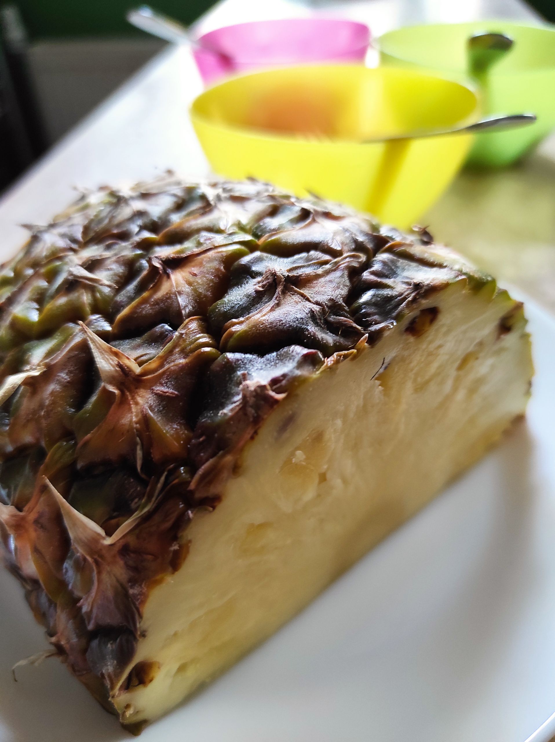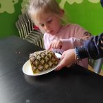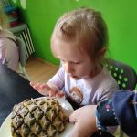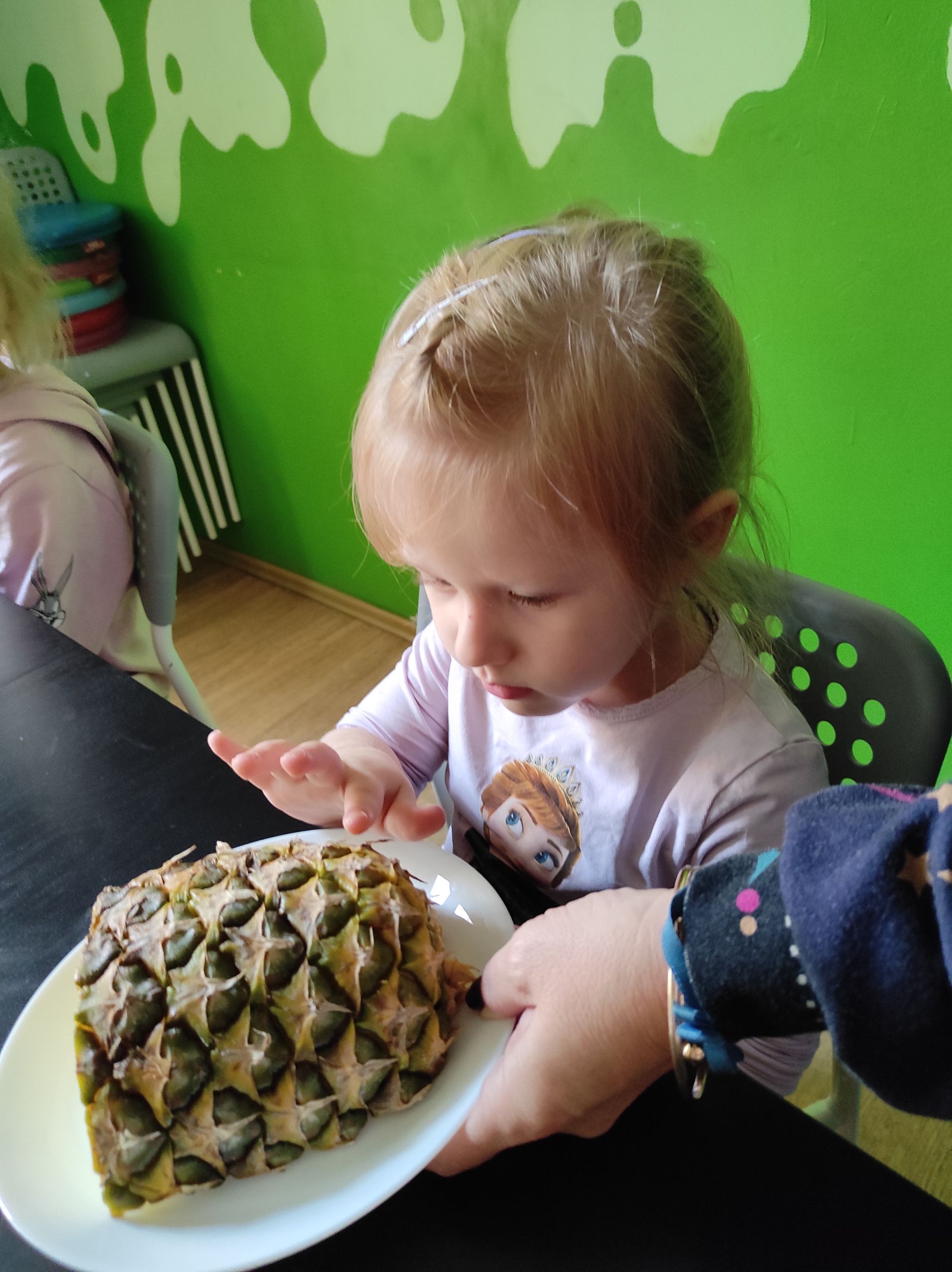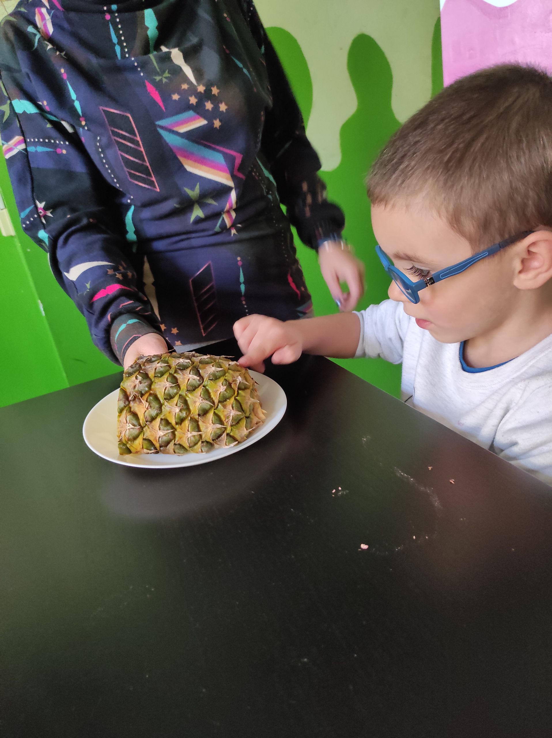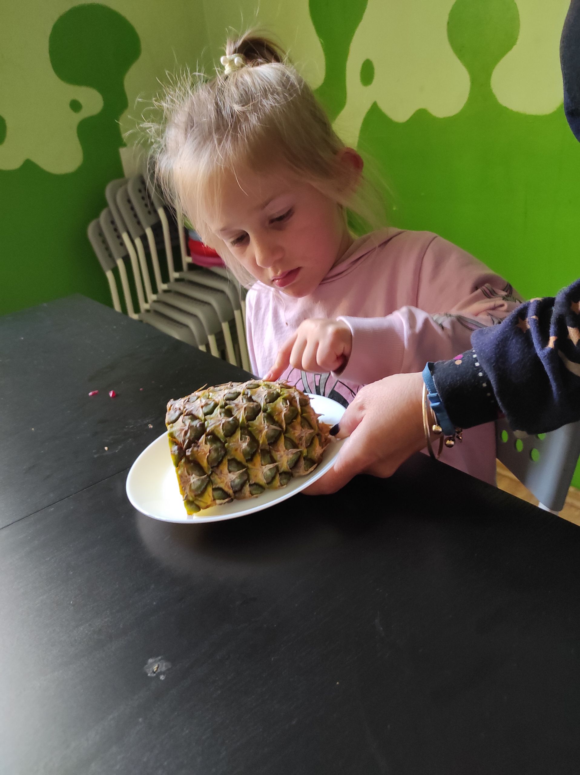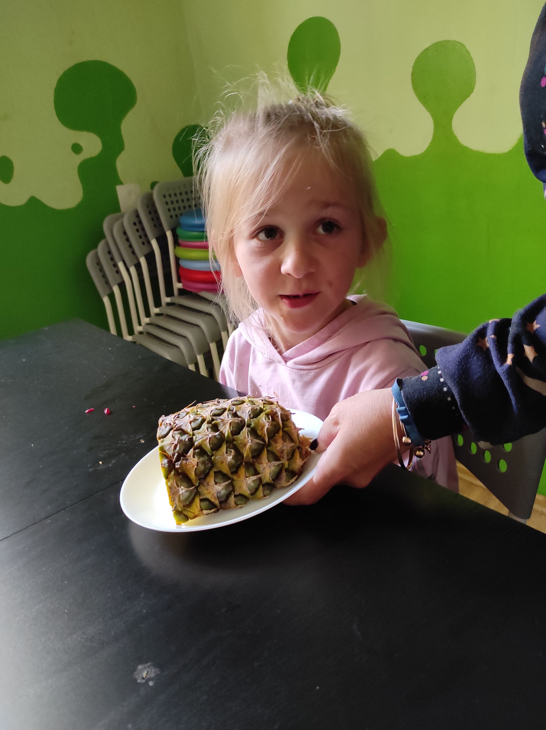 20.10.2021r. w naszym Centrum królował ananas. Dzieci ze wszystkich grup rozkoszowały się soczystym i dojrzałym ananasem. Najmłodsi poznali ananasa również sensorycznie – za pomocą dłoni; rozmawiali o jego skórce, poznawali kolory oraz dowiedzili się jak rośnie ten owoc i które jego części są jadalne. Na sam koniec był czas na degustację, która naszym dzieciakom bardzo przypadła do gustu 🙂