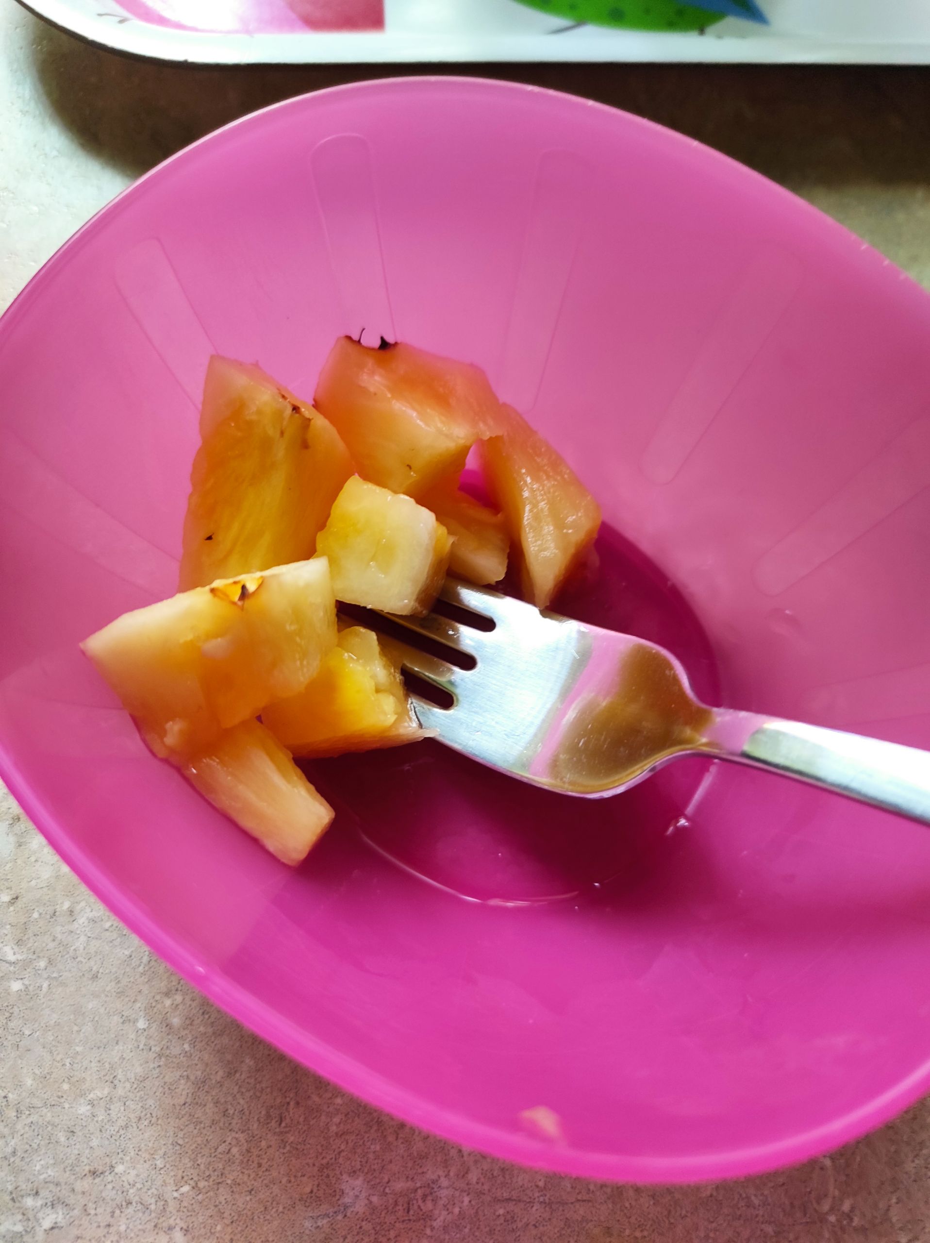 - Pokrojony ananas w różowej miseczce, obok widelec.