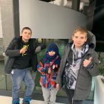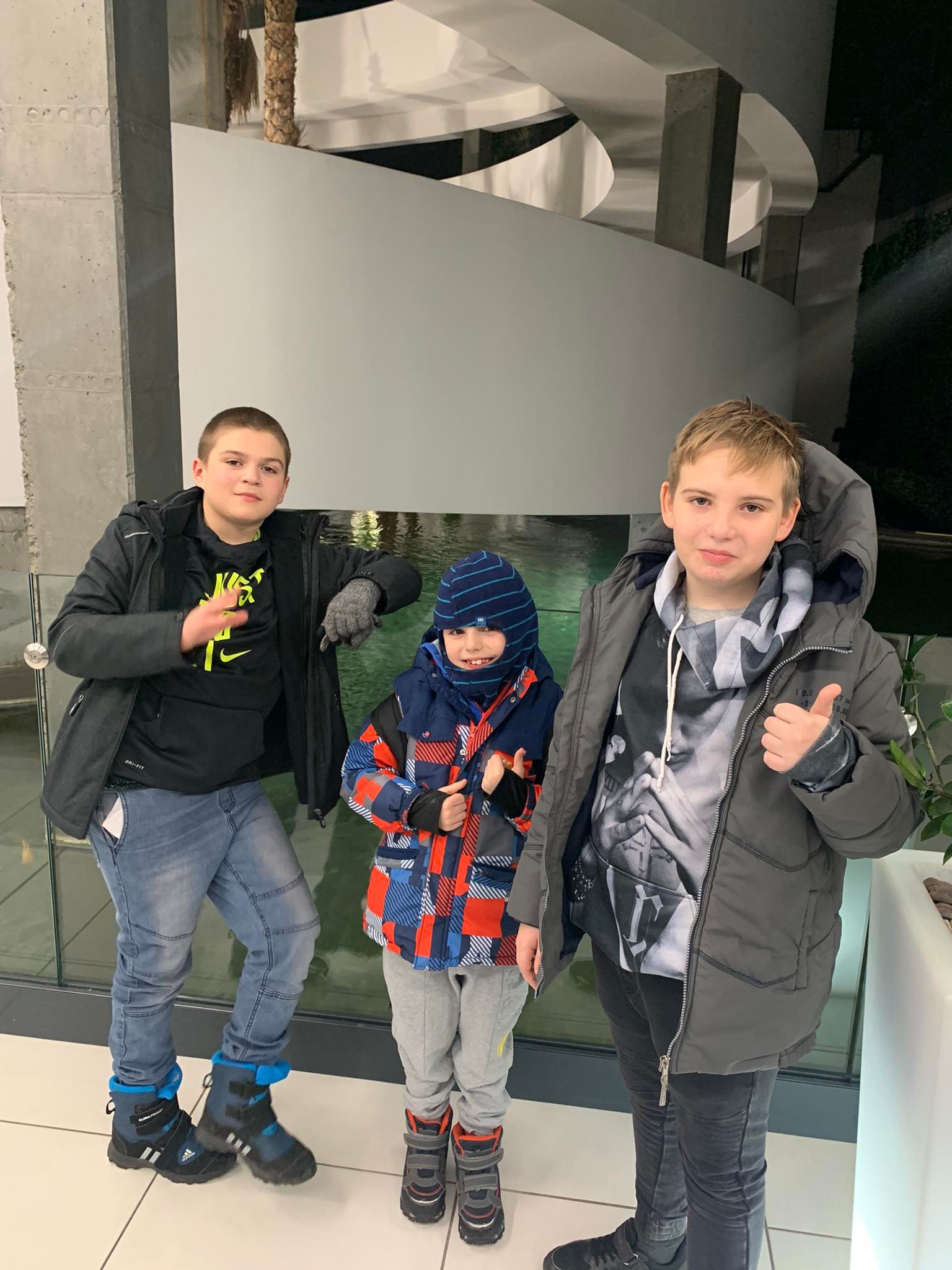 - Trójka chłopców w kurtkach, pokazują uniesione w górę kciuki.