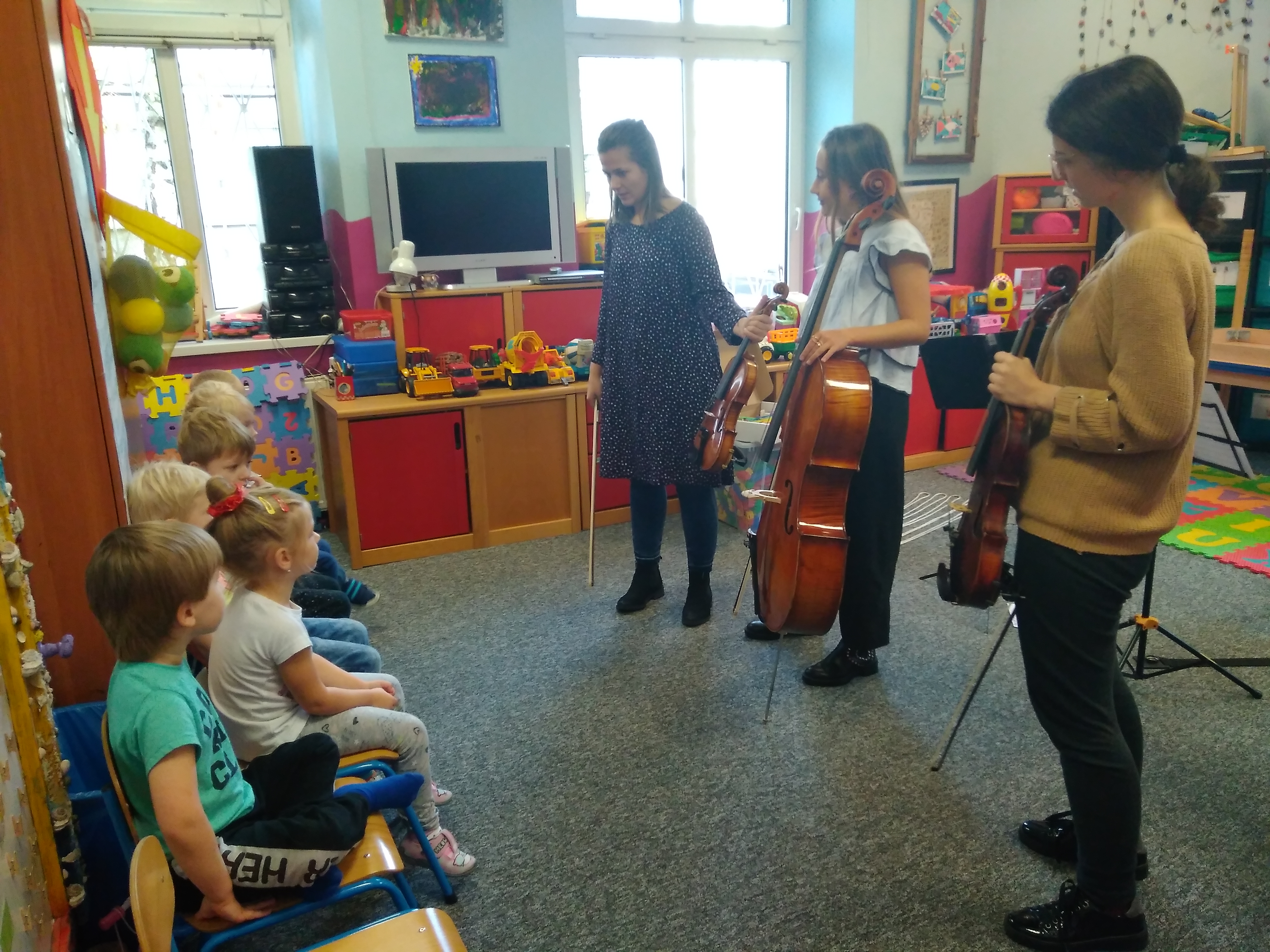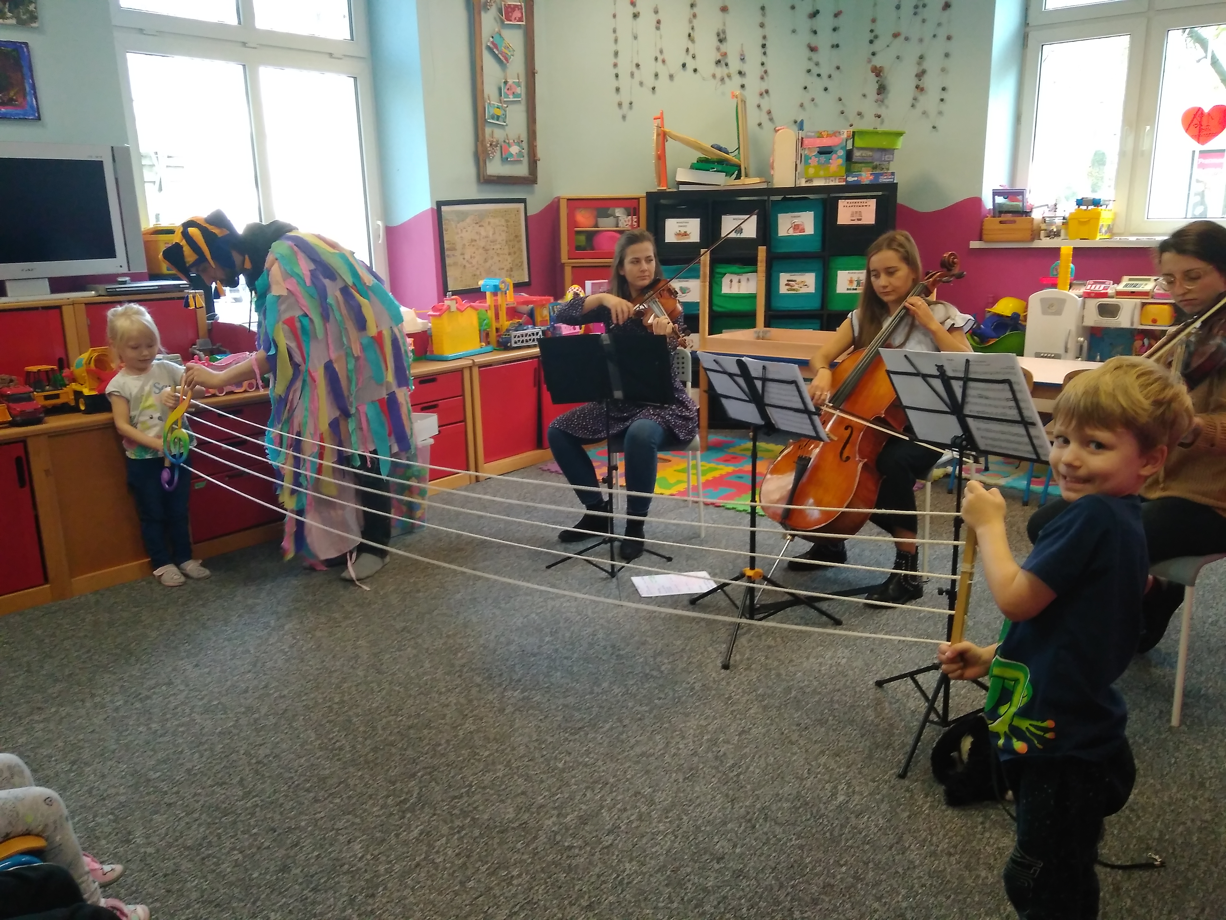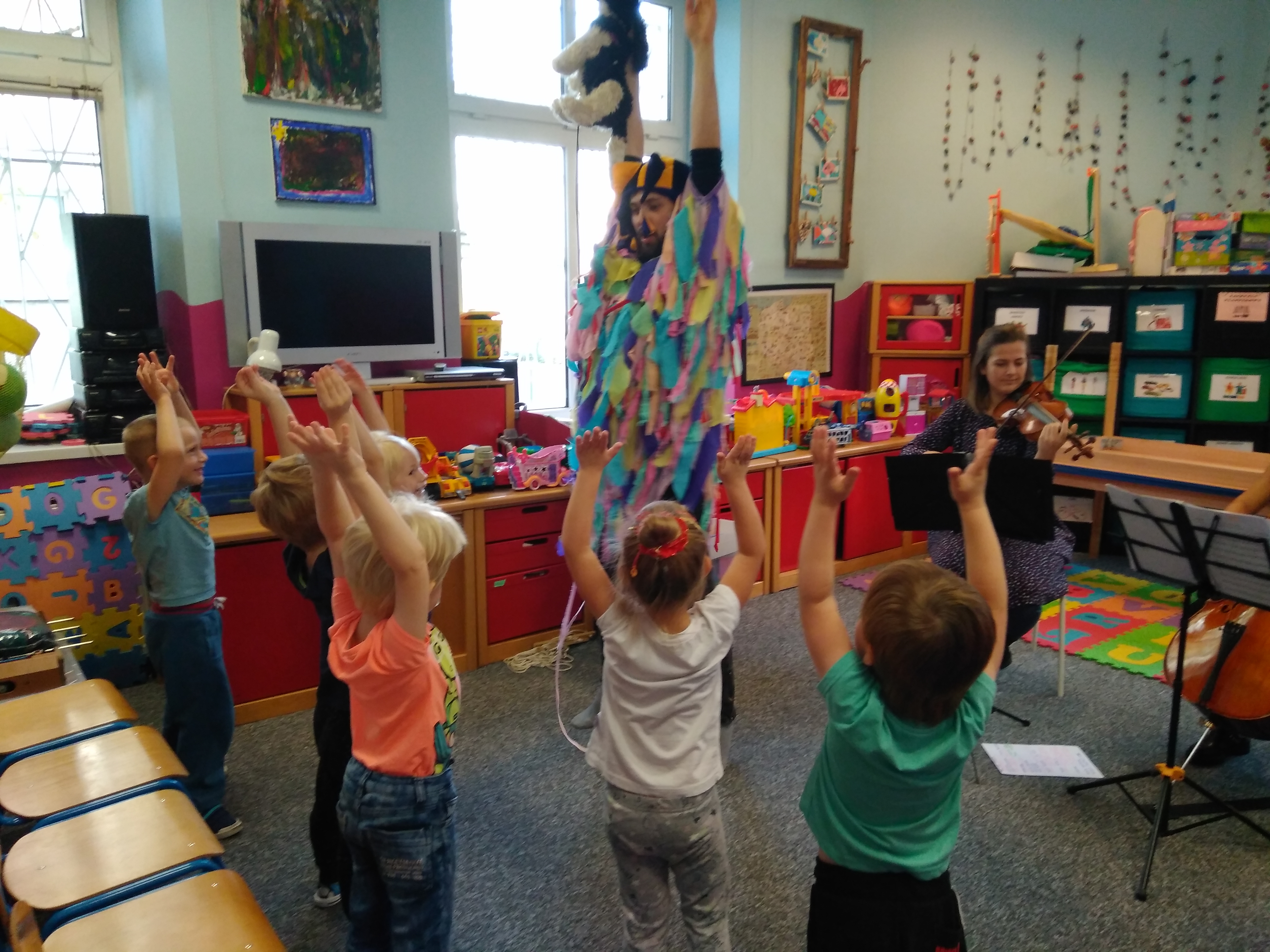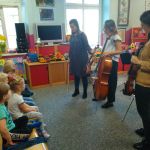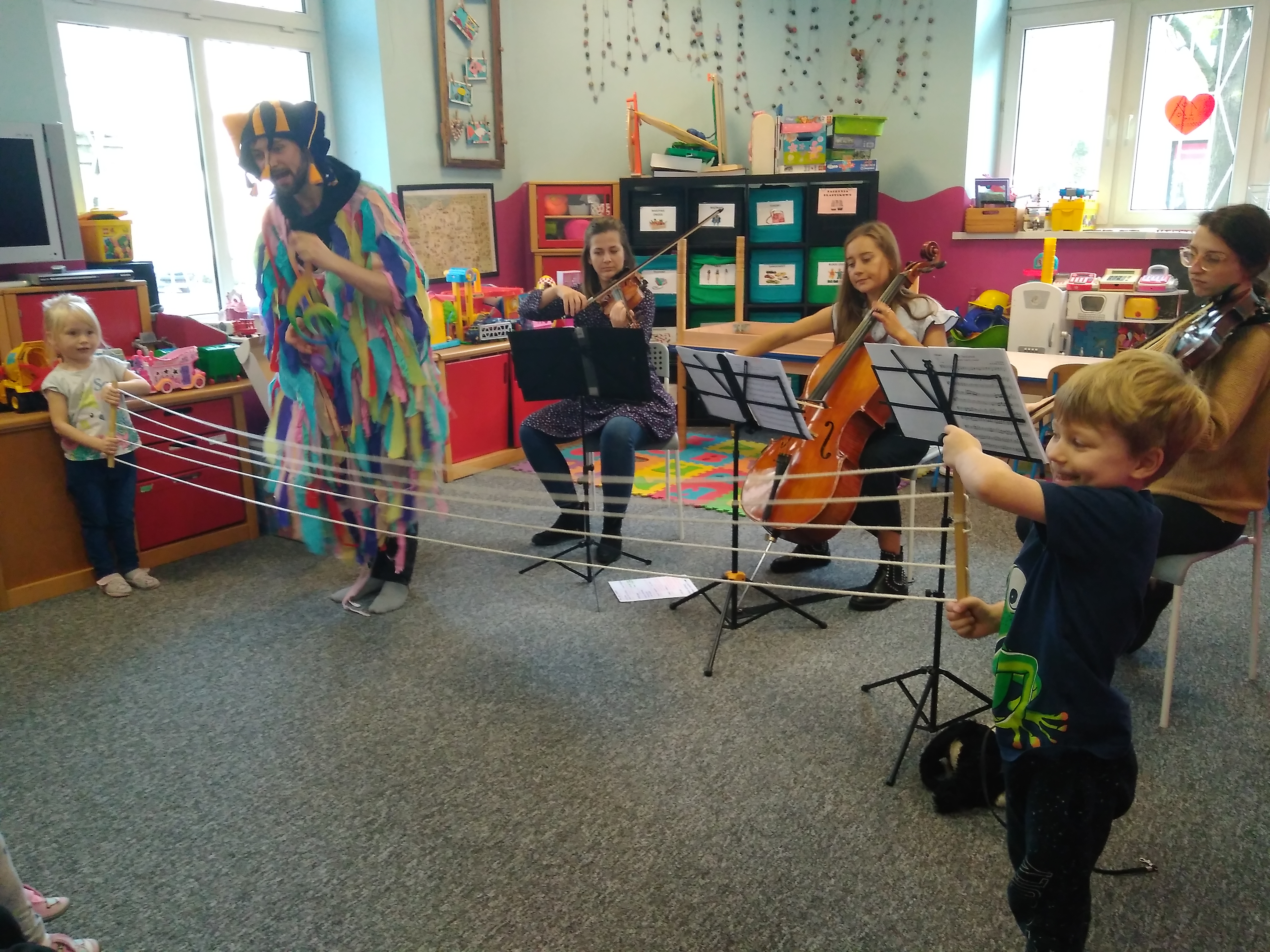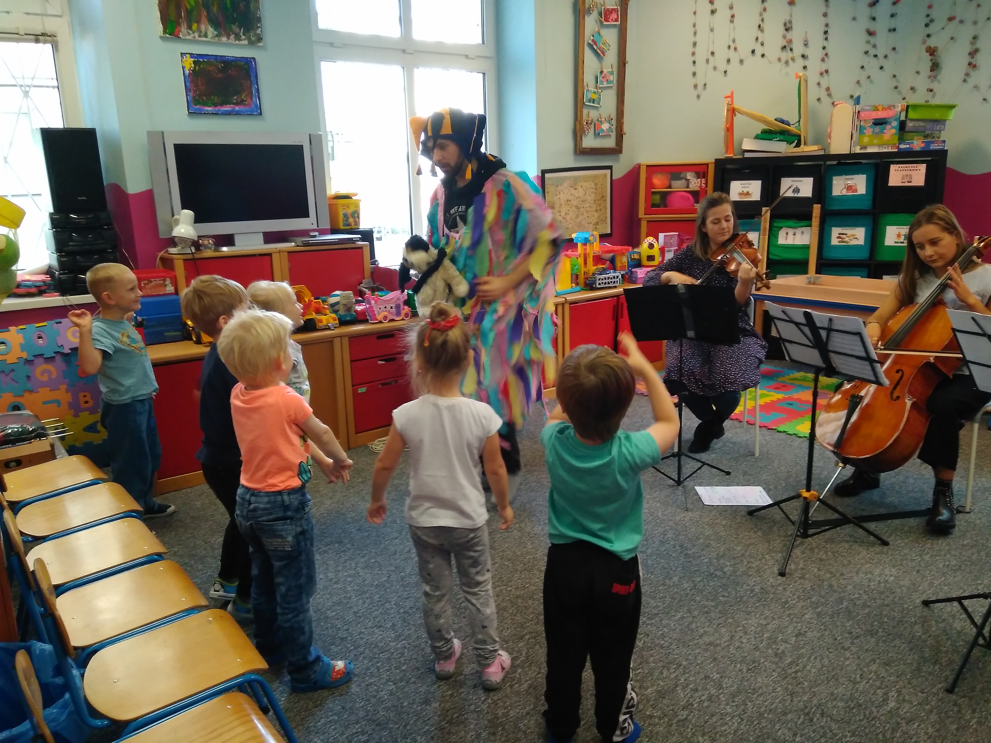 24.10.2019r. po przerwie wakacyjnej odwiedzili nas artyści. Nasza radość była ogromna! 🙂 Tym bardziej, że wyruszyliśmy w podróż z Baśnioludkiem po Krainie Muzyki. Towarzyszyły nam instrumenty smyczkowe: skrzypce, altówka i wiolonczela. Nasze spotkania z muzyką klasyczną nigdy nie są nudne, zawsze świetnie się bawimy, tańczymy i bardzo dużo uczymy. Dziękujemy naszym artystom i już nie możemy się doczekać kolejnego spotkania 🙂