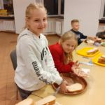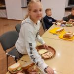 - Dziewczynka sięga po warzywa, które położy na wykonanej przez siebie kanapce. Przed nią leży talerz pełen przygotowanych do wydania kanapek. W tle siedzą chłopcy, którzy również przygotowuja kanapki