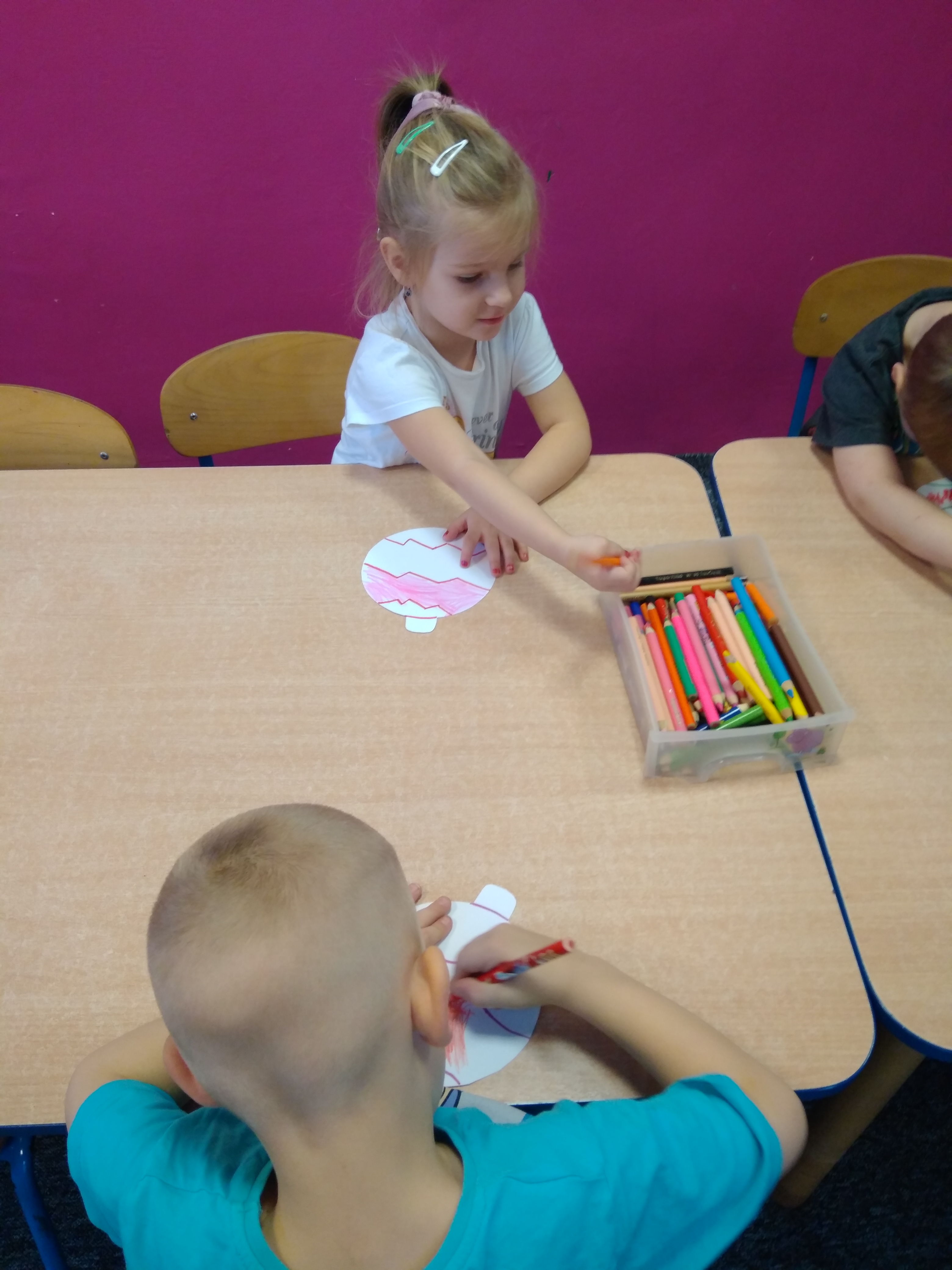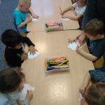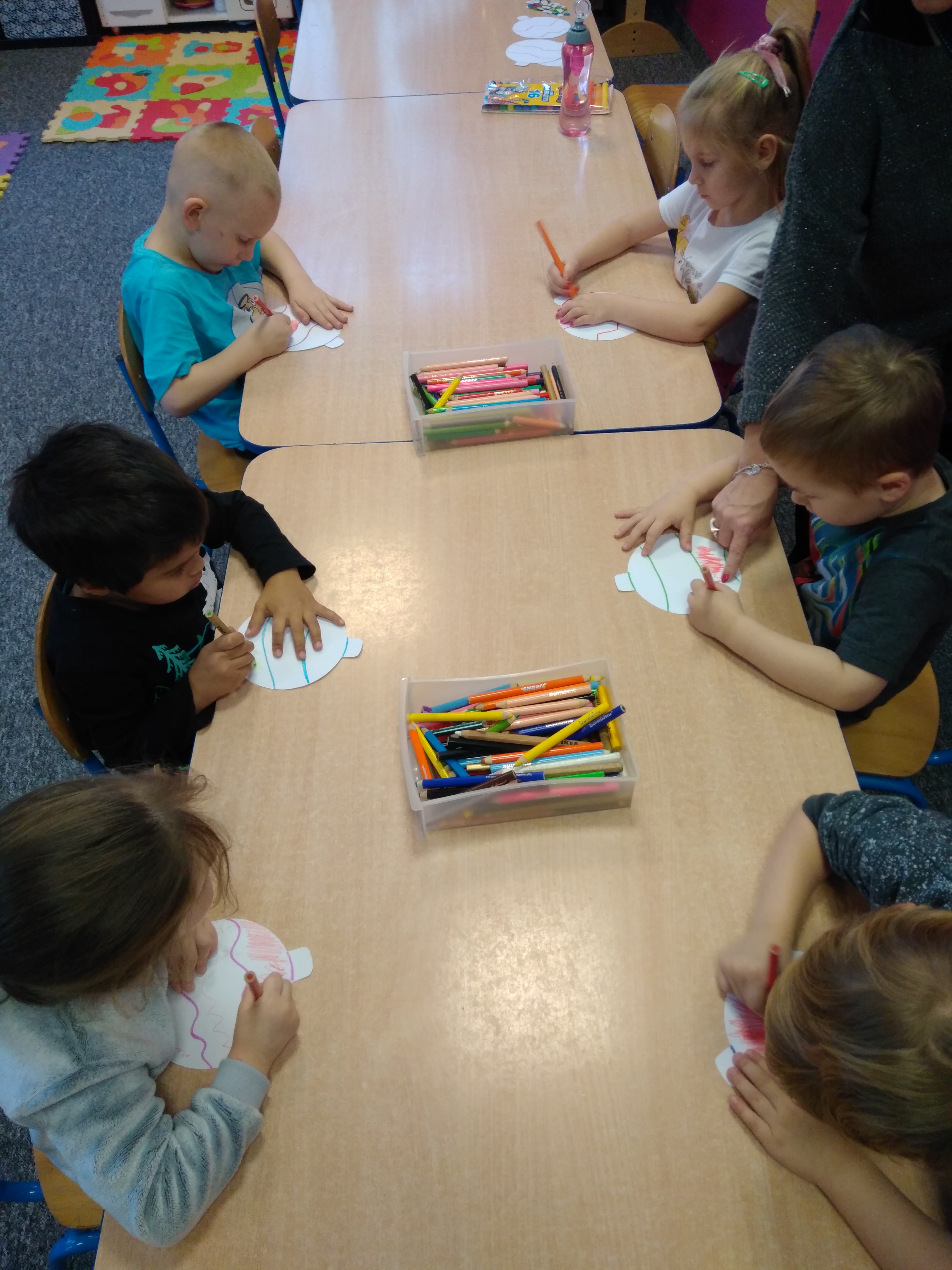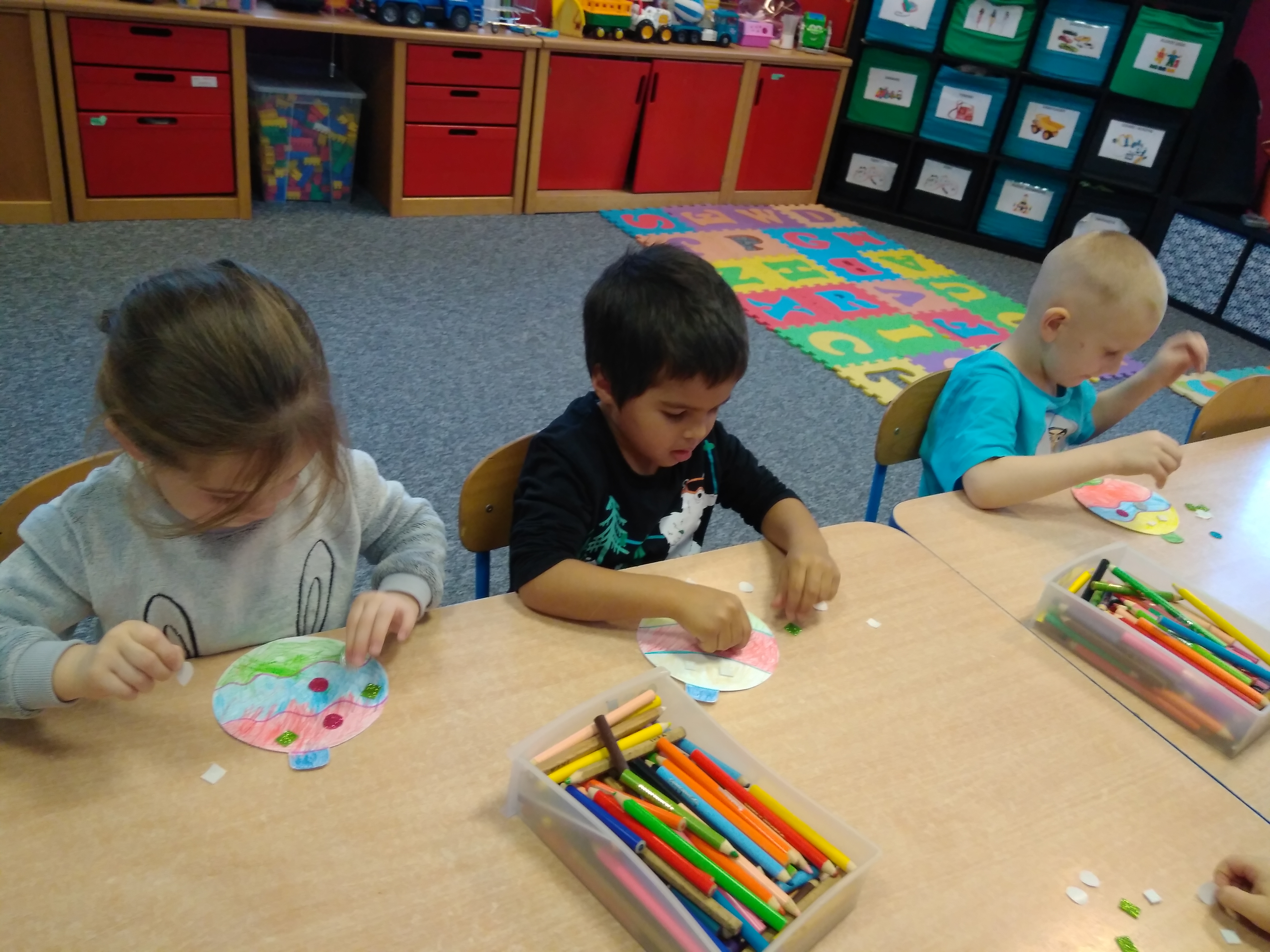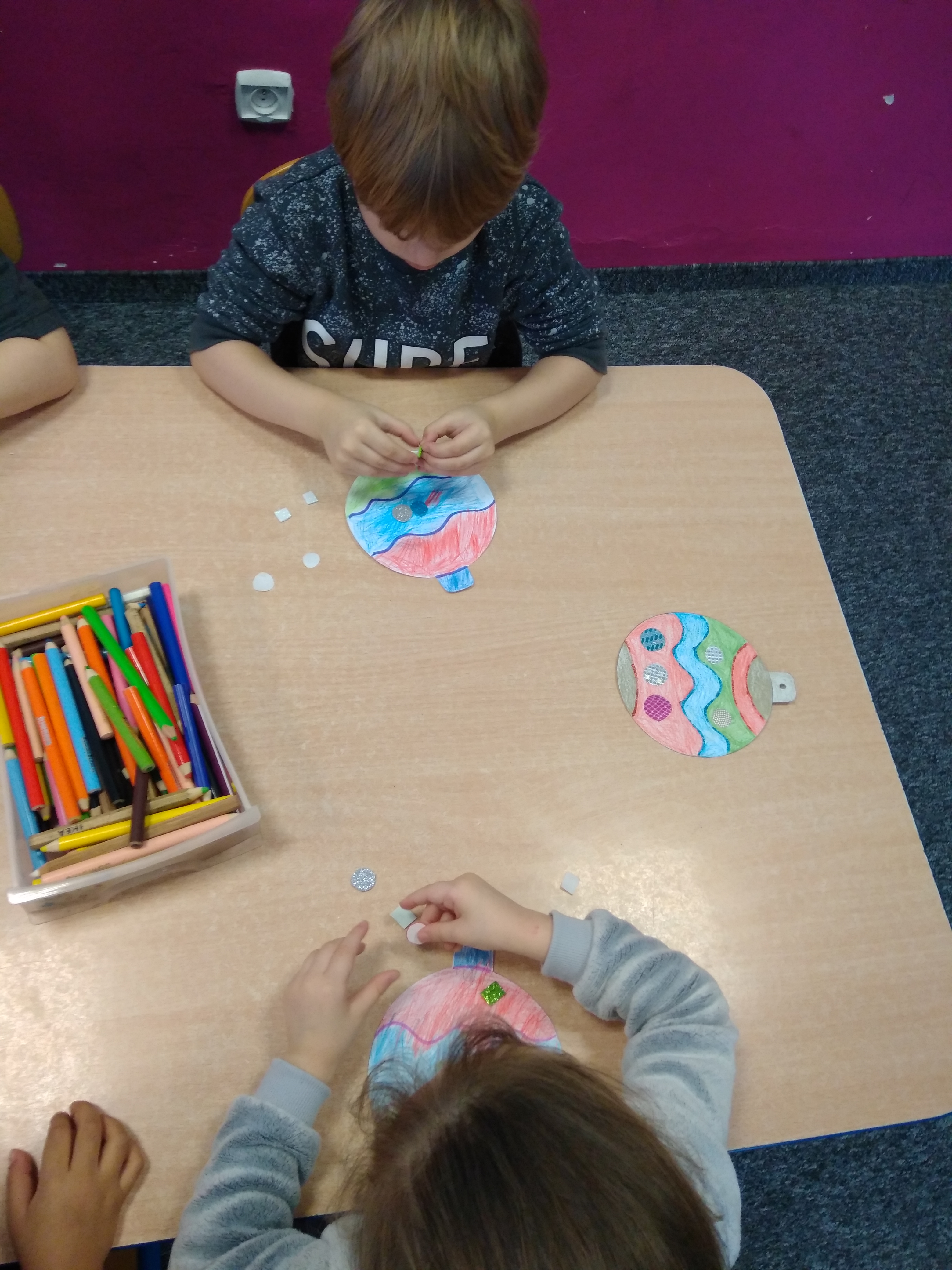 - Grupa dzieci siedzi przy stoliku i koloruje papierowe bombki.