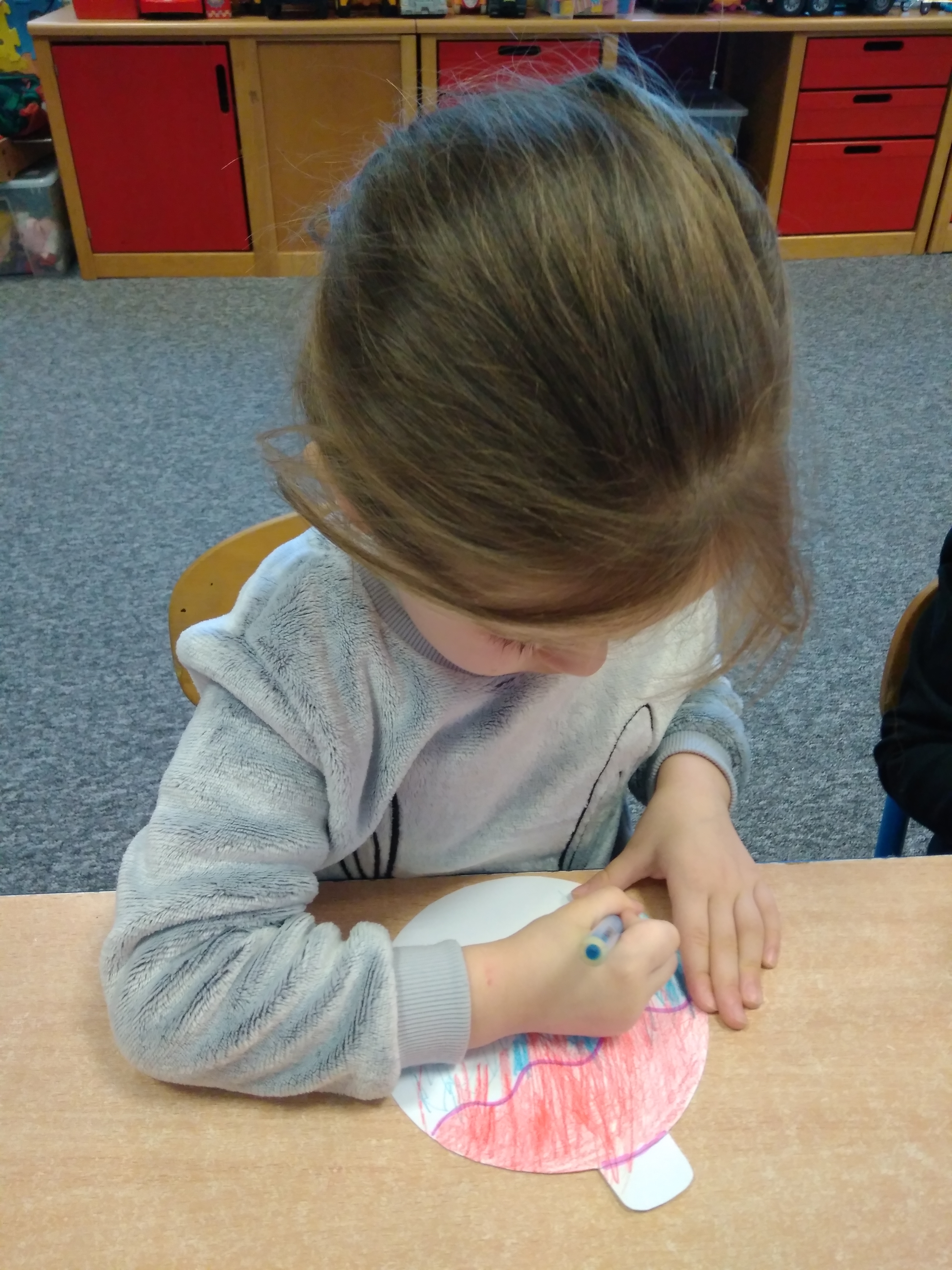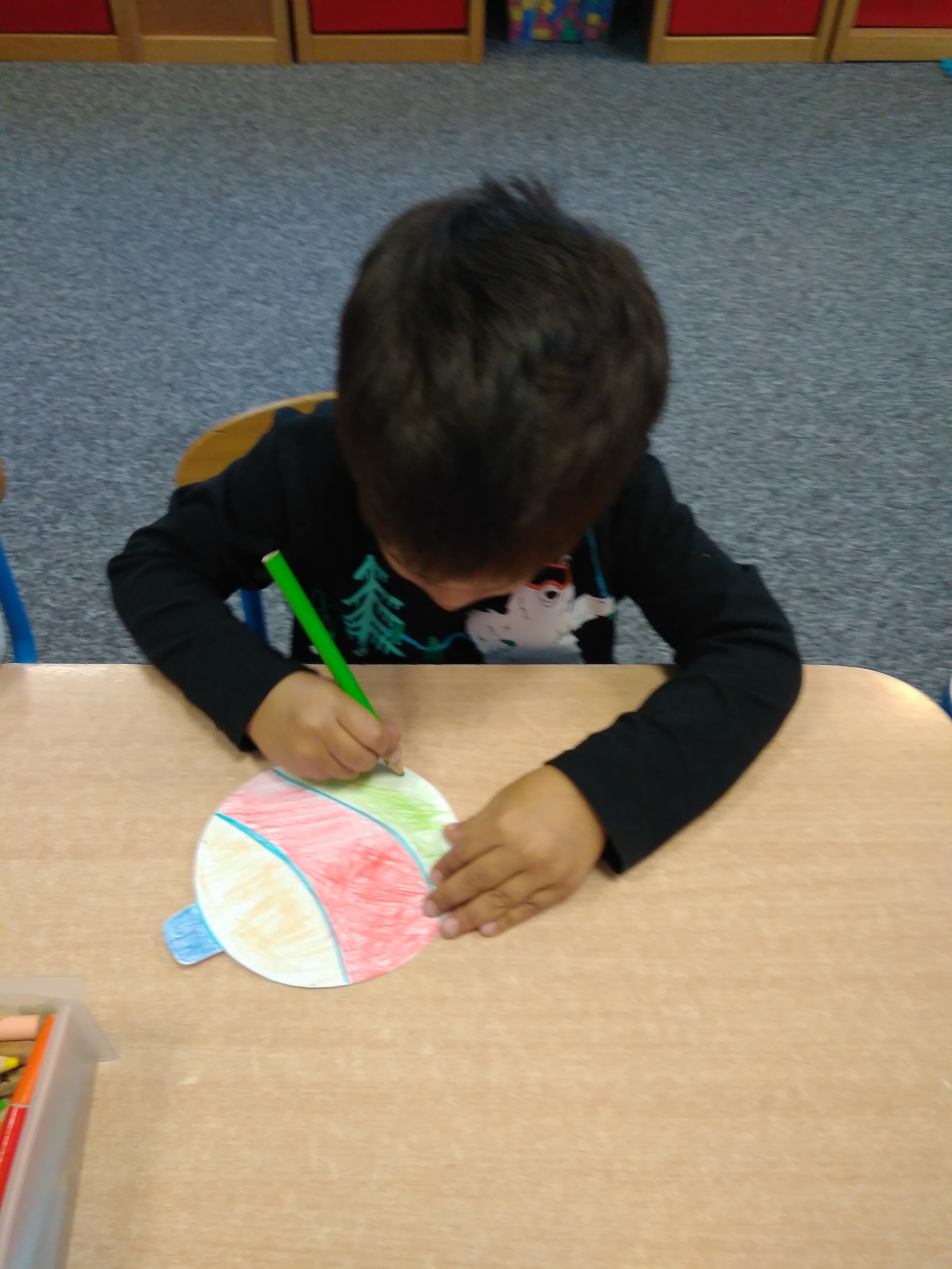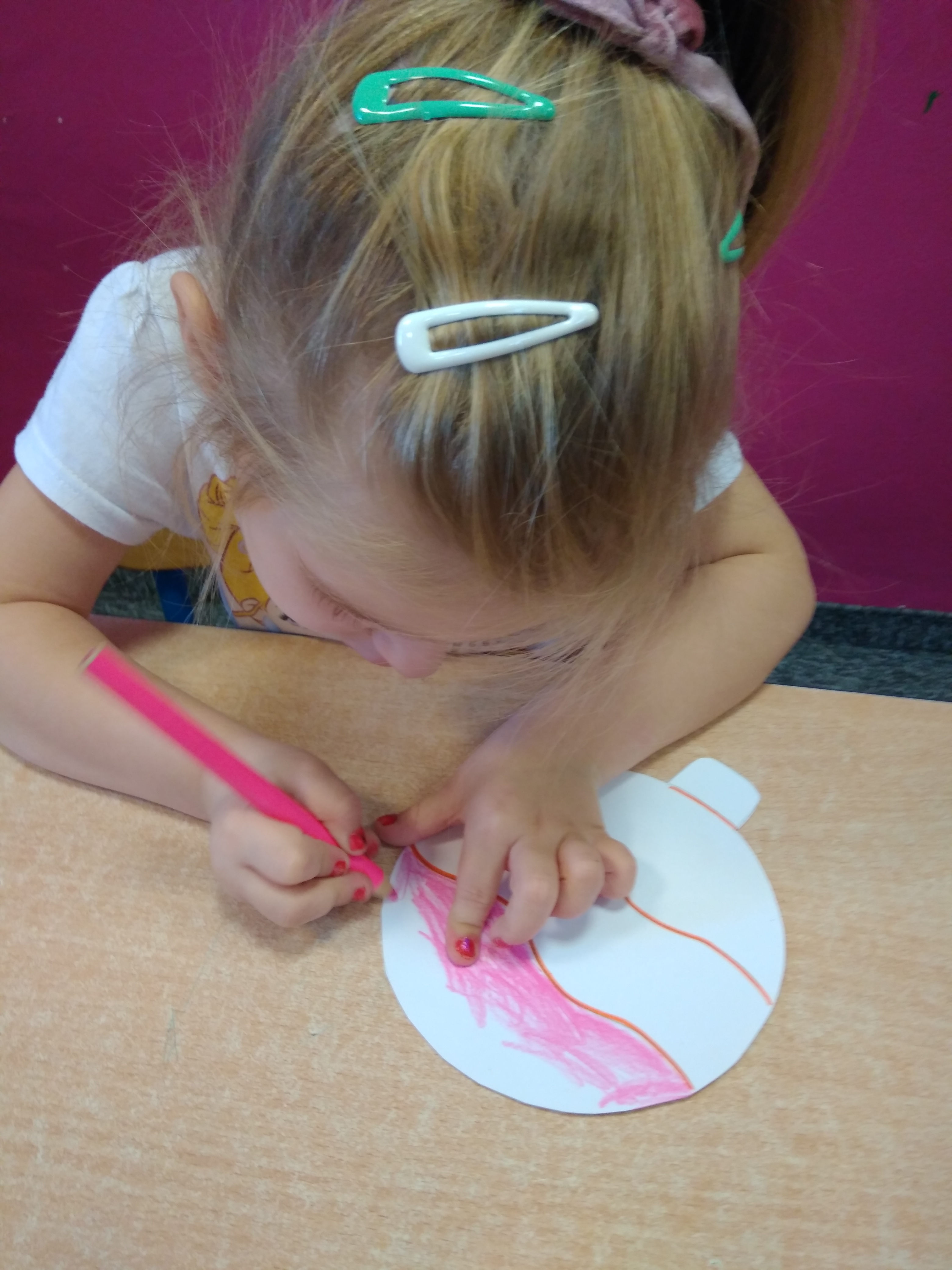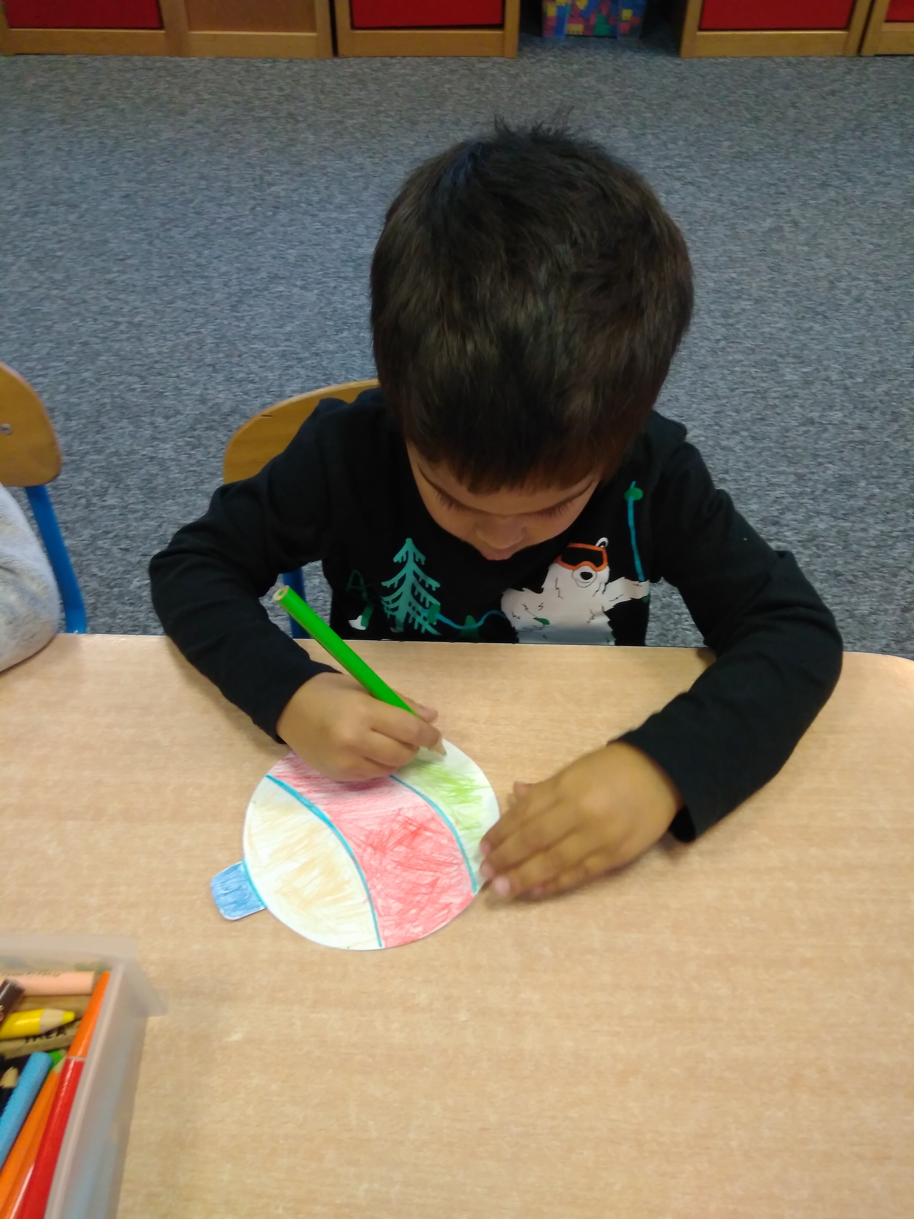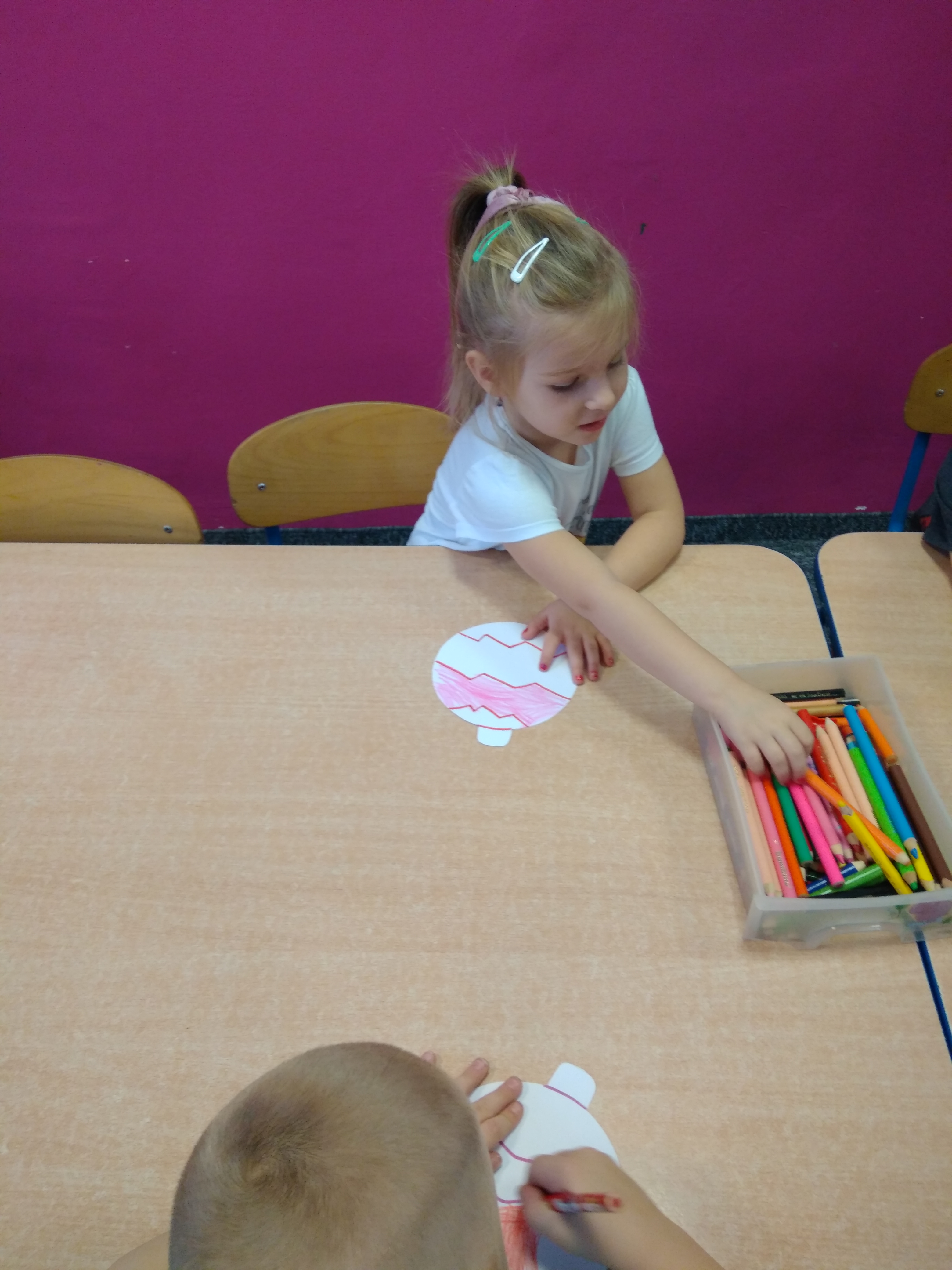 - Grupa dzieci siedzi przy stoliku i koloruje papierowe bombki.