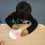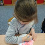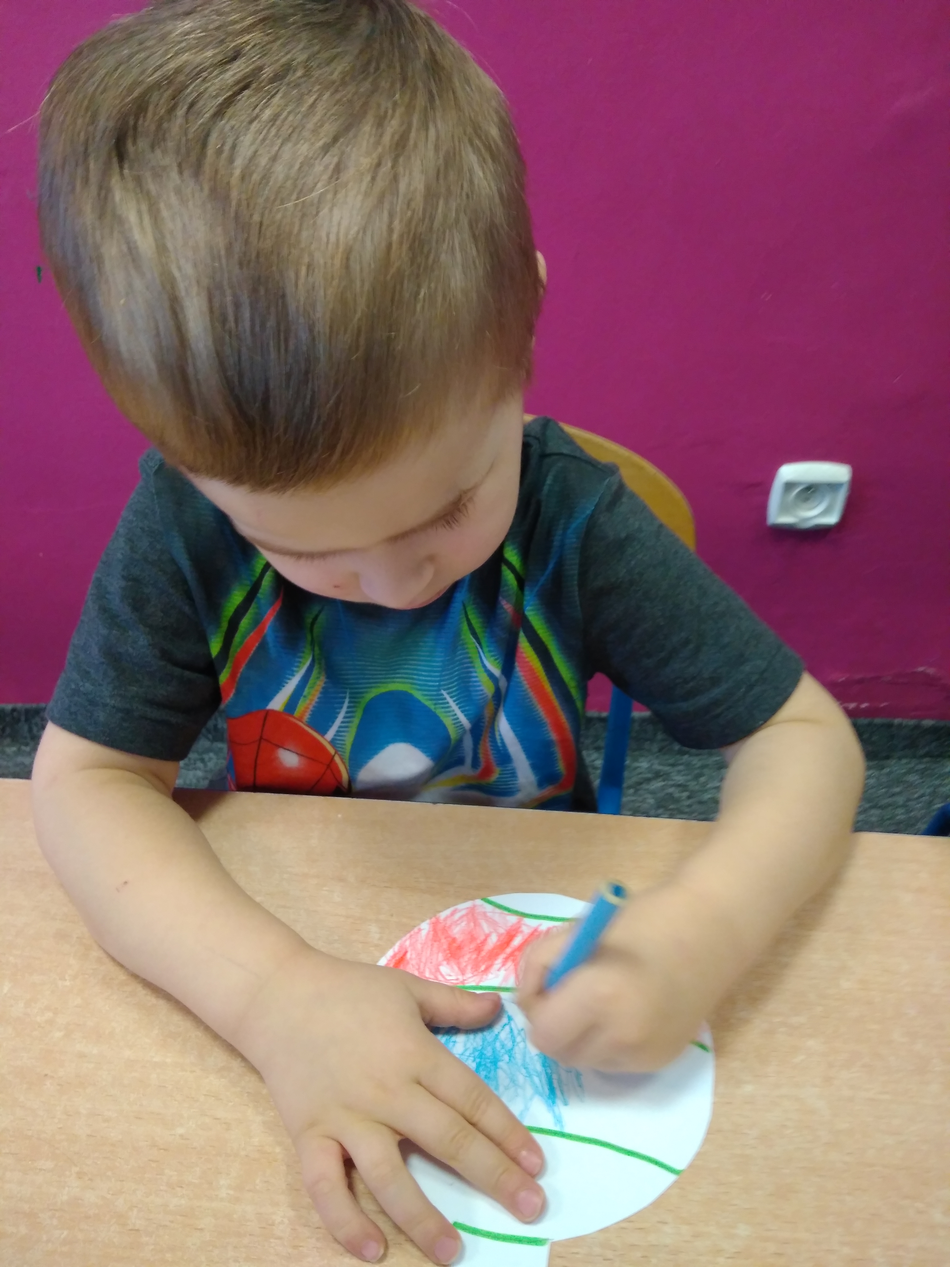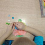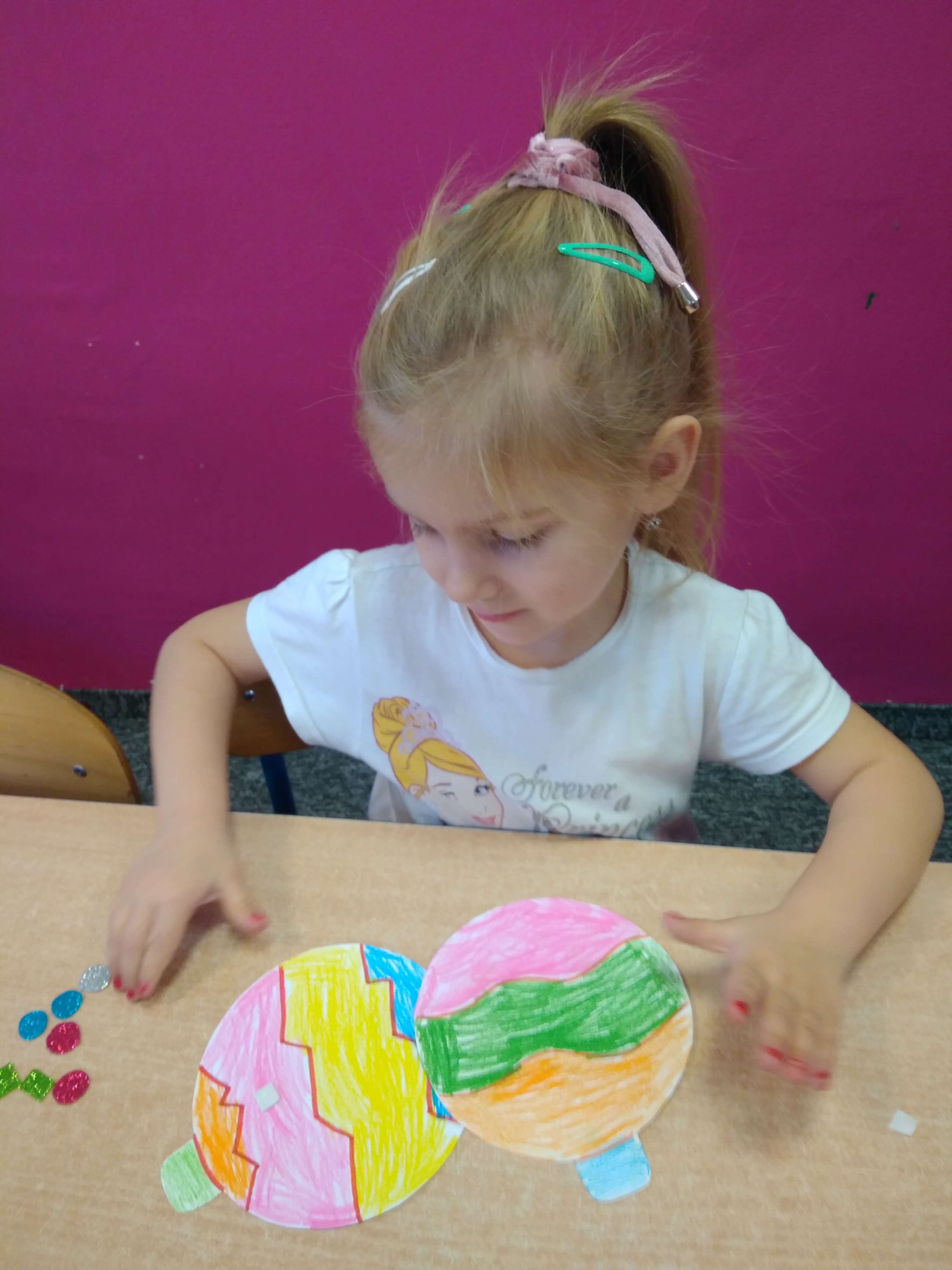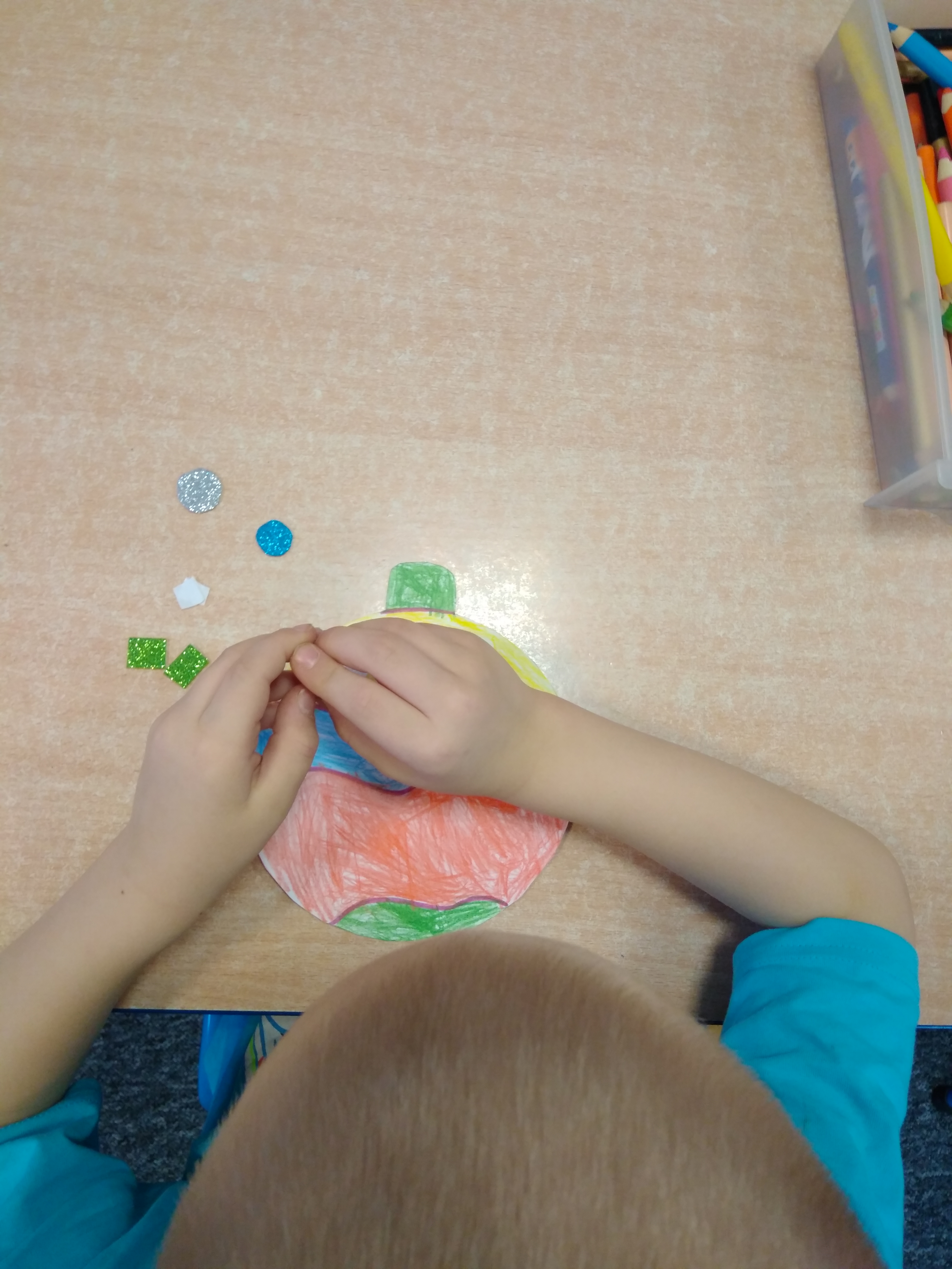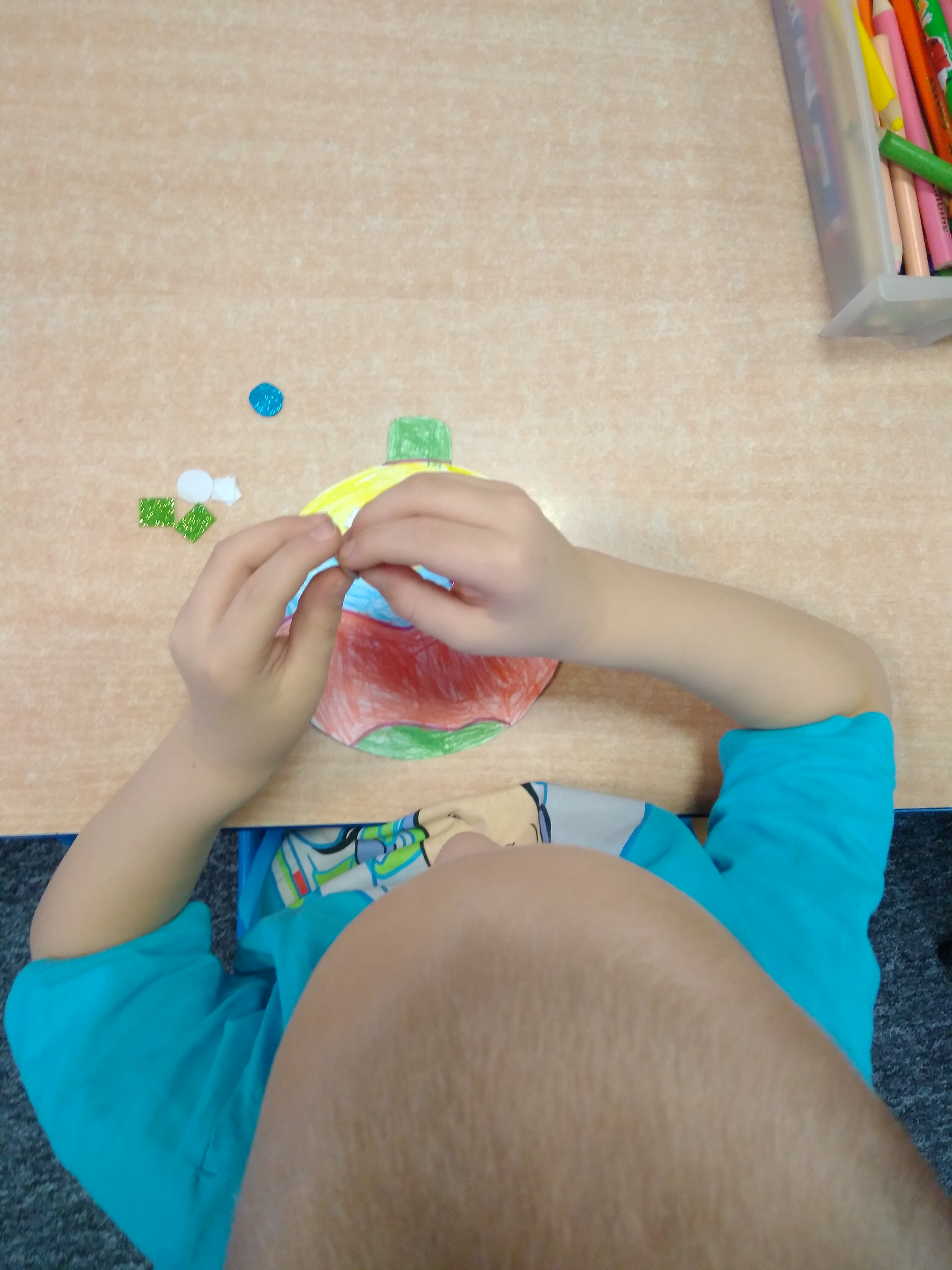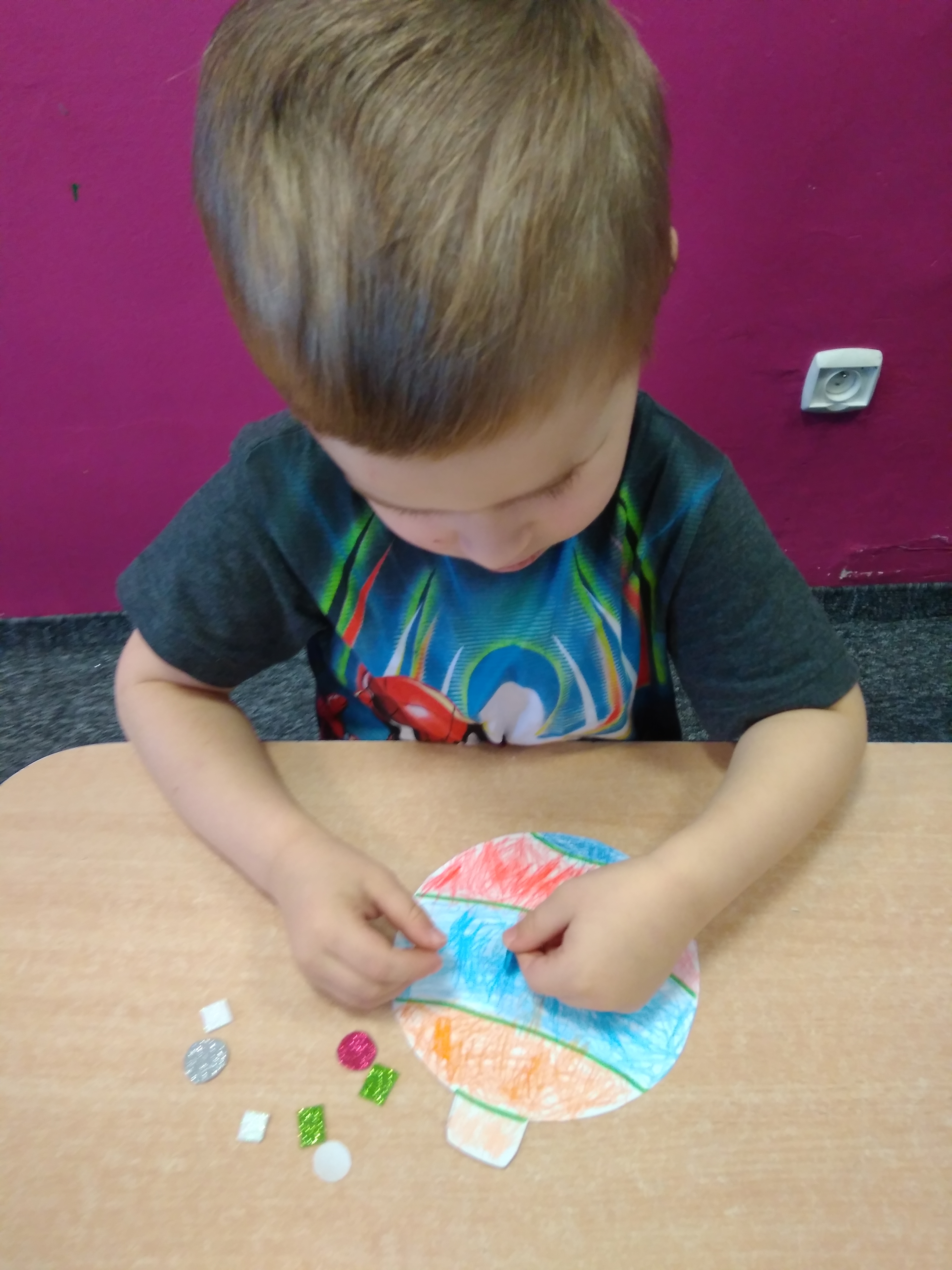 - Chłopiec przykleja brokatowe naklejki.