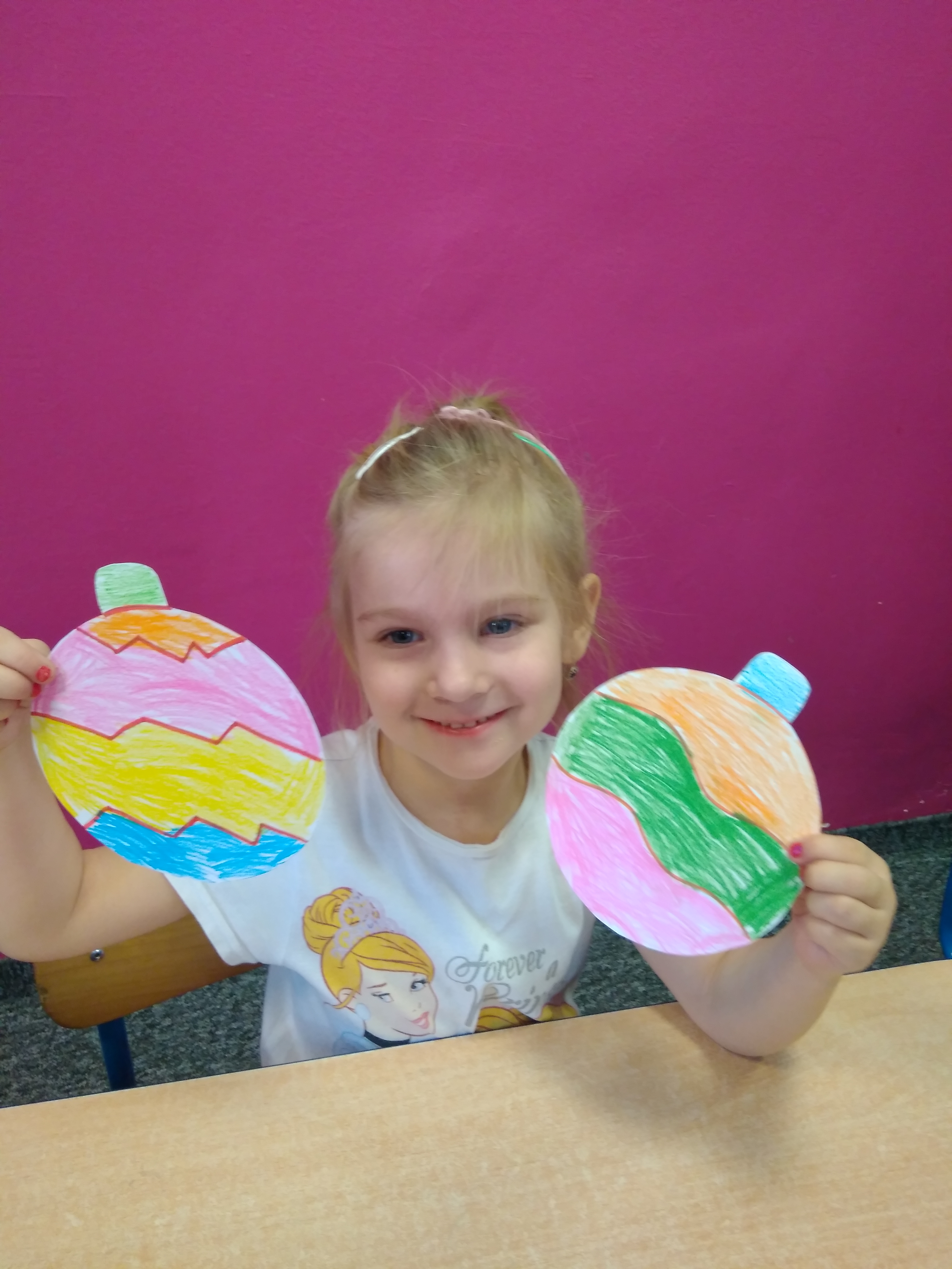 - Uśmiehnięta dziewczynka podnosi kolorowe bombki z papieru.