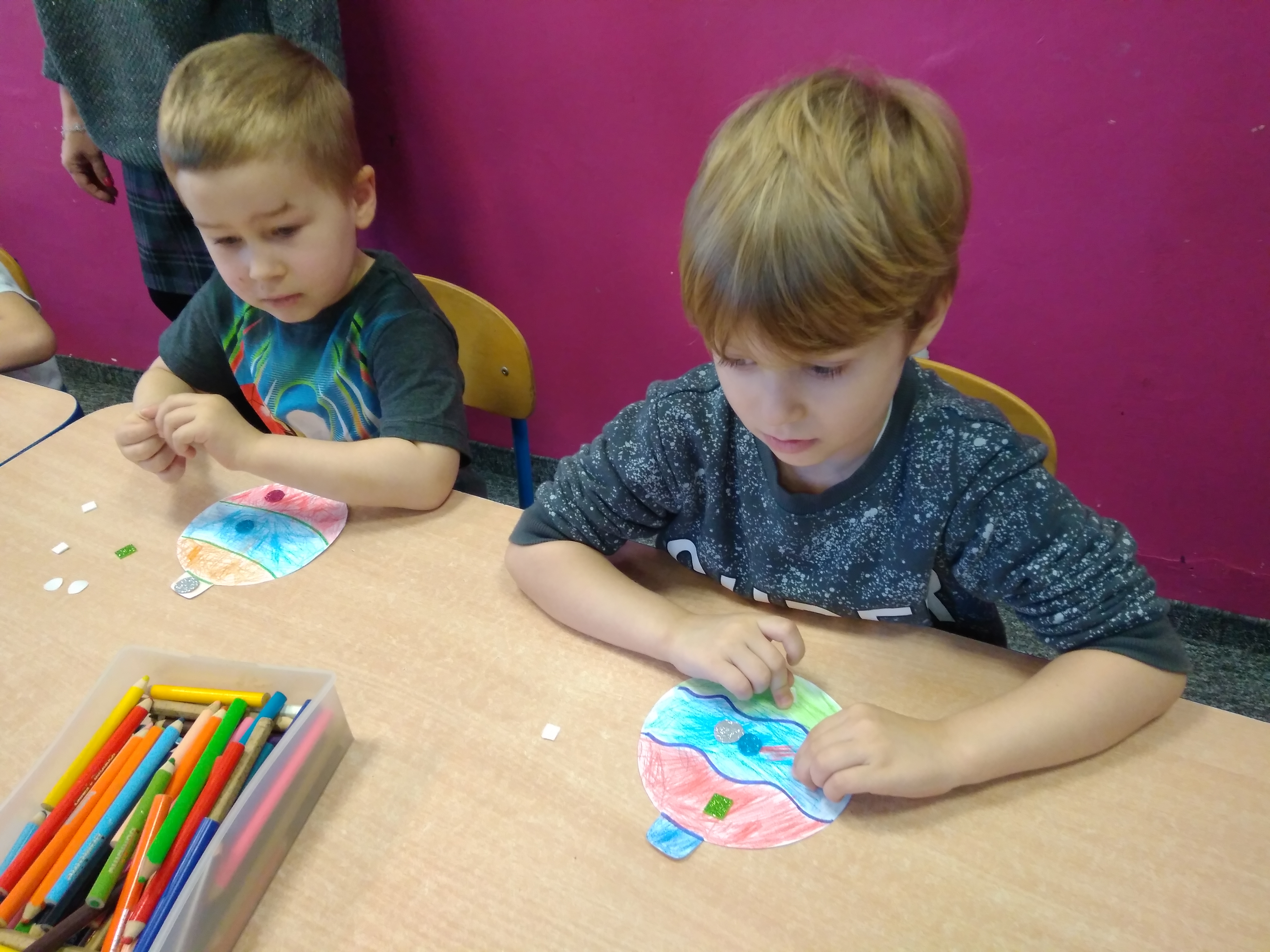 Nasza najmłodsza grupa – „Radosne Krasnale” również zadbała o piękny wystrój naszego Centrum na okres Świąt Bożego Narodzenia. 17.12.2019r. dzieci przygotowały kolorowe bombki z brokatowymi elementami. Znowu zabawa i przyjemność były przednie, a przy tym została wykonana wspaniała praca rozwojowa dla poszerzenia kompetencji i umiejętności maluchów.