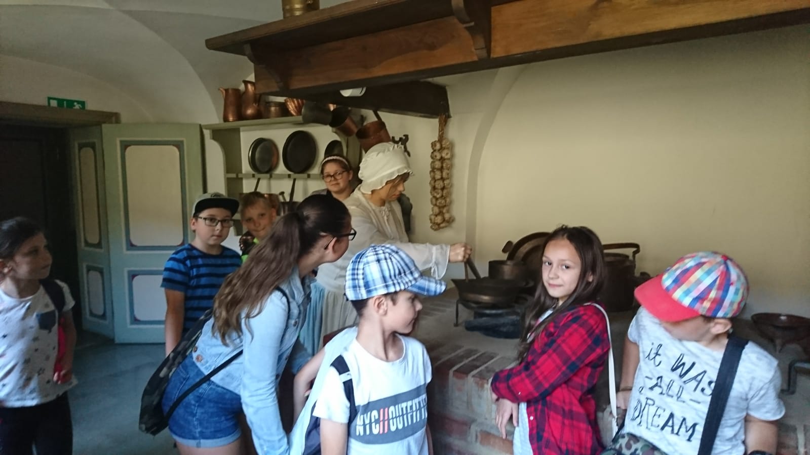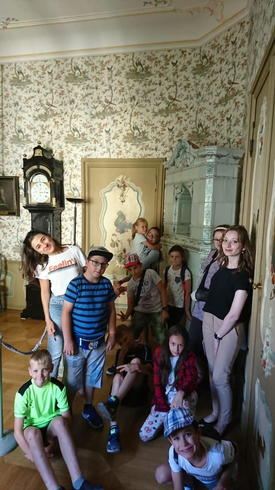 - Grupa dzieci z dwiema wolontariuszkami pozuje w zabytkowym pokoju. Za nimi stoi zdobiony piec kaflowy oraz wiekowy zegar.