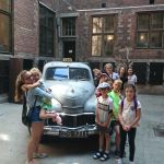 - Grupa zadowolonych dzieci stoi dookoła zabytkowego auta. Starsza koleżanka trzyma młodszą na rękach.