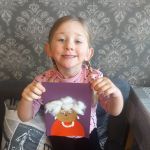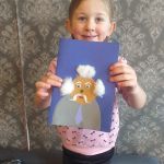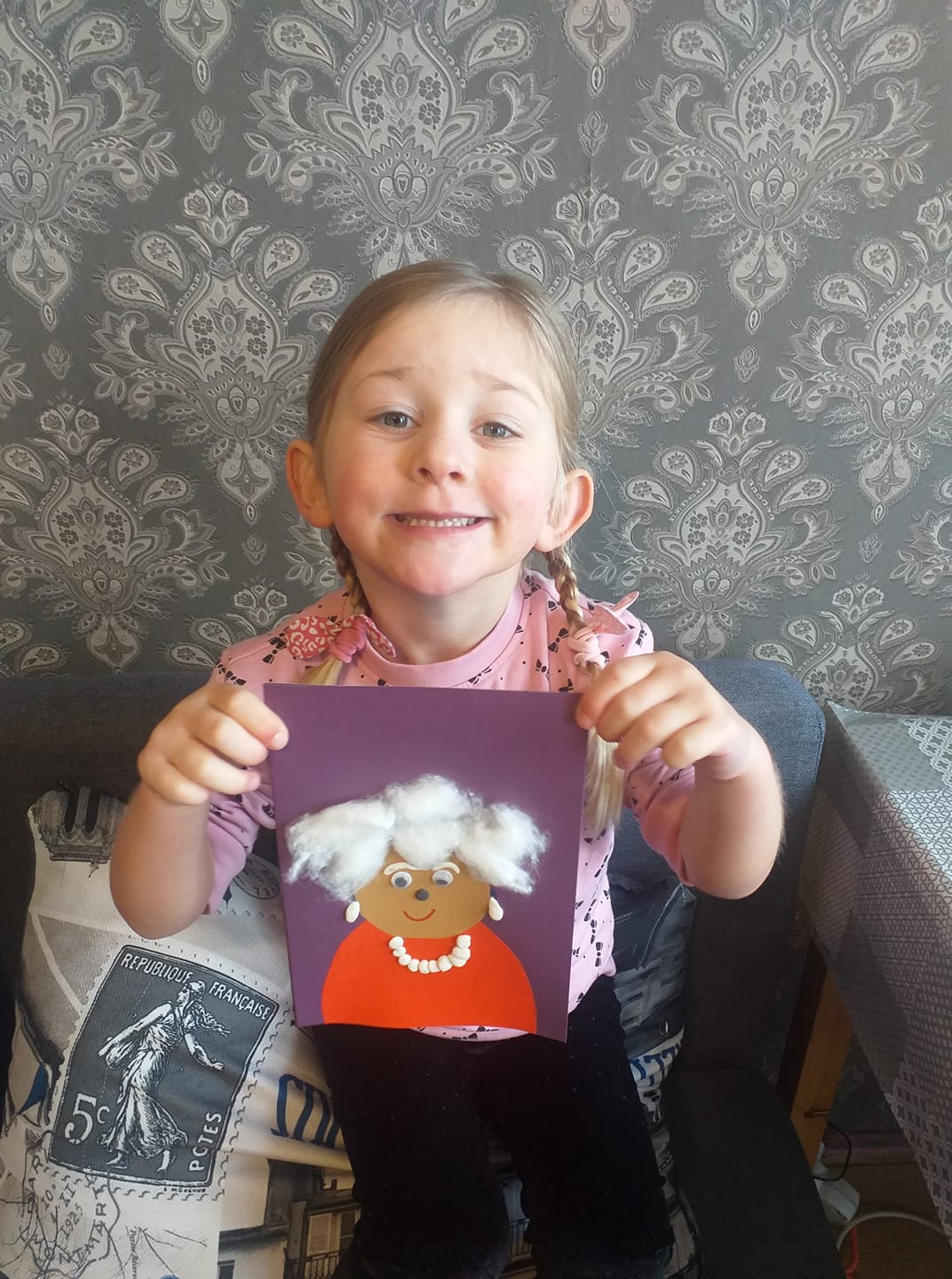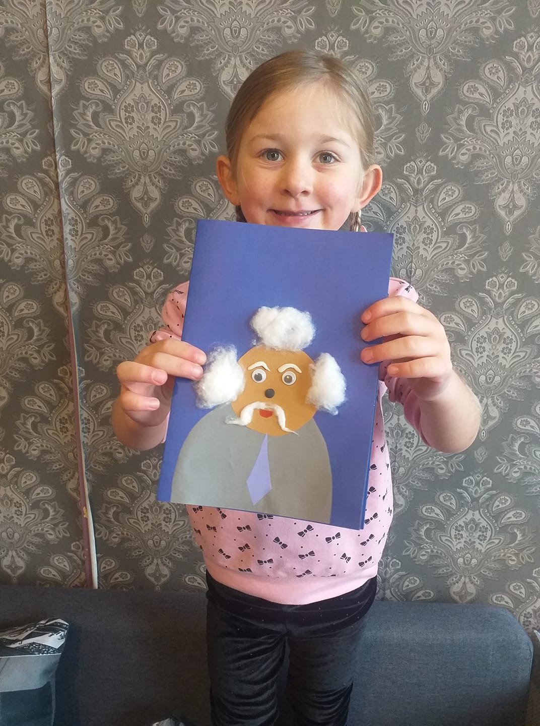 - Uśmiechnięta dziewczynka trzyma pracę plastyczną przedstawiającą dziadka.