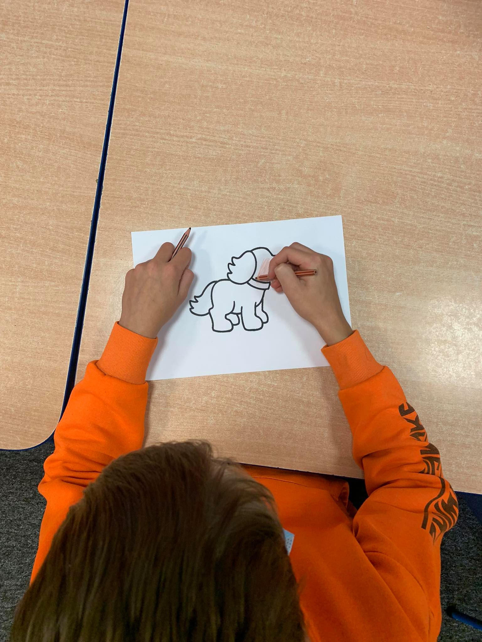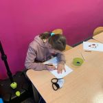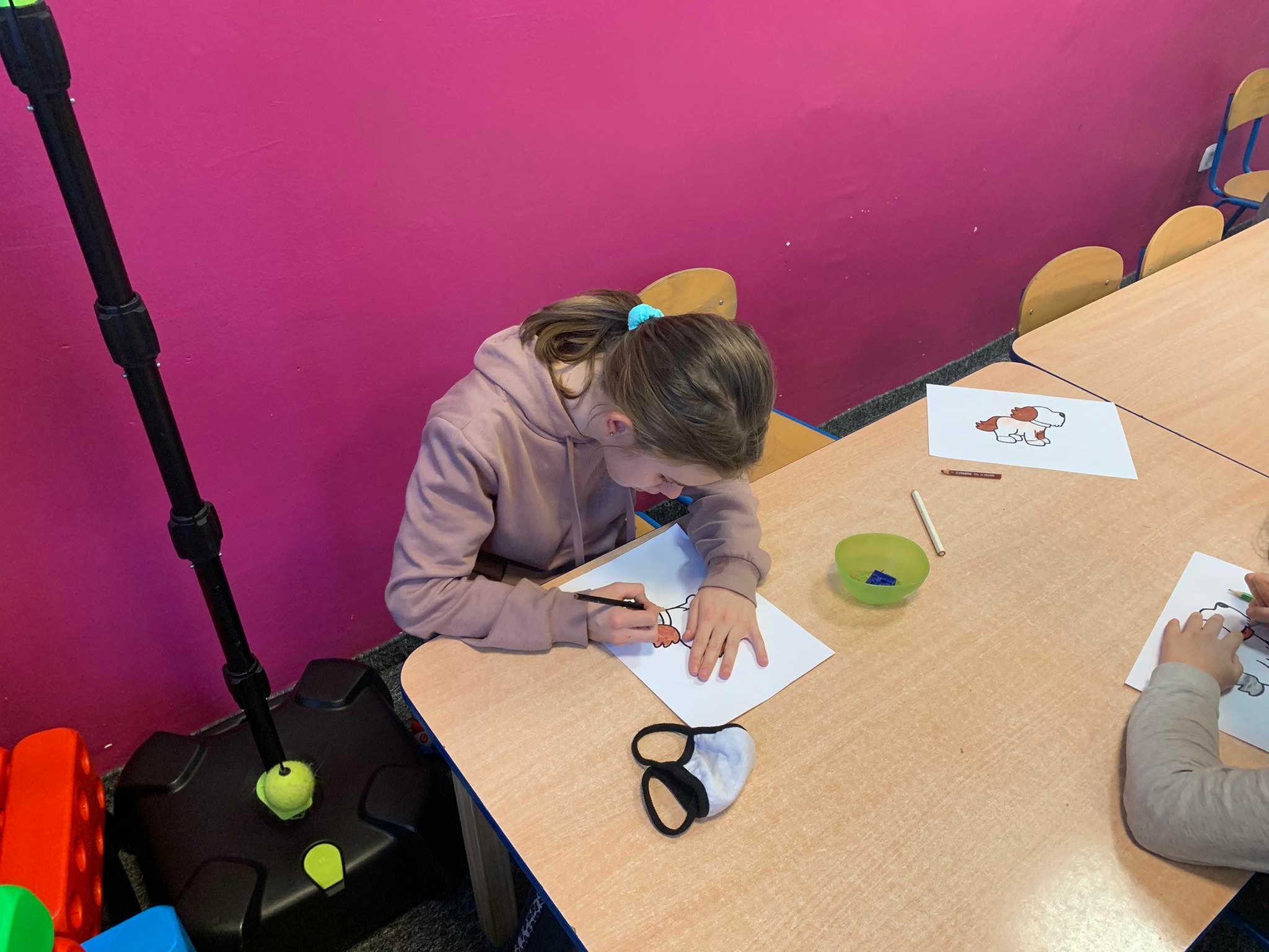 - Chłopiec siedzi przy stole i koloruje kolorowankę przedstawiającą psa.