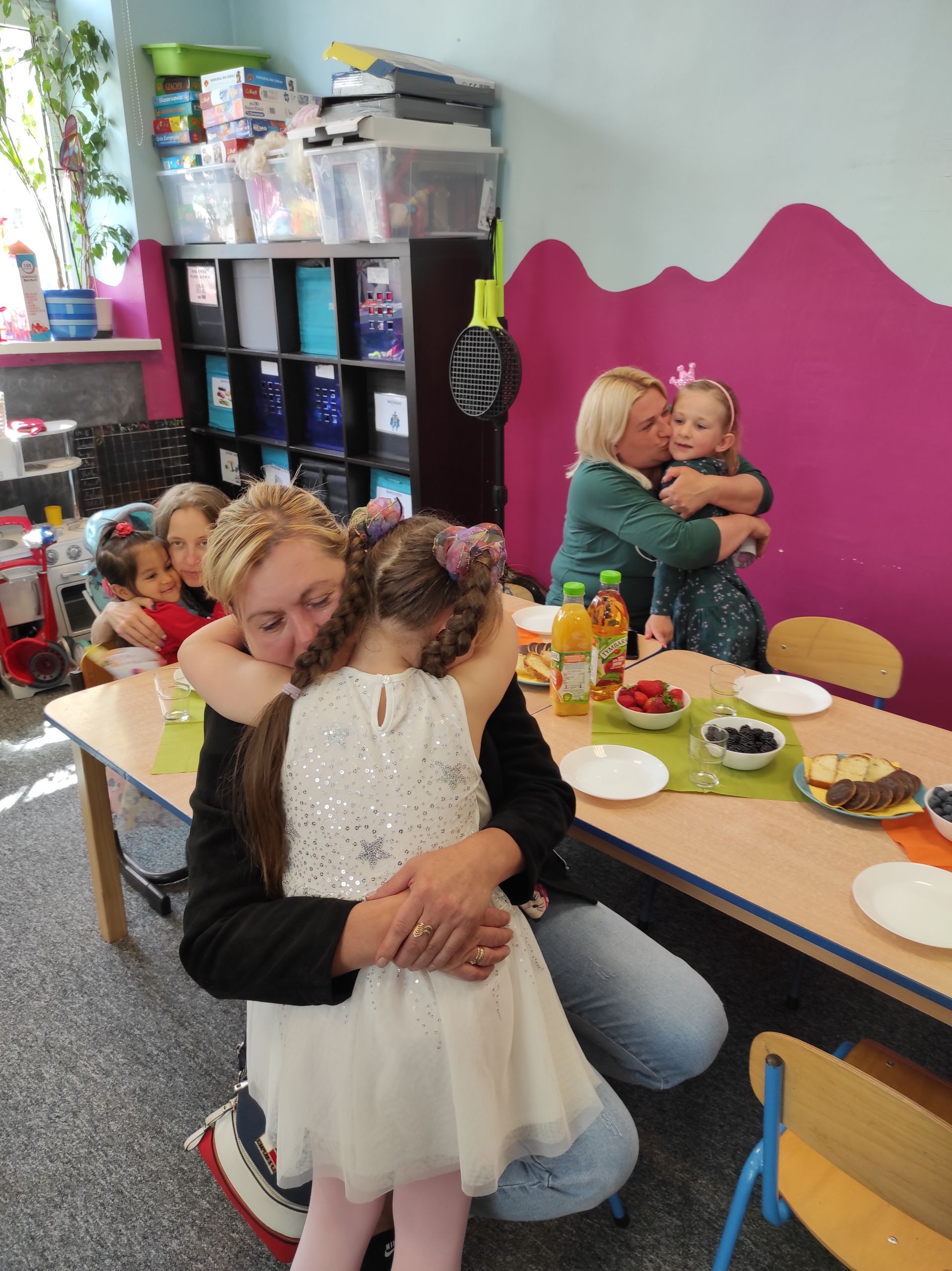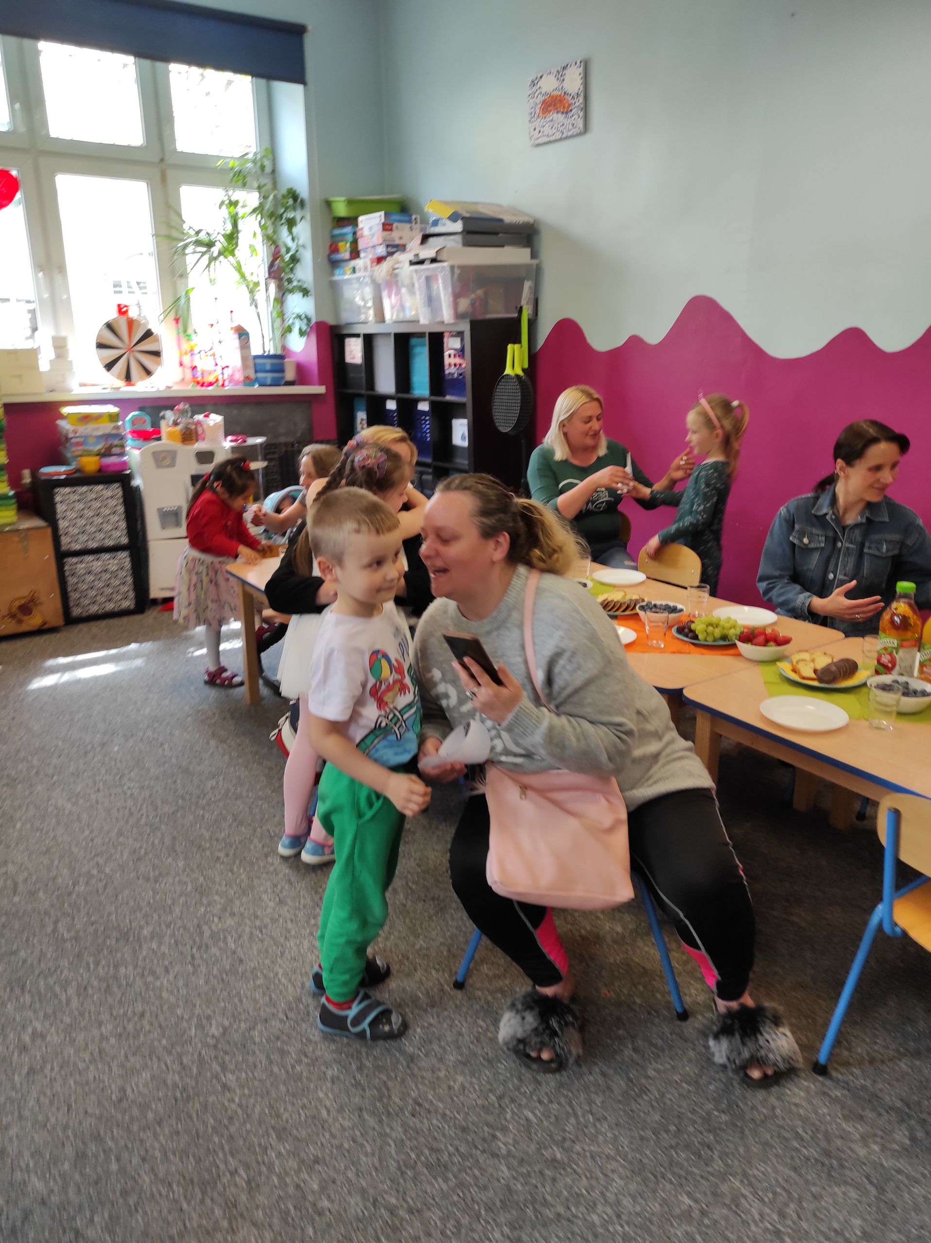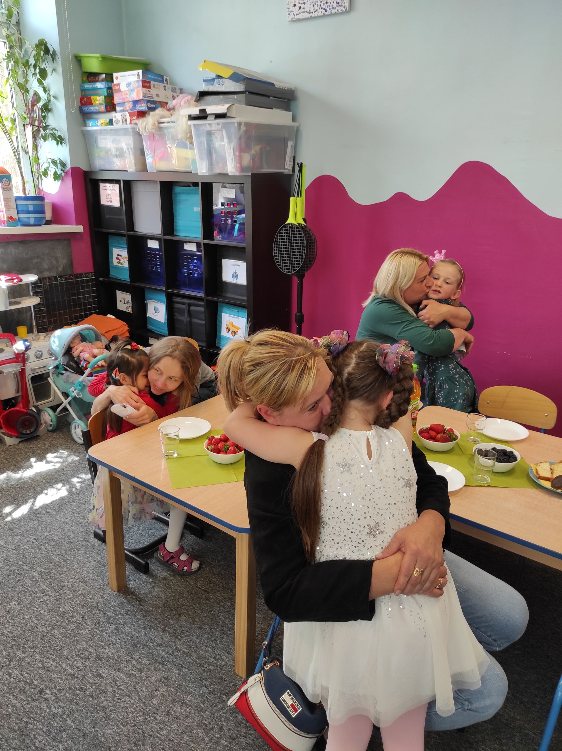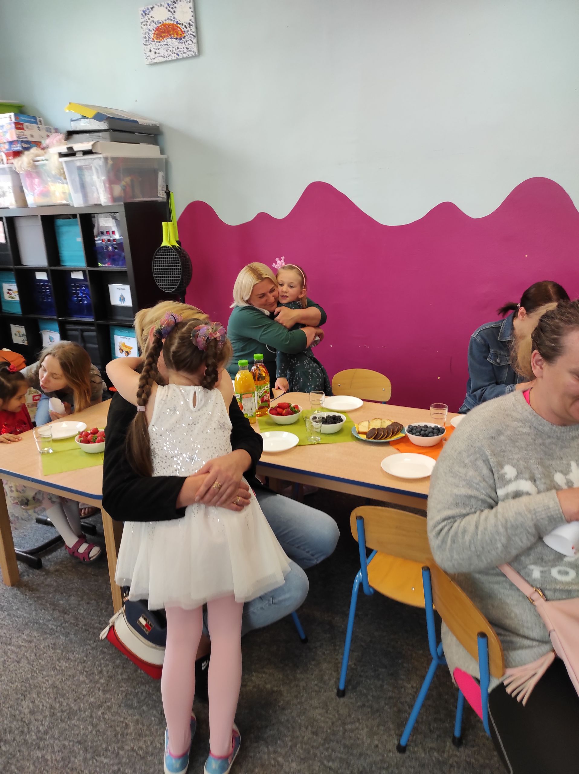 - Dzieci i mamy przytulają się w sali. Siedzą przy stole, na którym stoją talerze z poczęstunkiem.