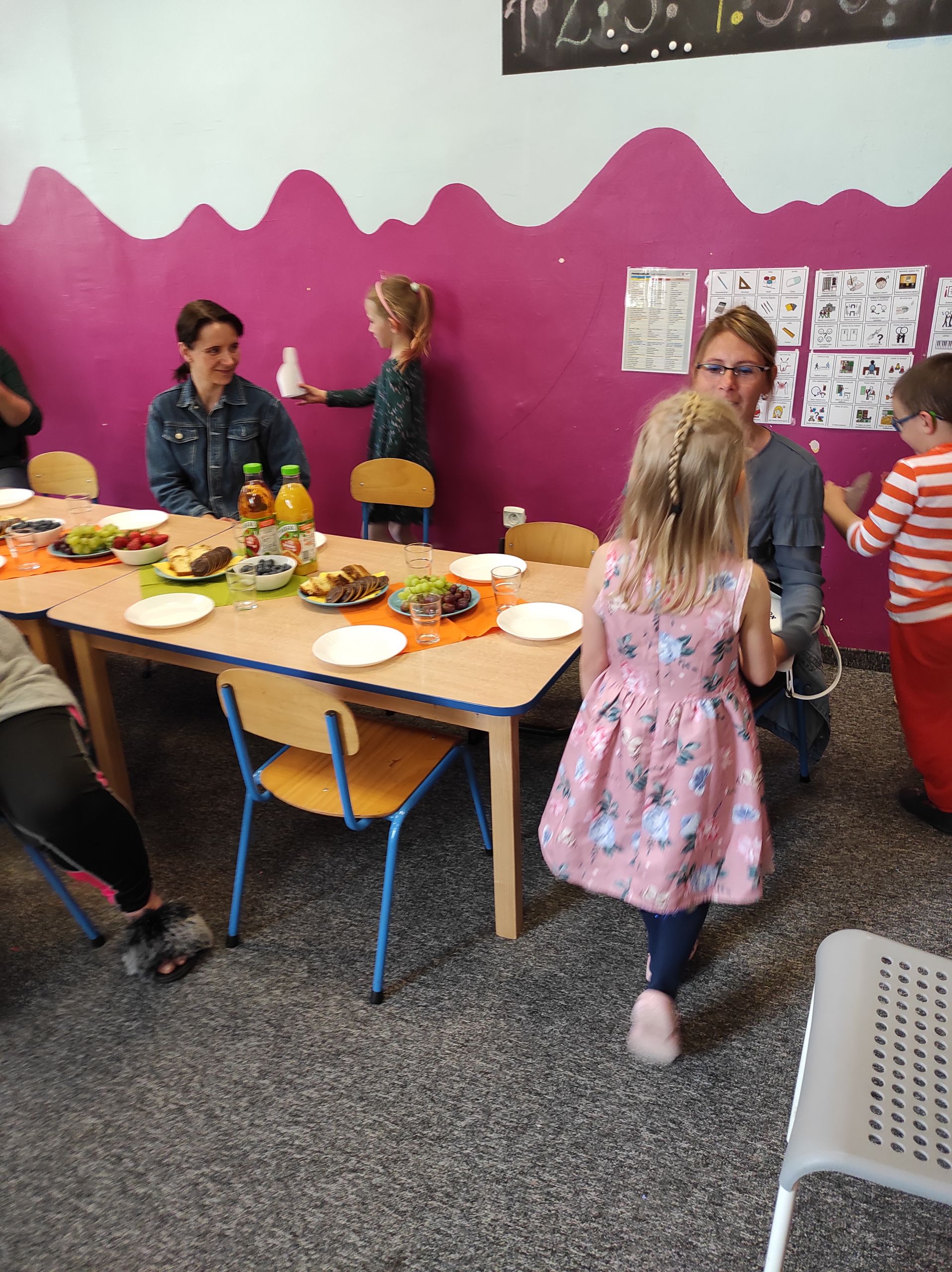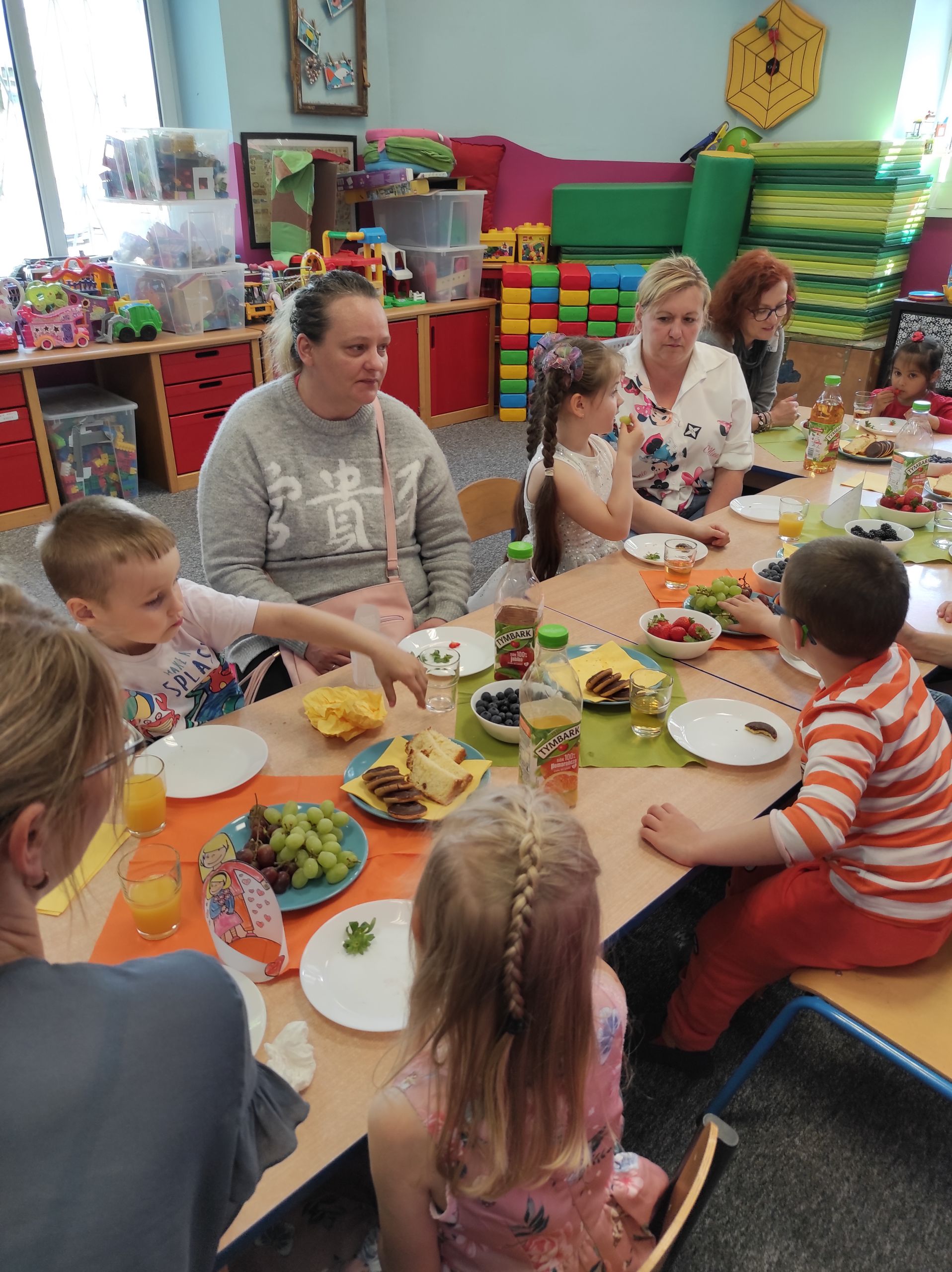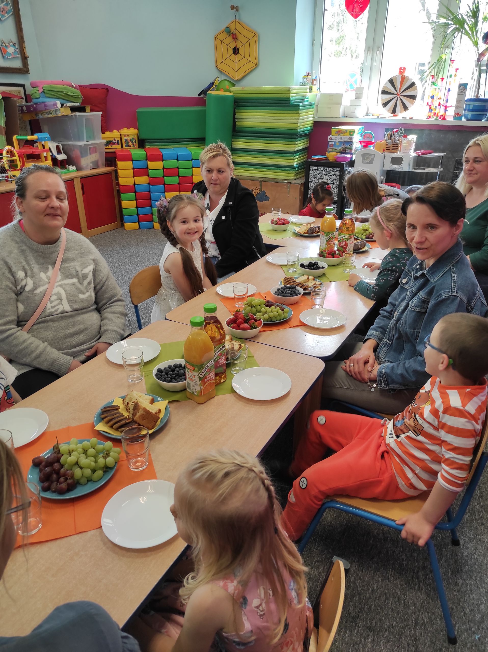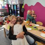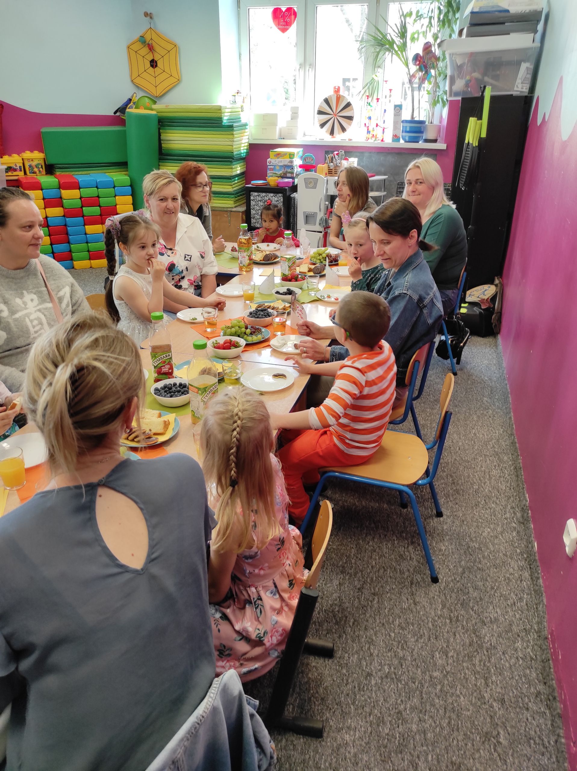 - Dzieci i mamy przytulają się w sali. Siedzą przy stole, na którym stoją talerze z poczęstunkiem.