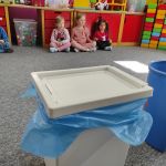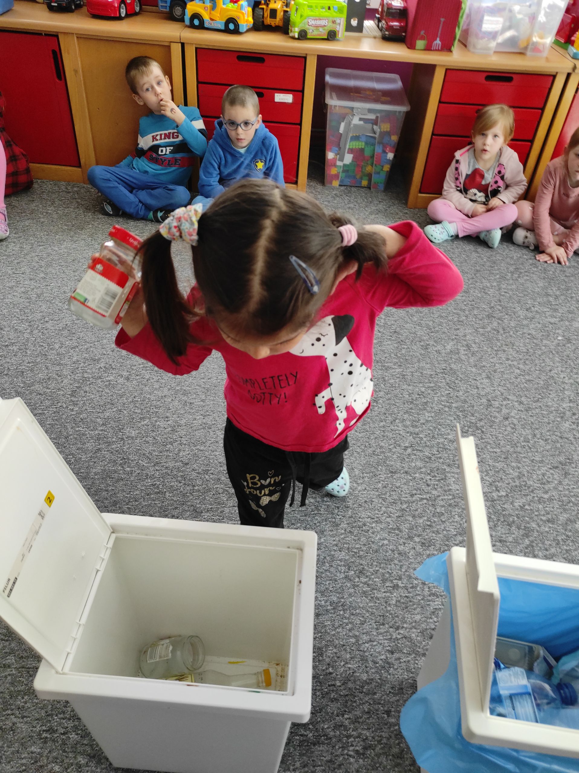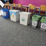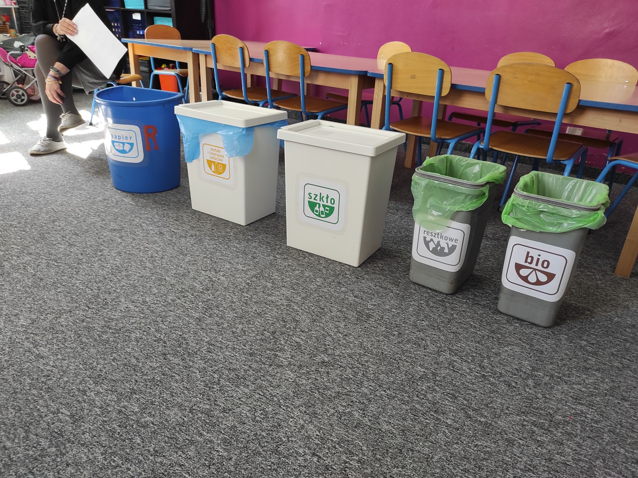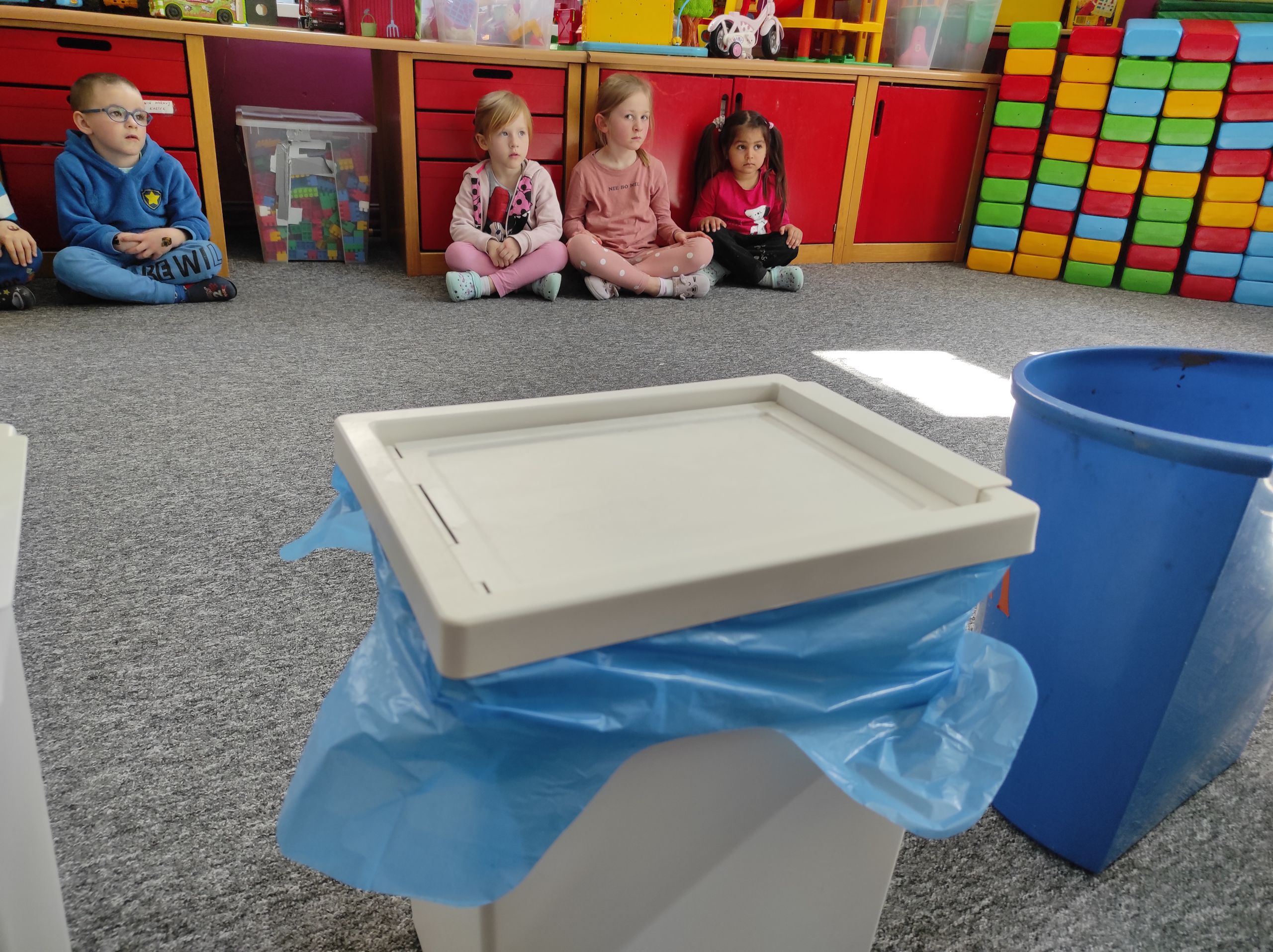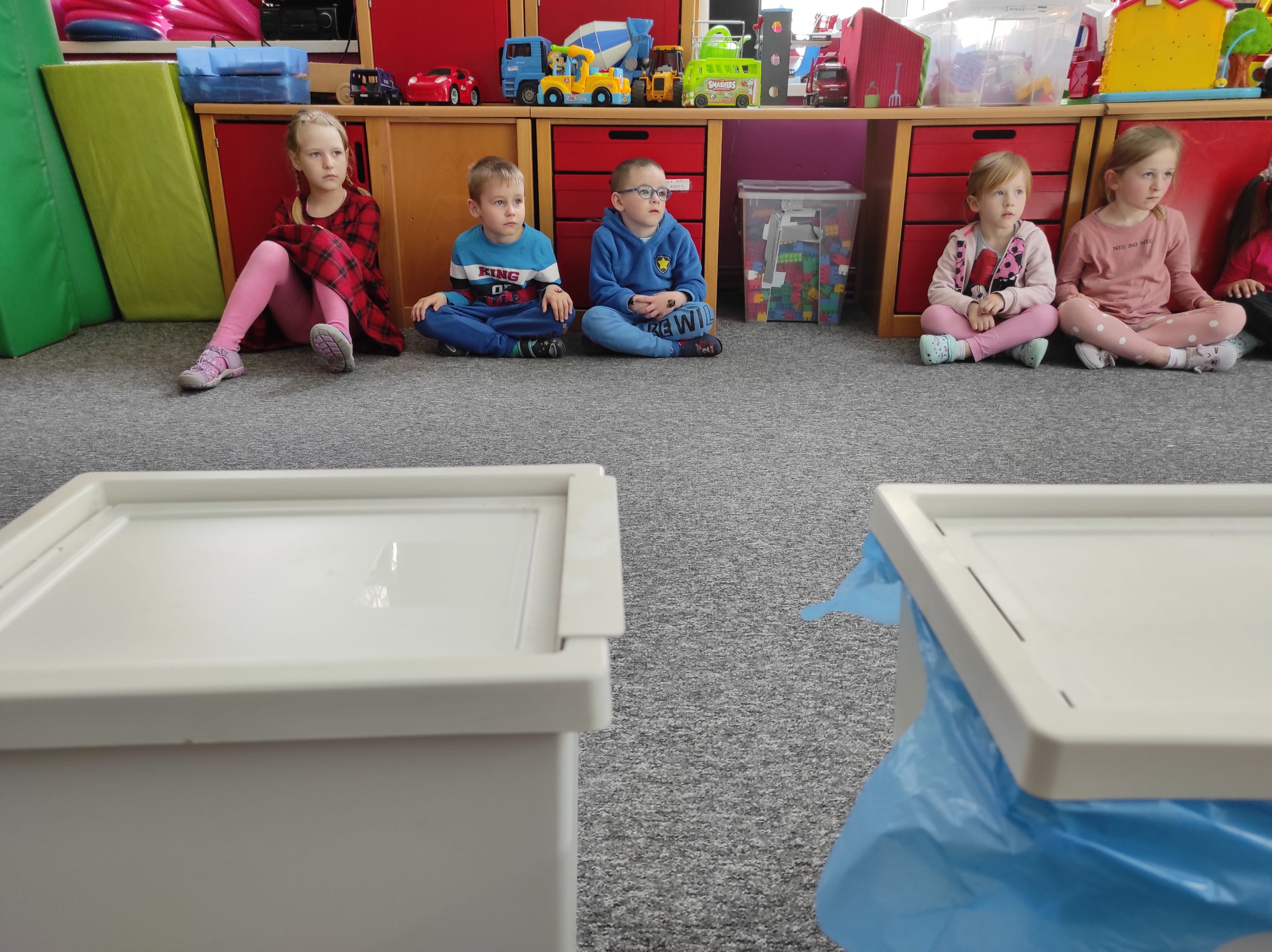 - Dzieci siedzą na podłodze obok szafek. Przed nimi stoją różne kosze do segregacji śmieci.