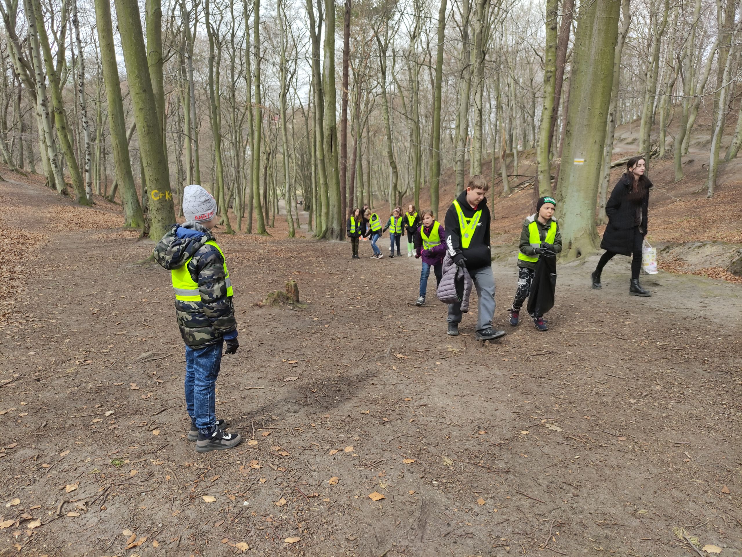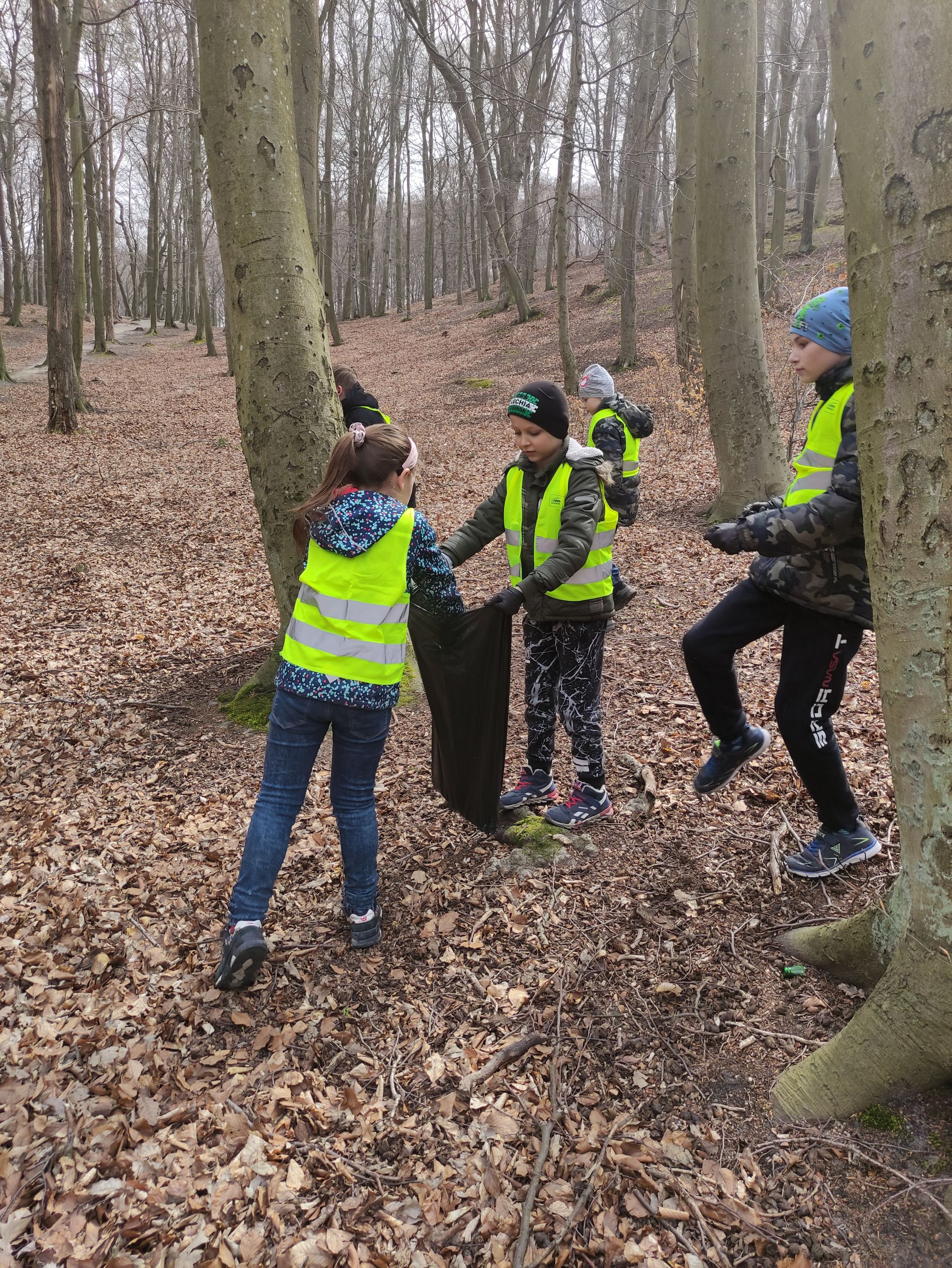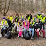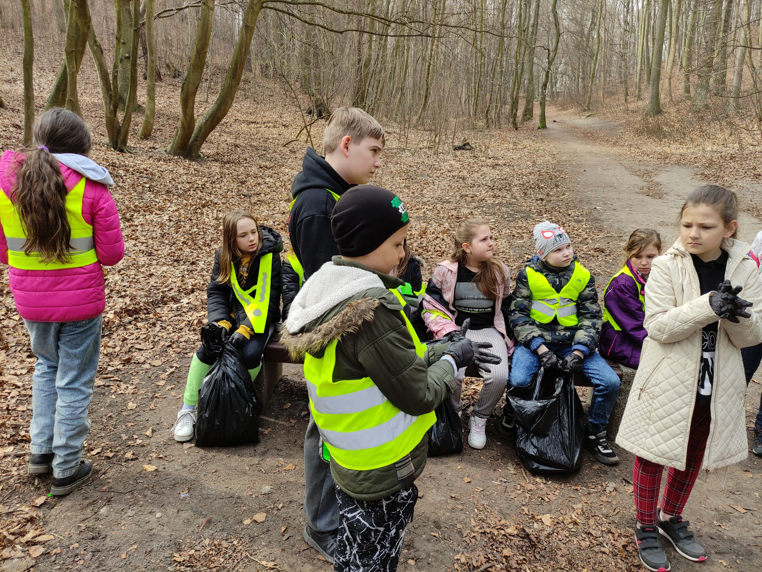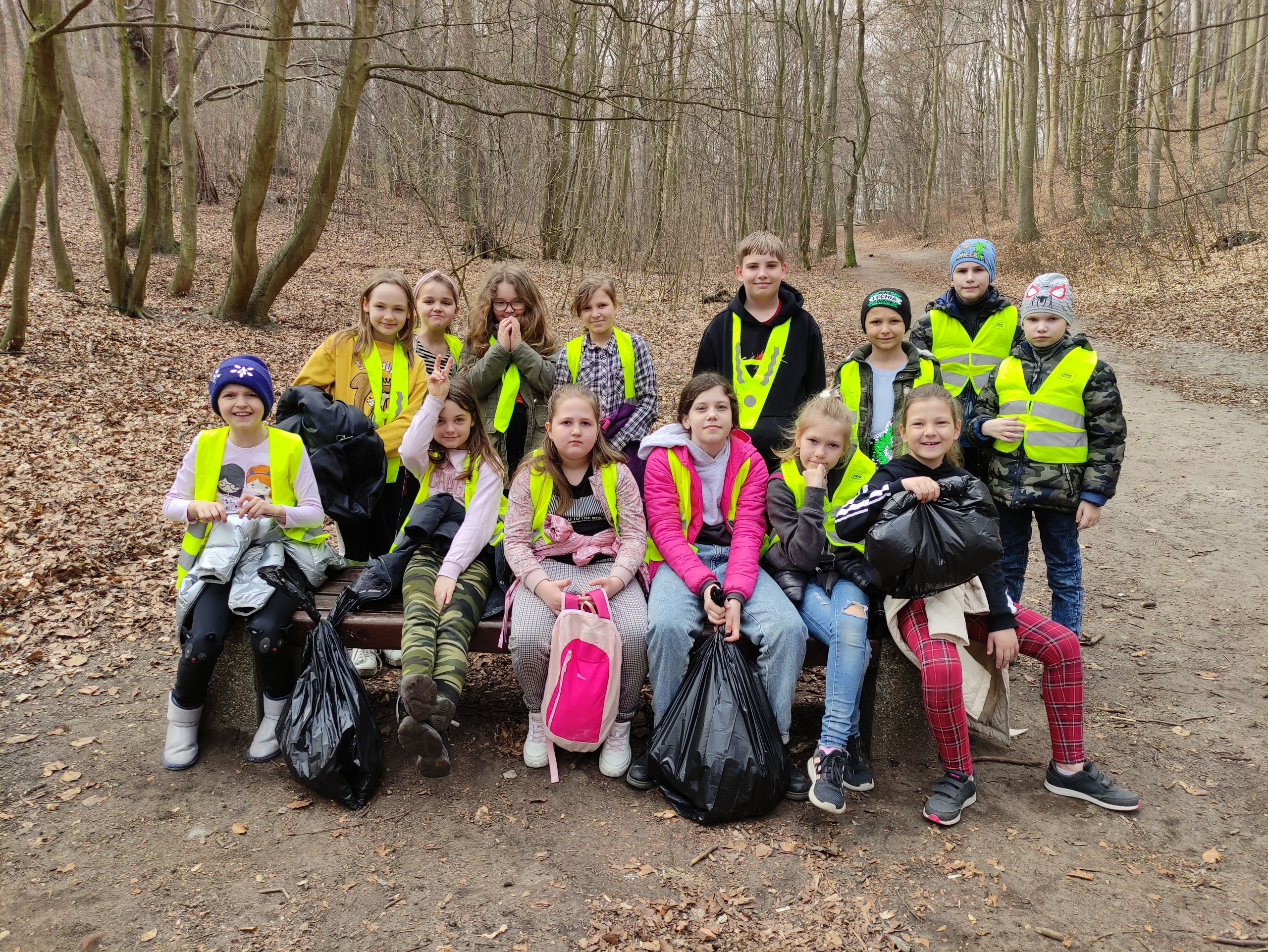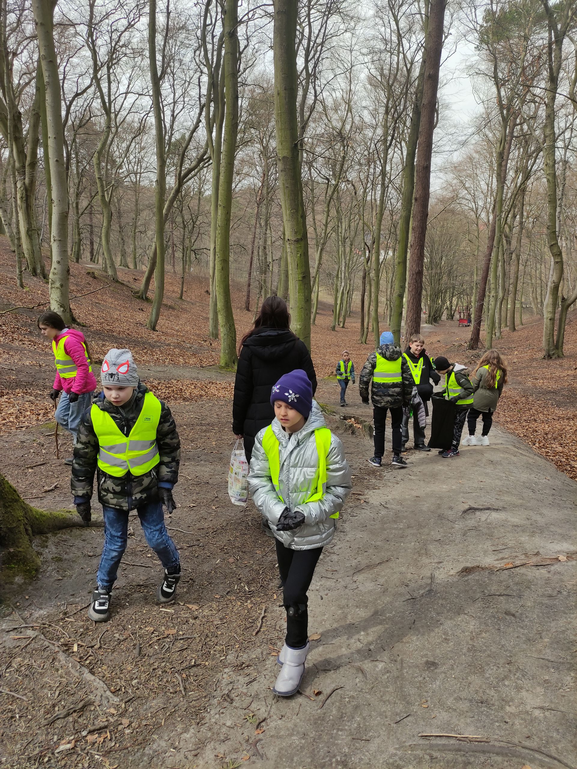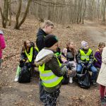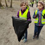 - Grupa dzieci w odblaskowych kamizelkach w lesie. W rękach trzymają worki z zebranymi śmieciami.