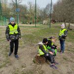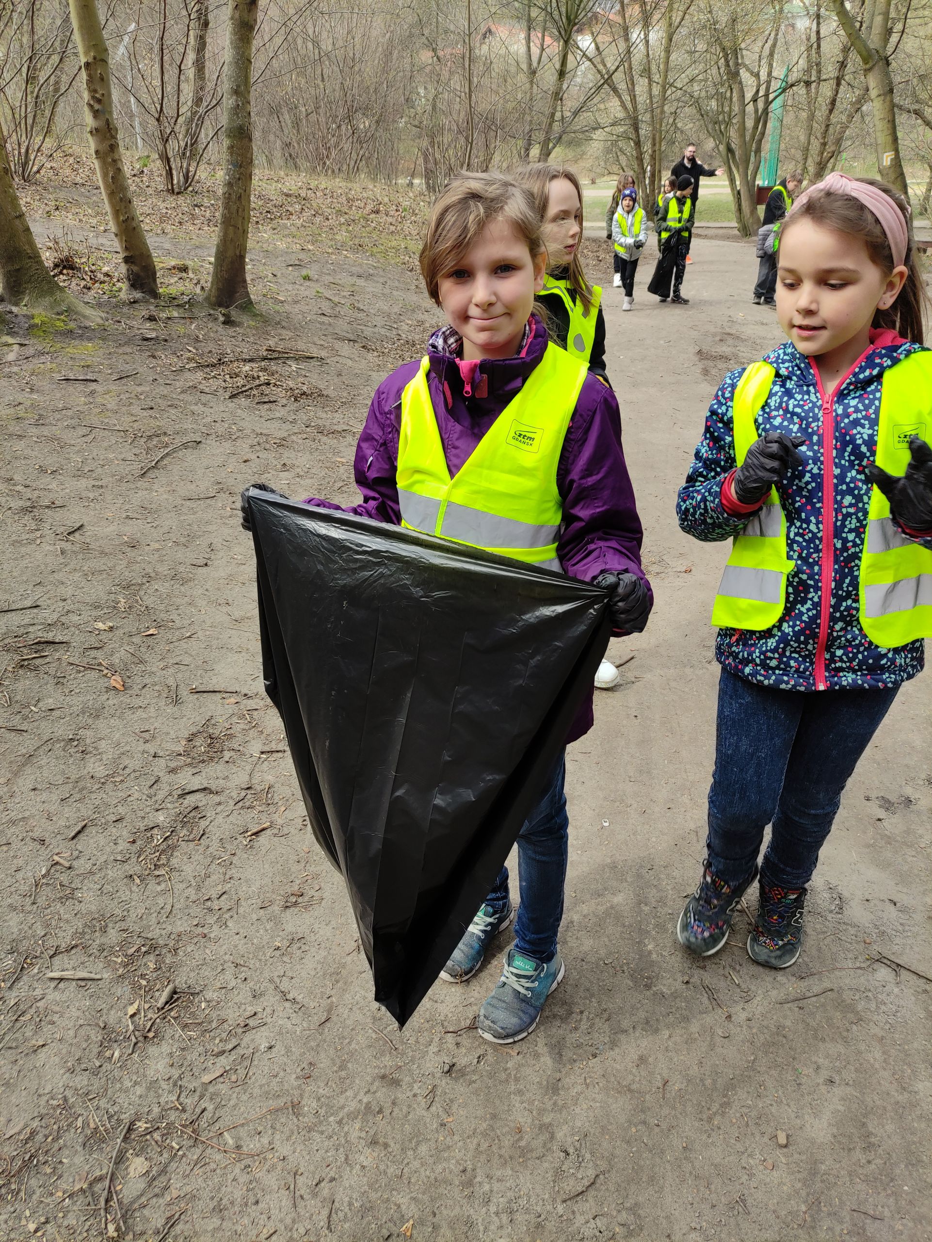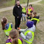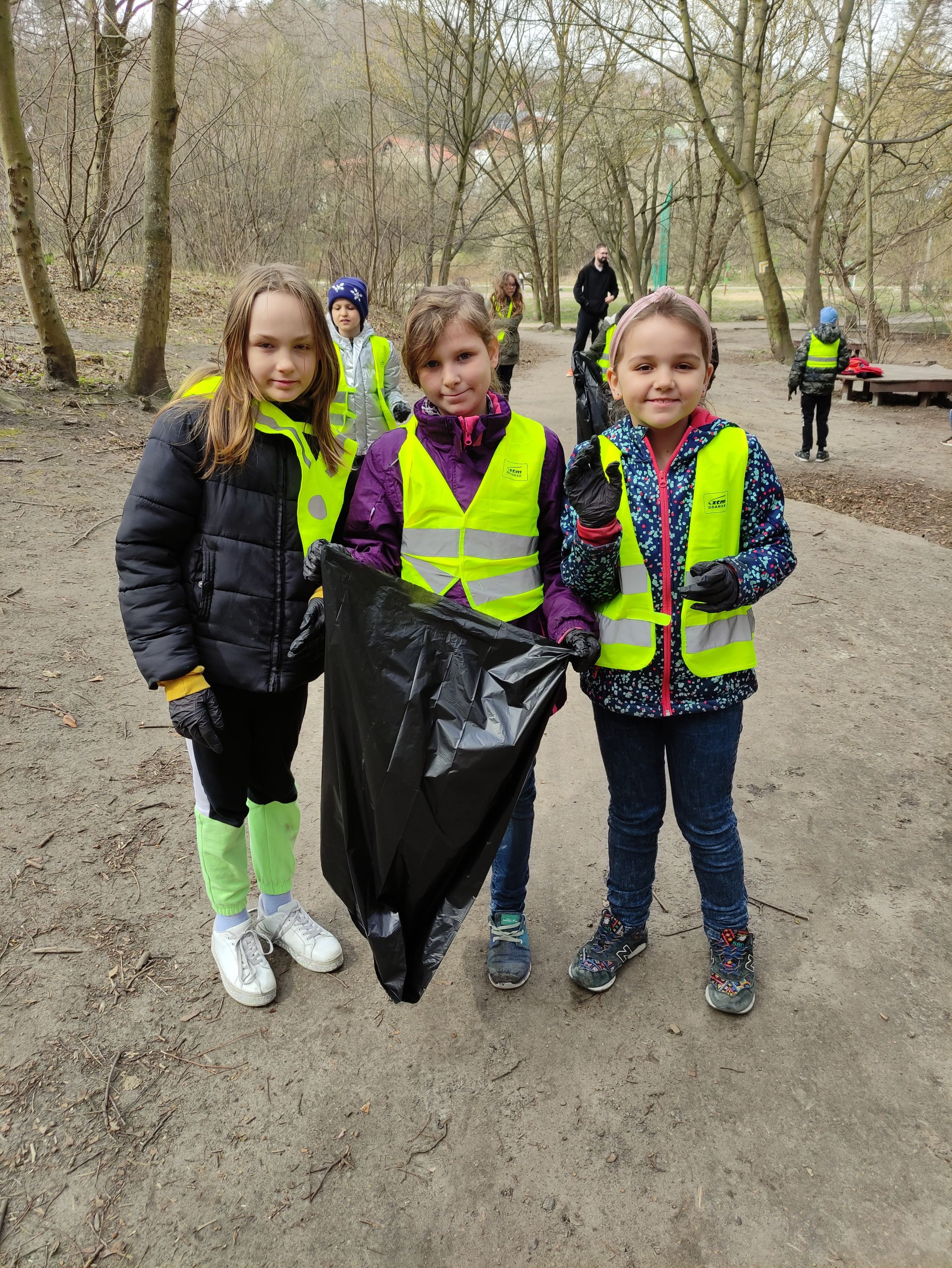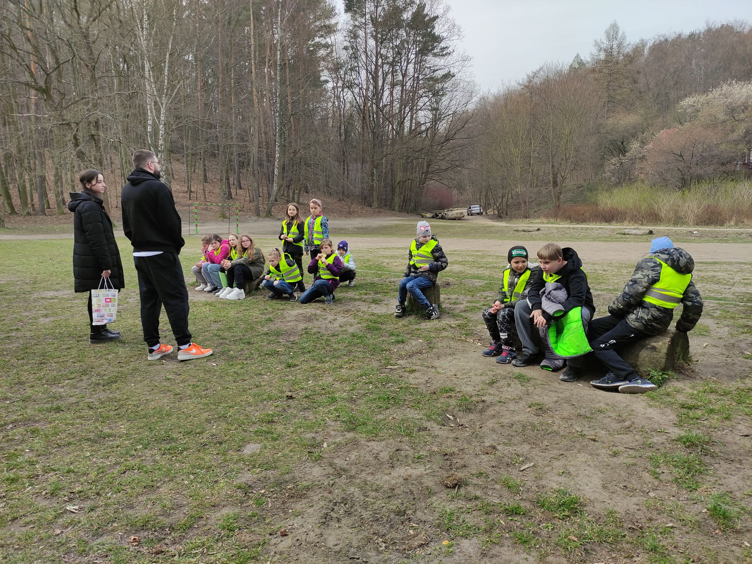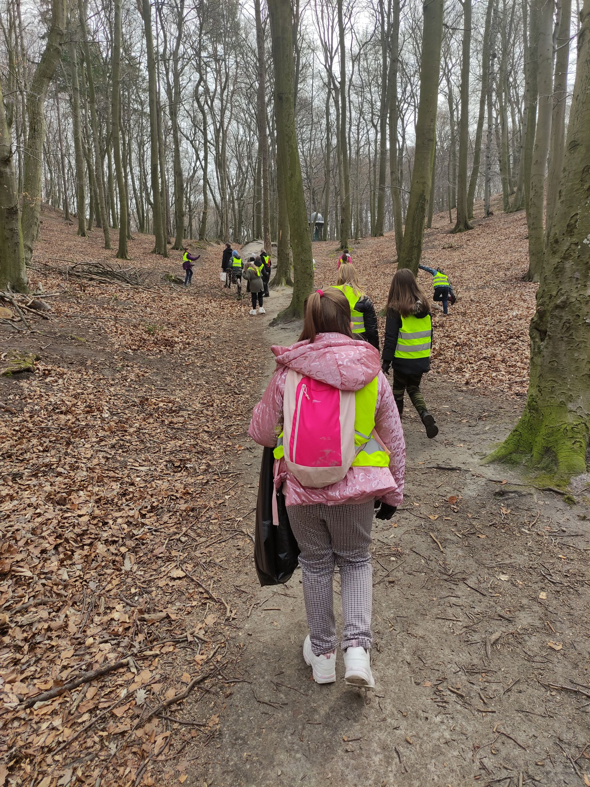 - Grupa dzieci w odblaskowych kamizelkach w lesie. W rękach trzymają worki z zebranymi śmieciami.