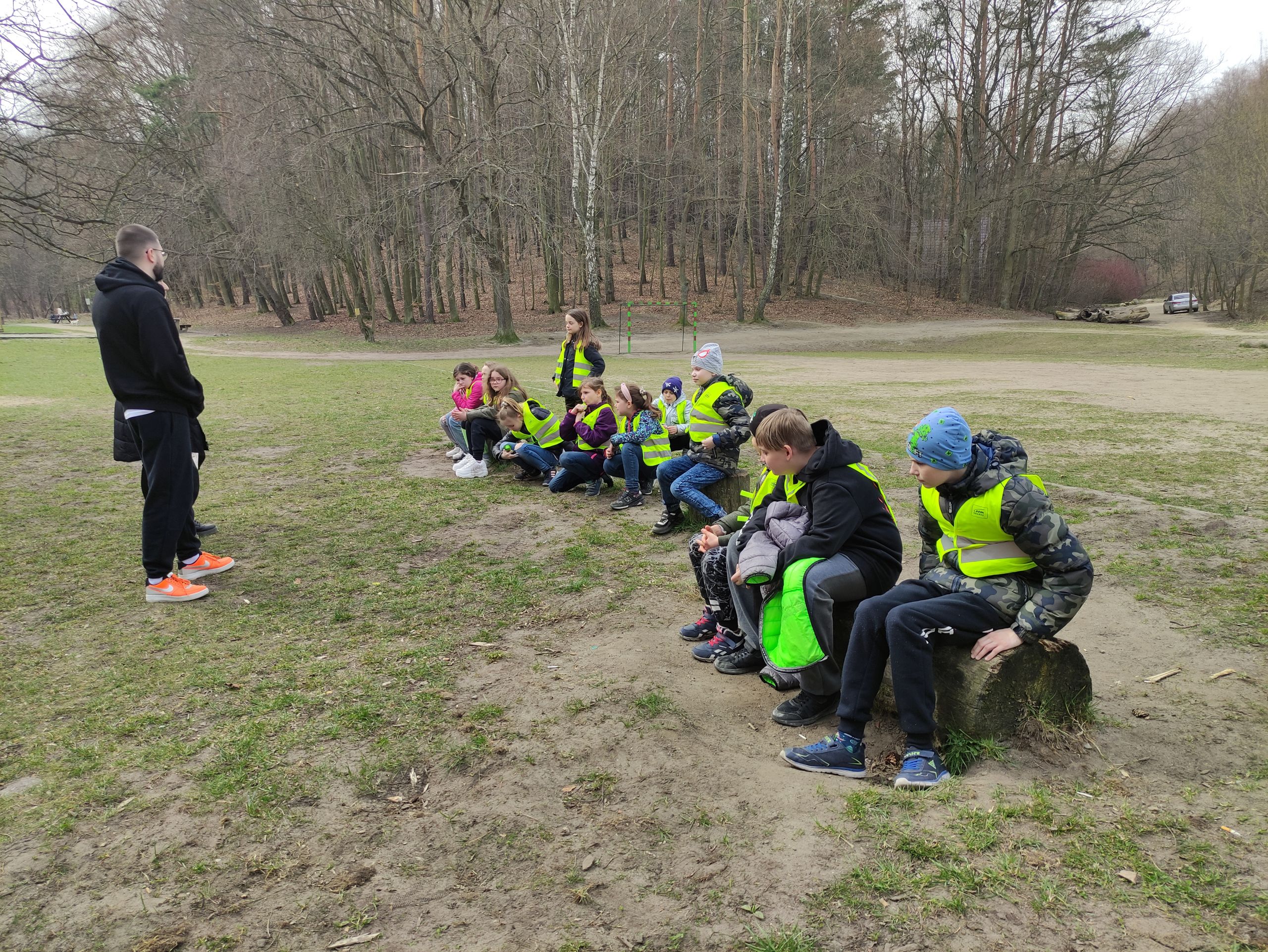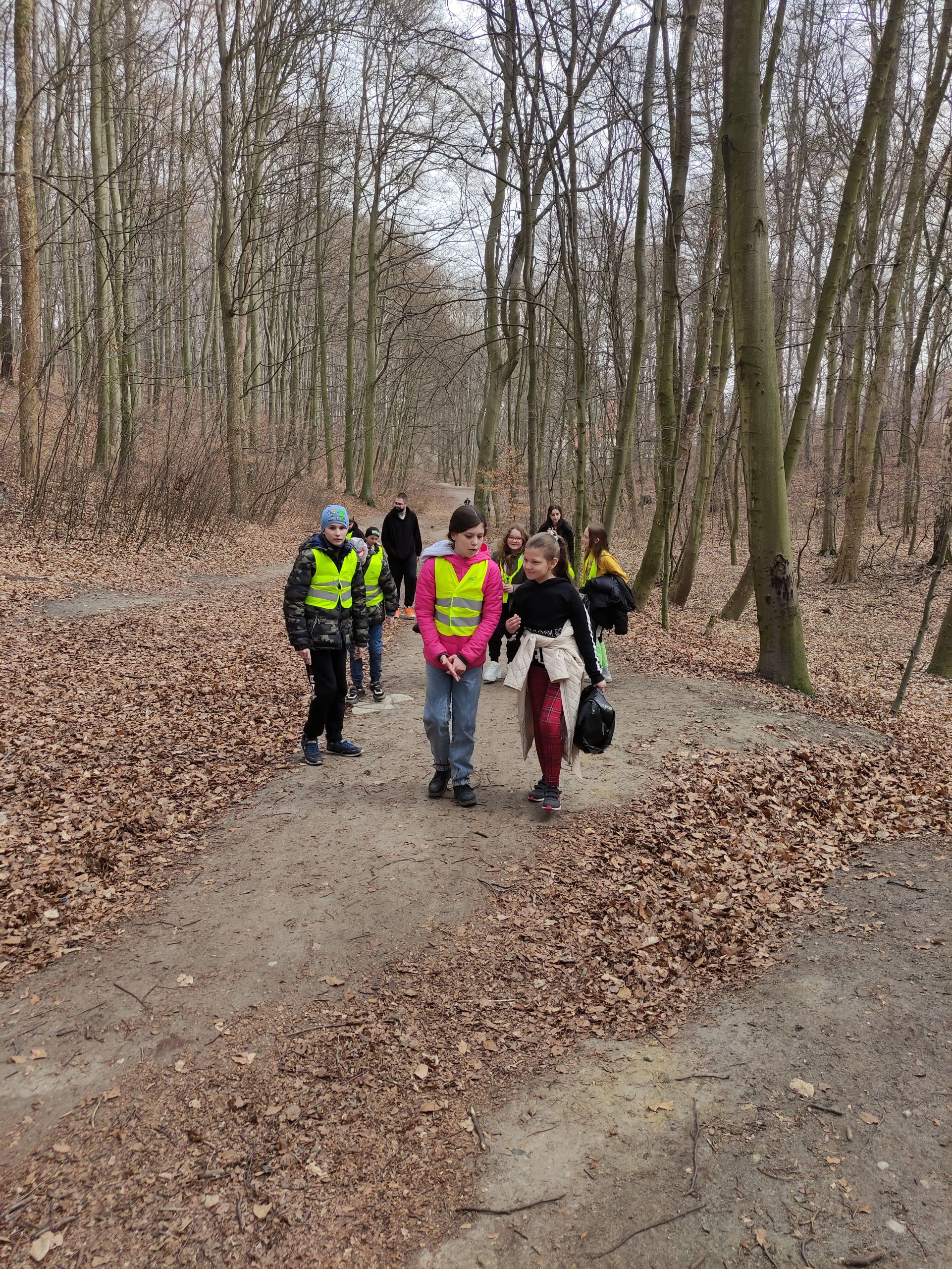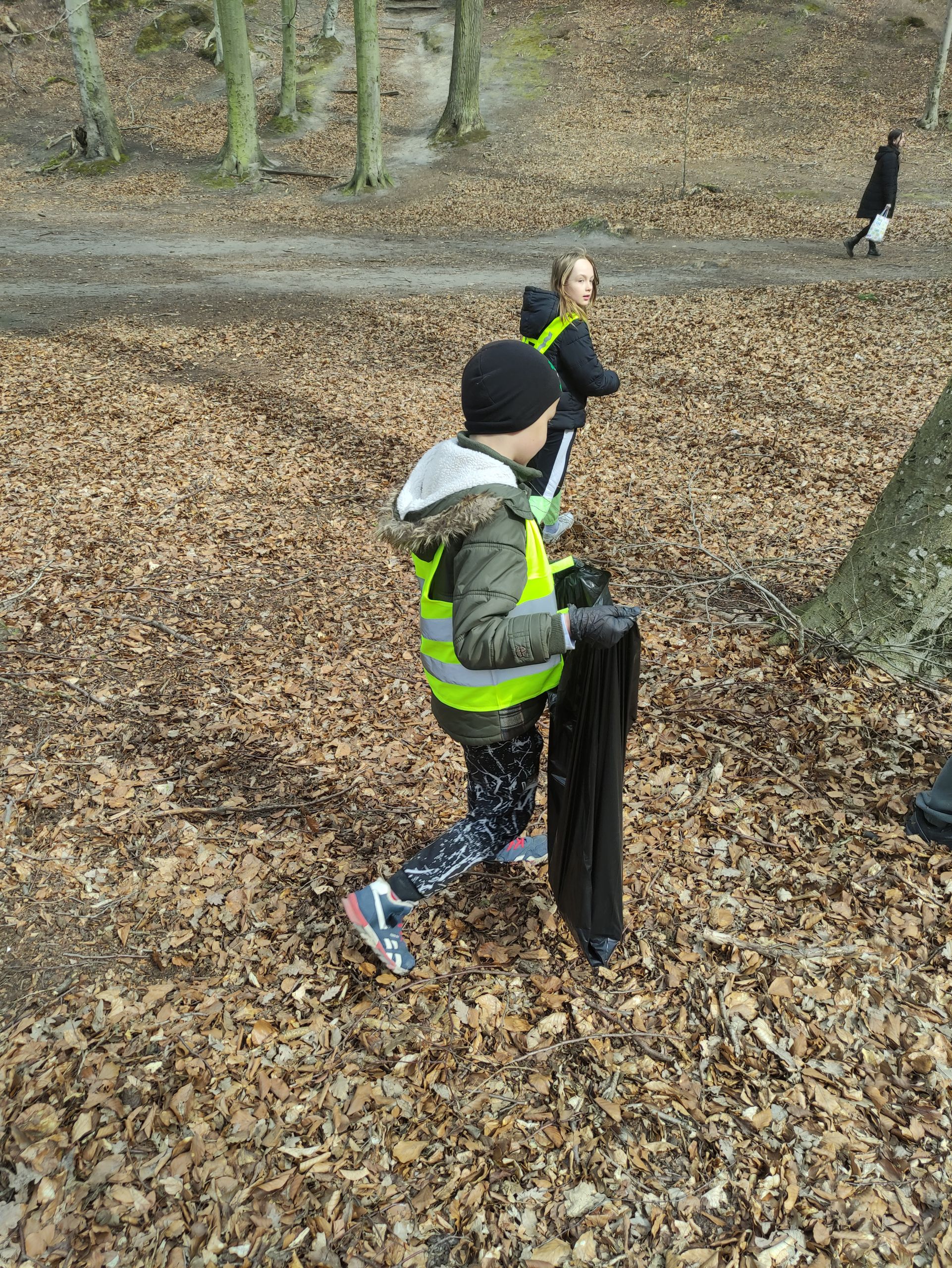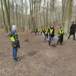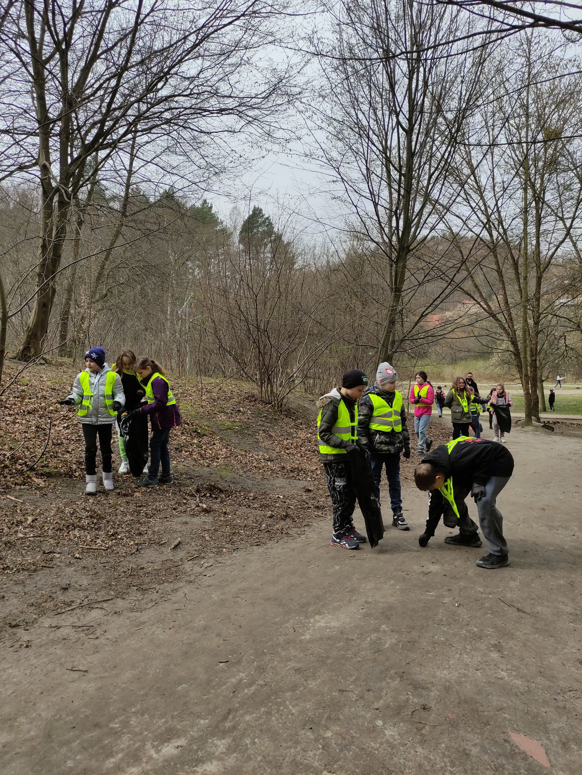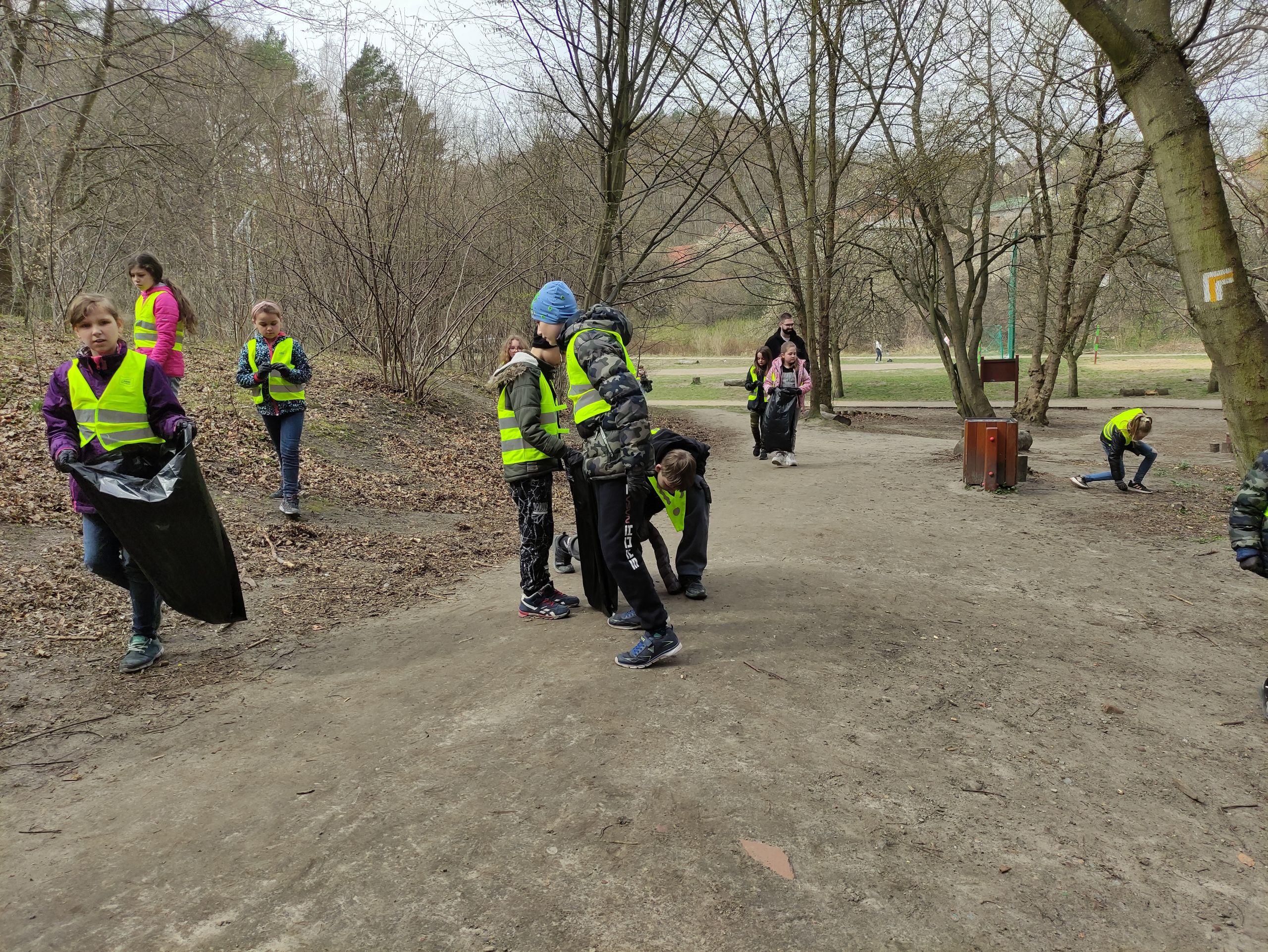 - Grupa dzieci w odblaskowych kamizelkach w lesie. W rękach trzymają worki z zebranymi śmieciami.