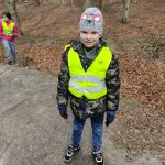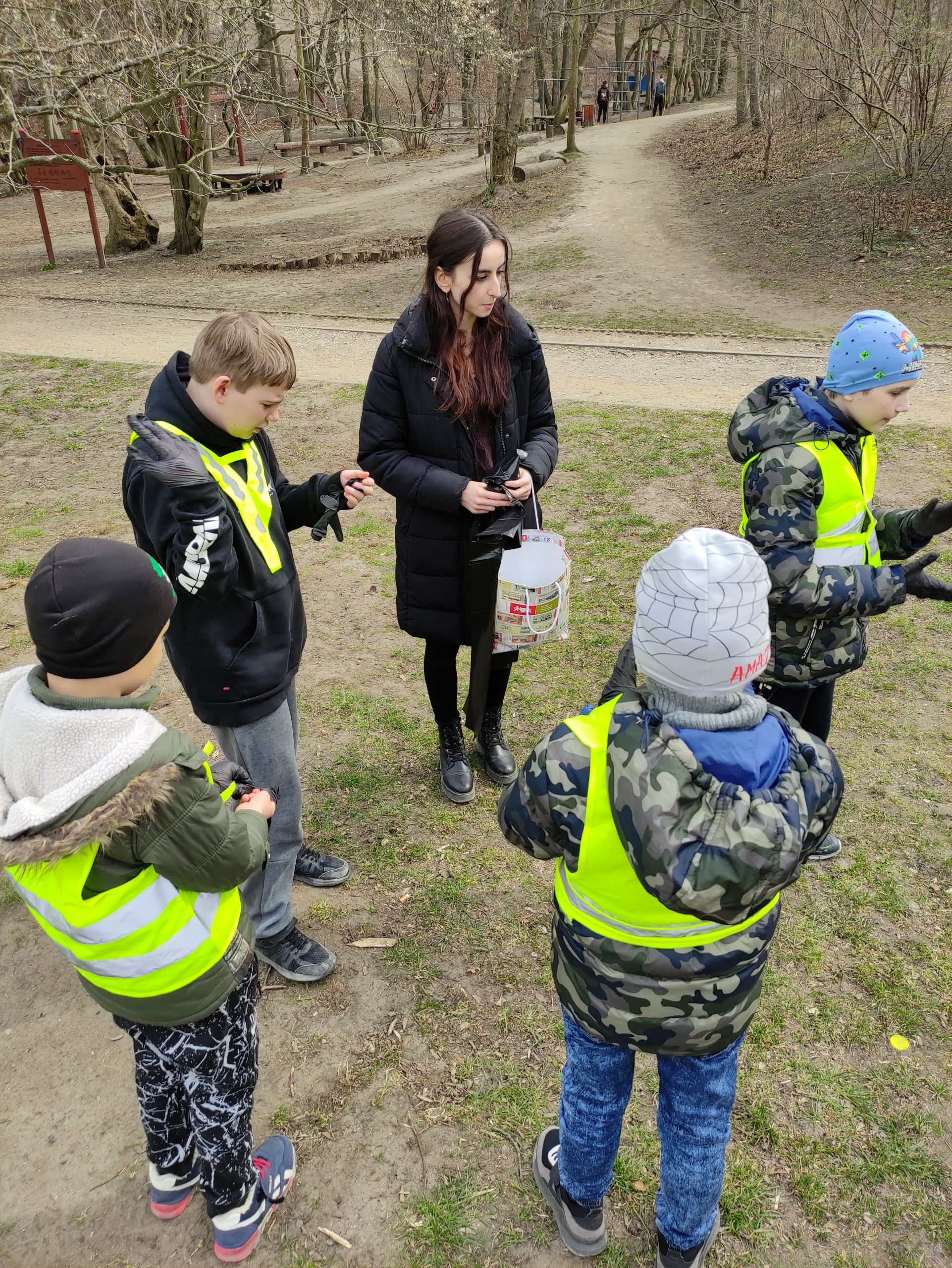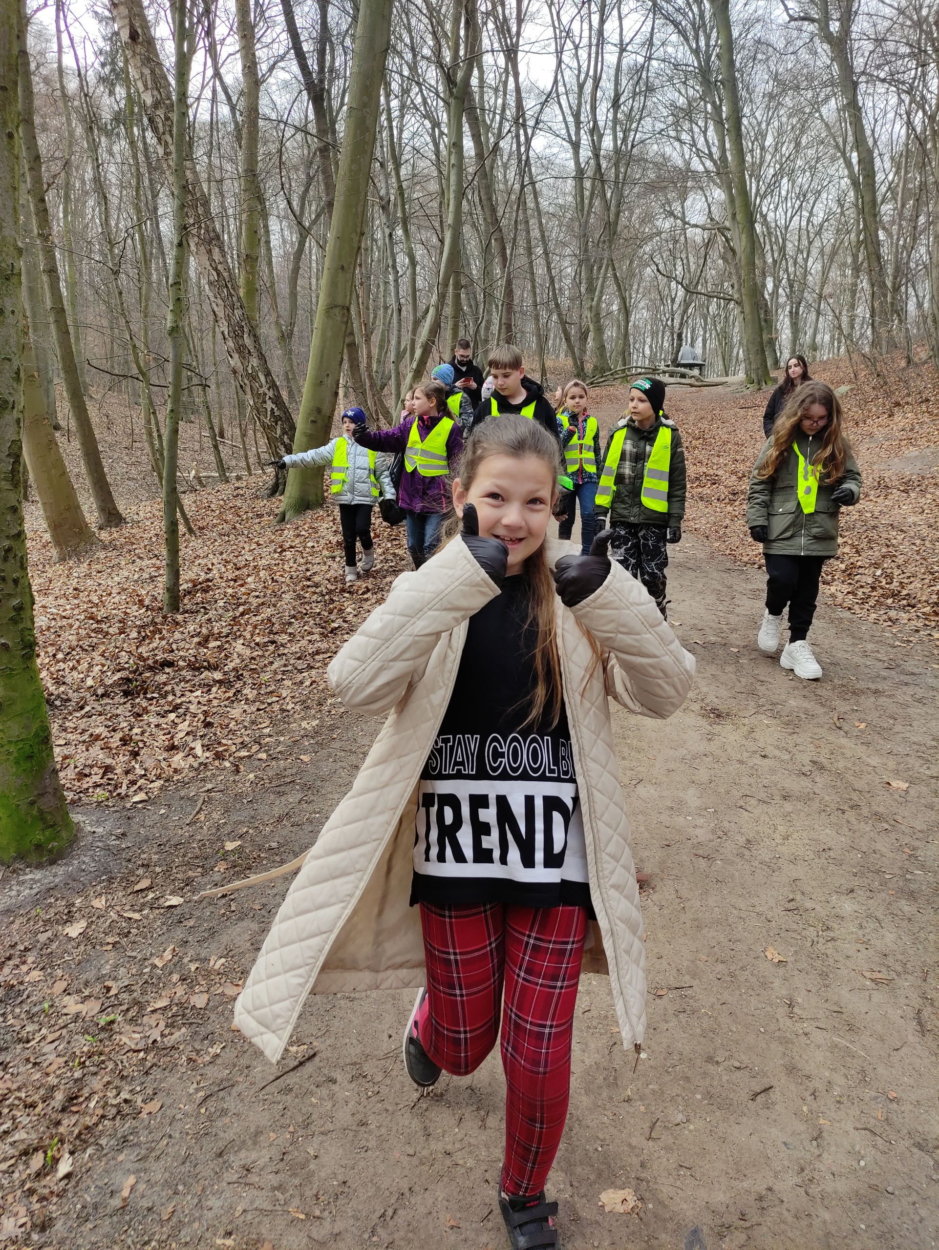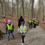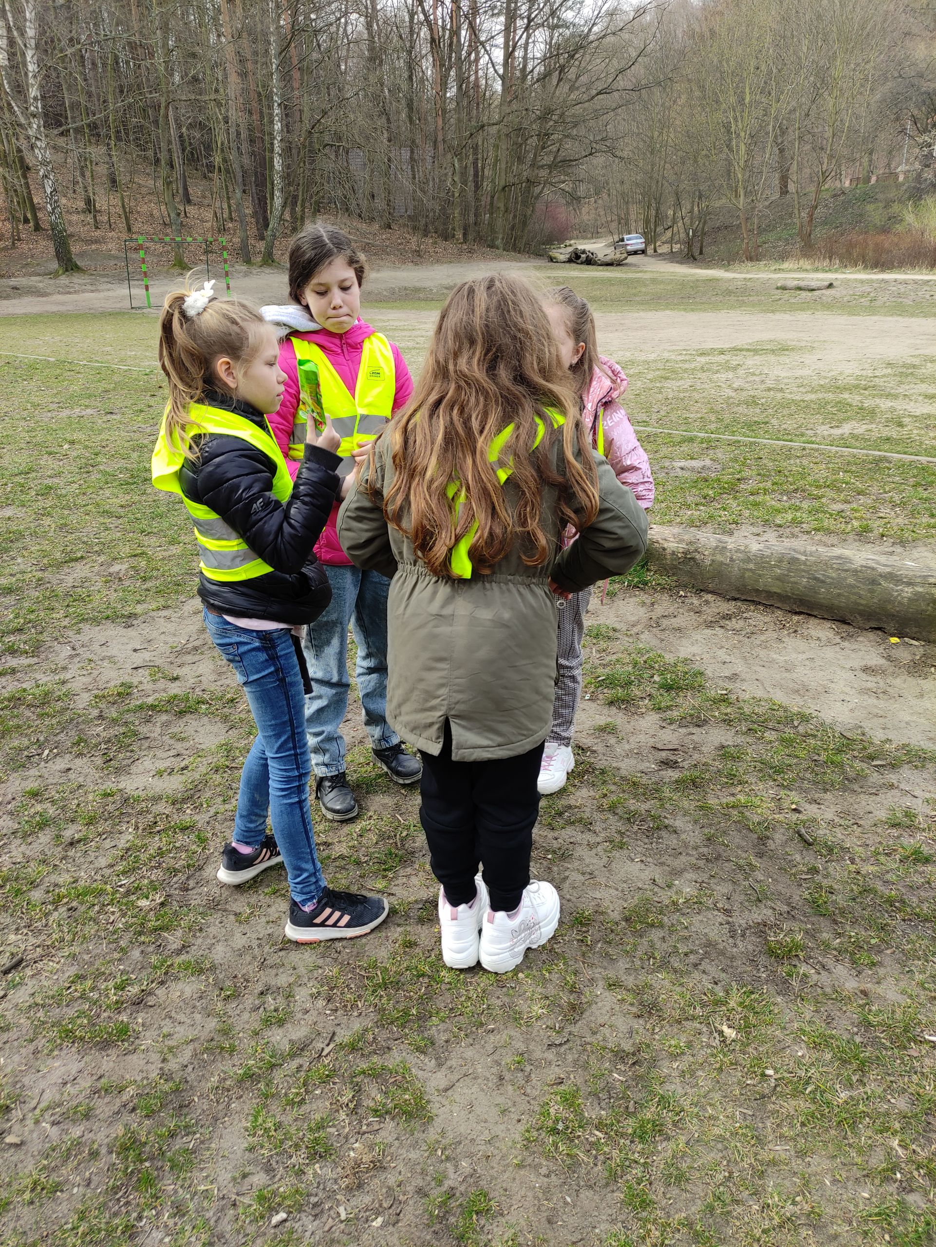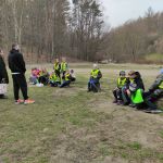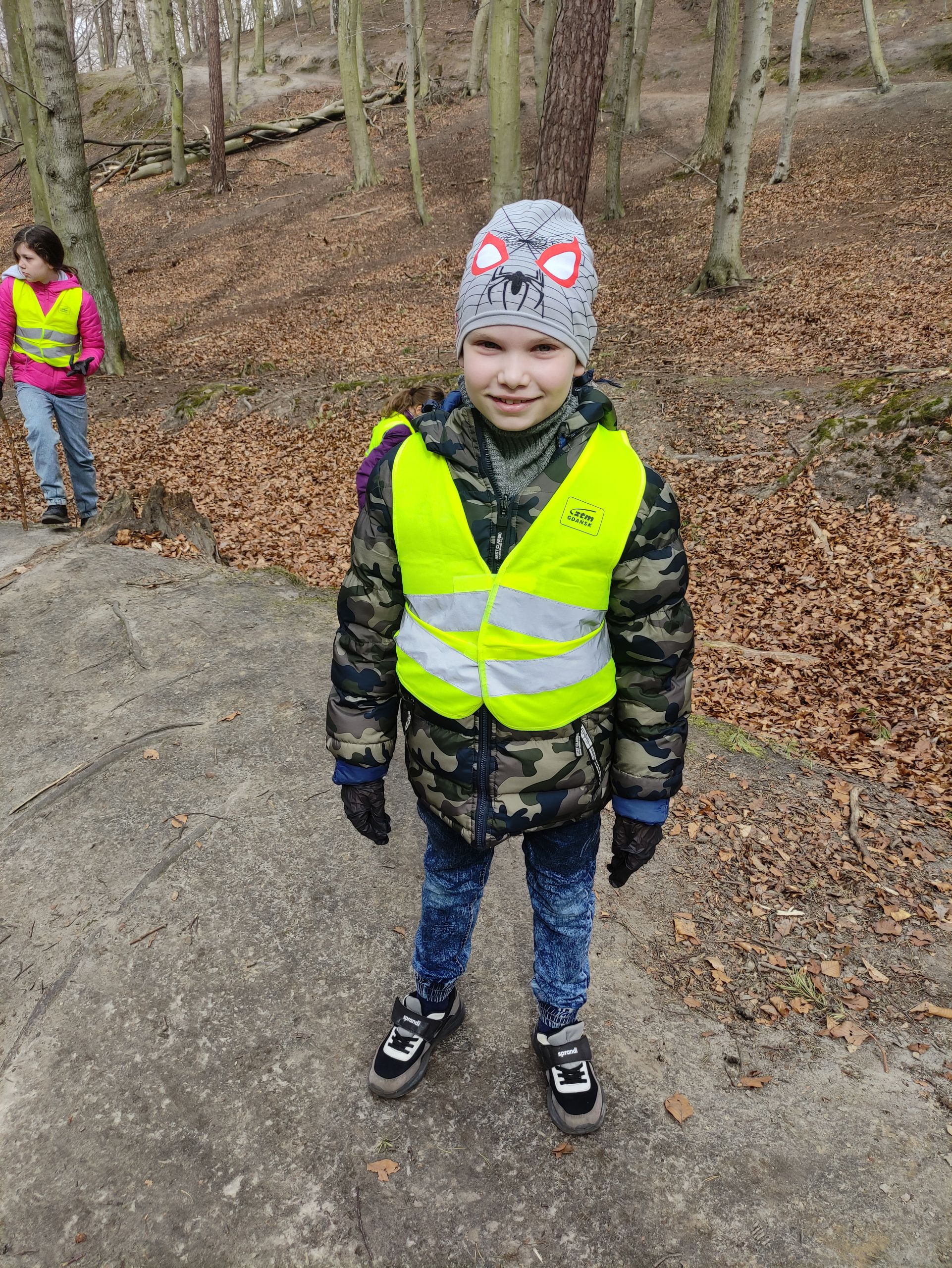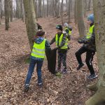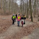 - Grupa dzieci w odblaskowych kamizelkach w lesie. W rękach trzymają worki z zebranymi śmieciami.