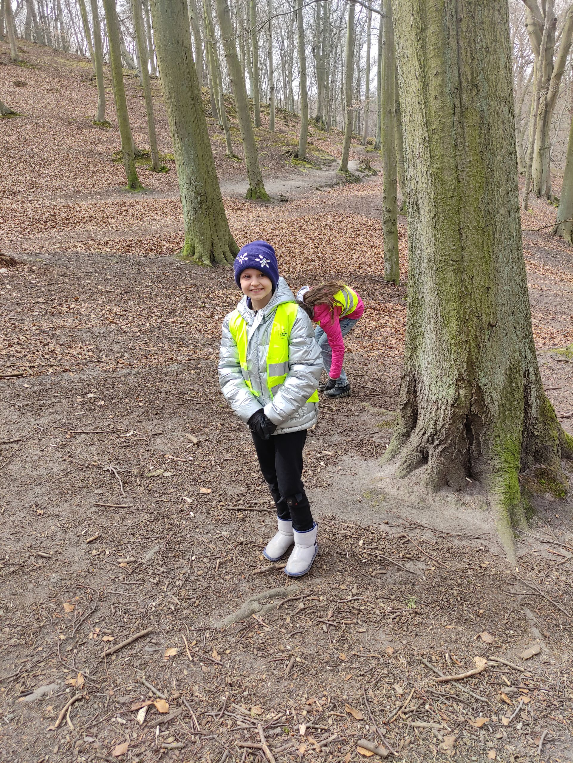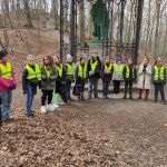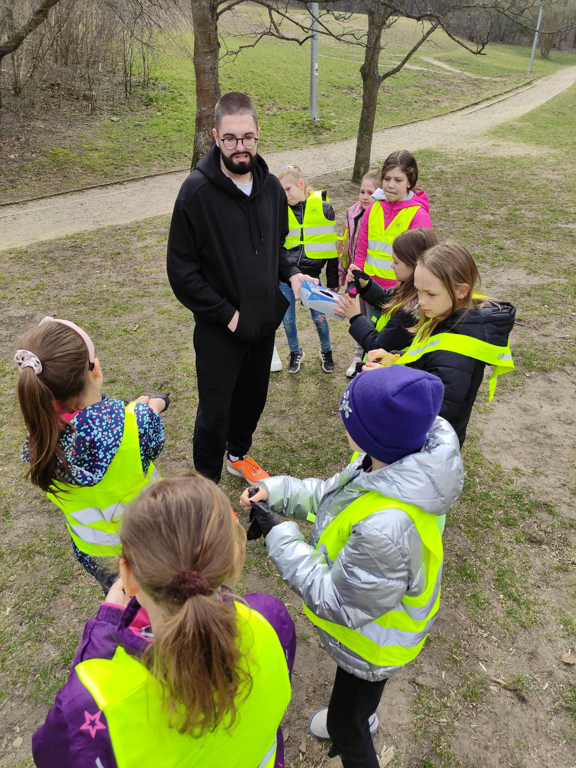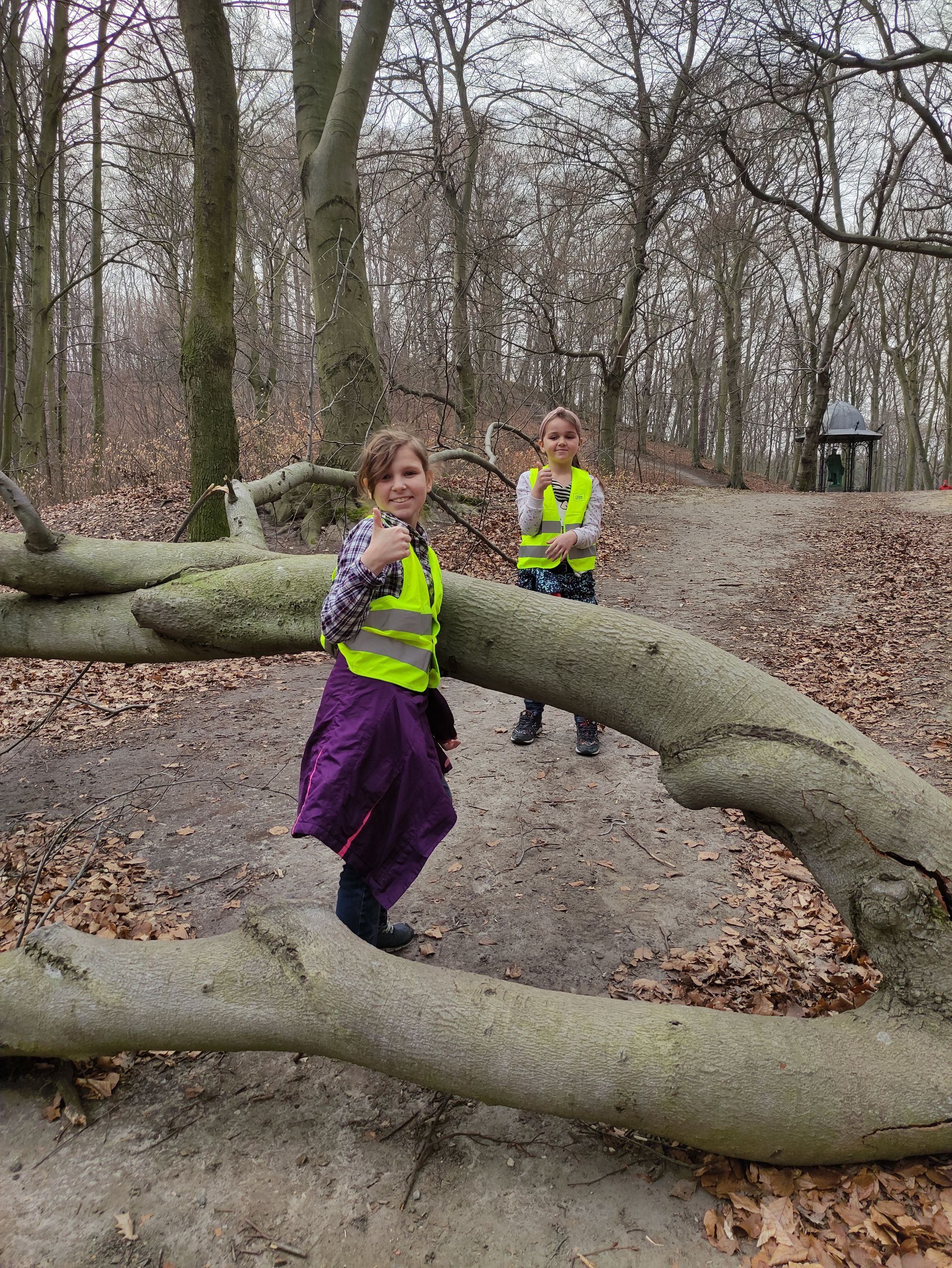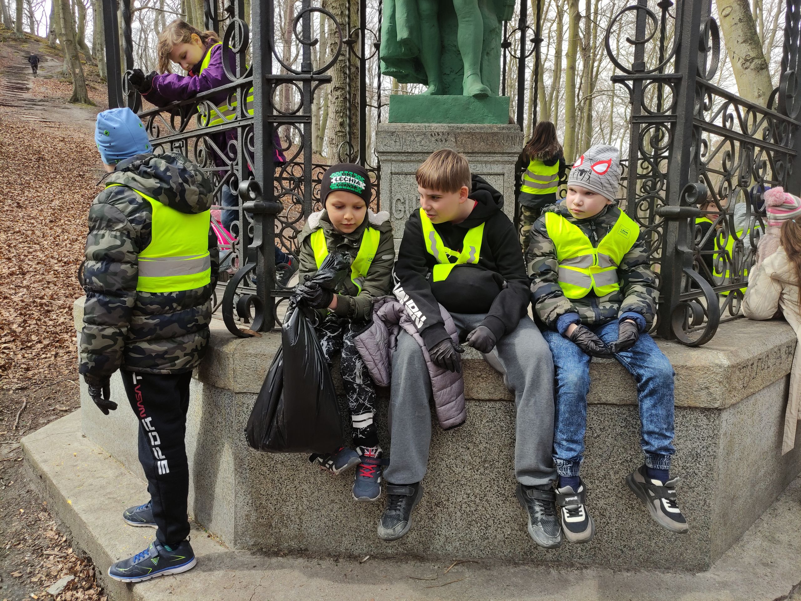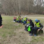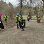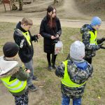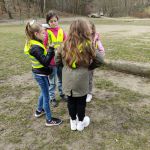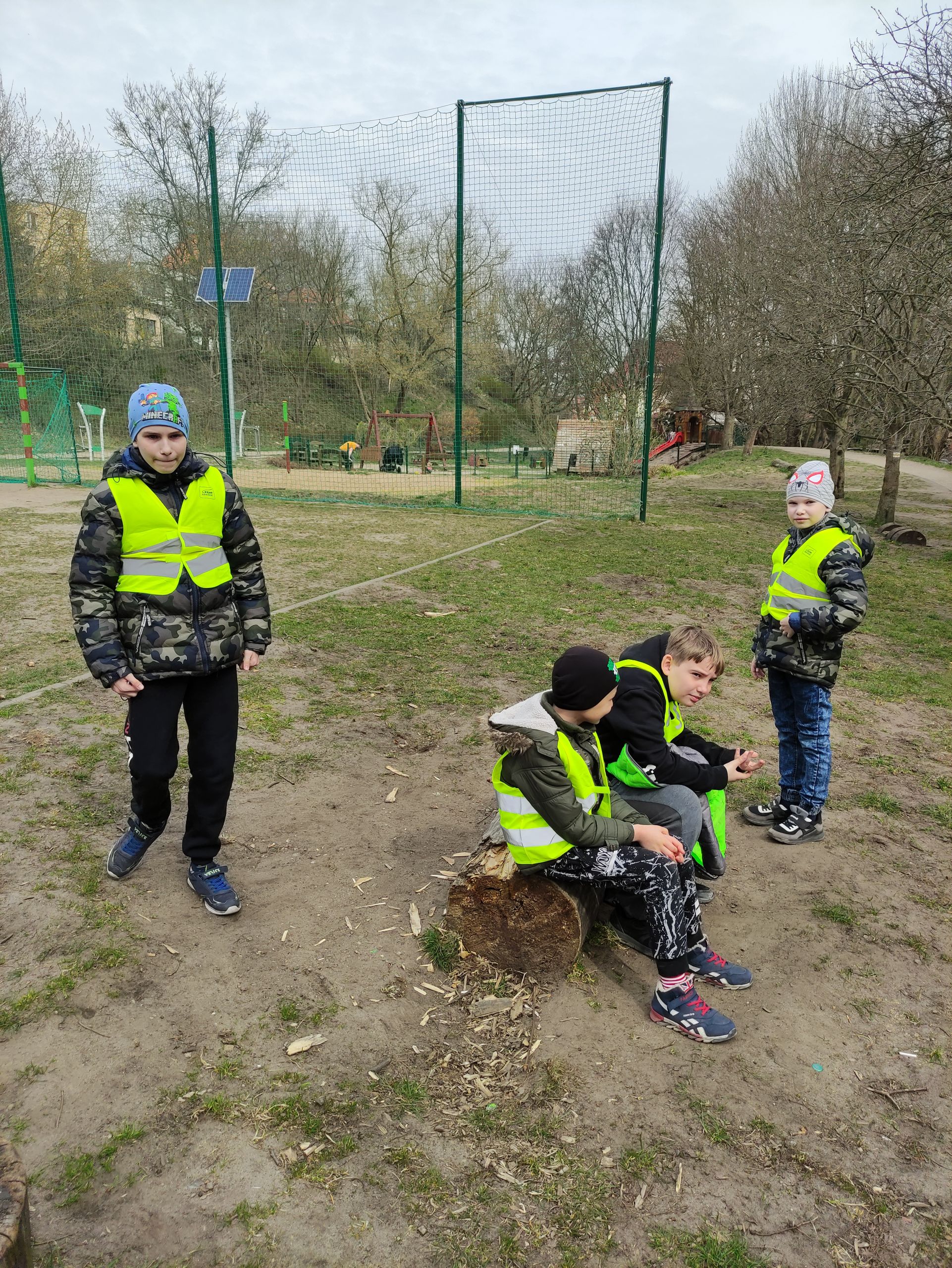 - Grupa dzieci w odblaskowych kamizelkach w lesie. W rękach trzymają worki z zebranymi śmieciami.
